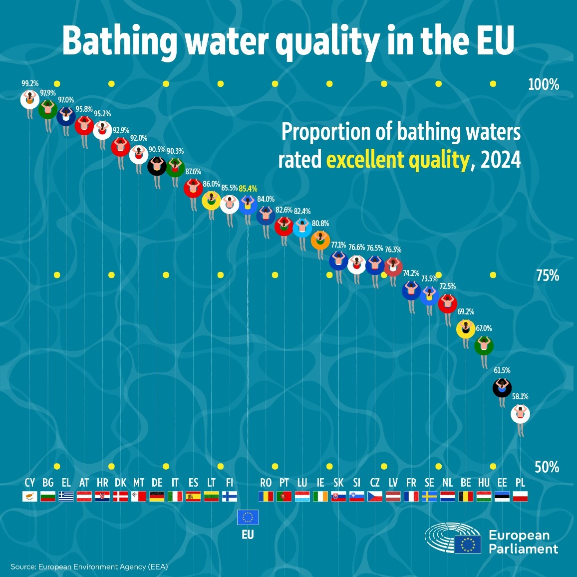 In 2024, more than 85% of nearly 22,000 monitored bathing sites across the EU were rated as “excellent,” while 96% met at least the minimum safety standards. This indicates that the majority of swimming areas are free from pollutants that could pose risks to human health or the environment.