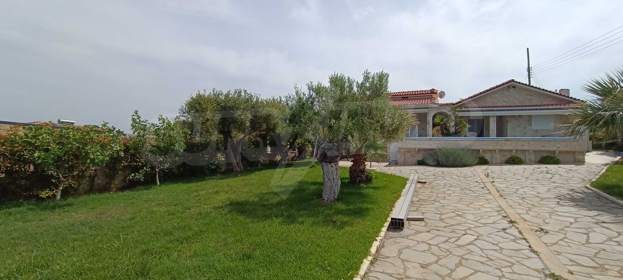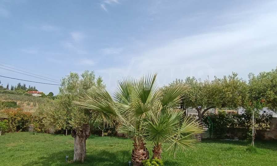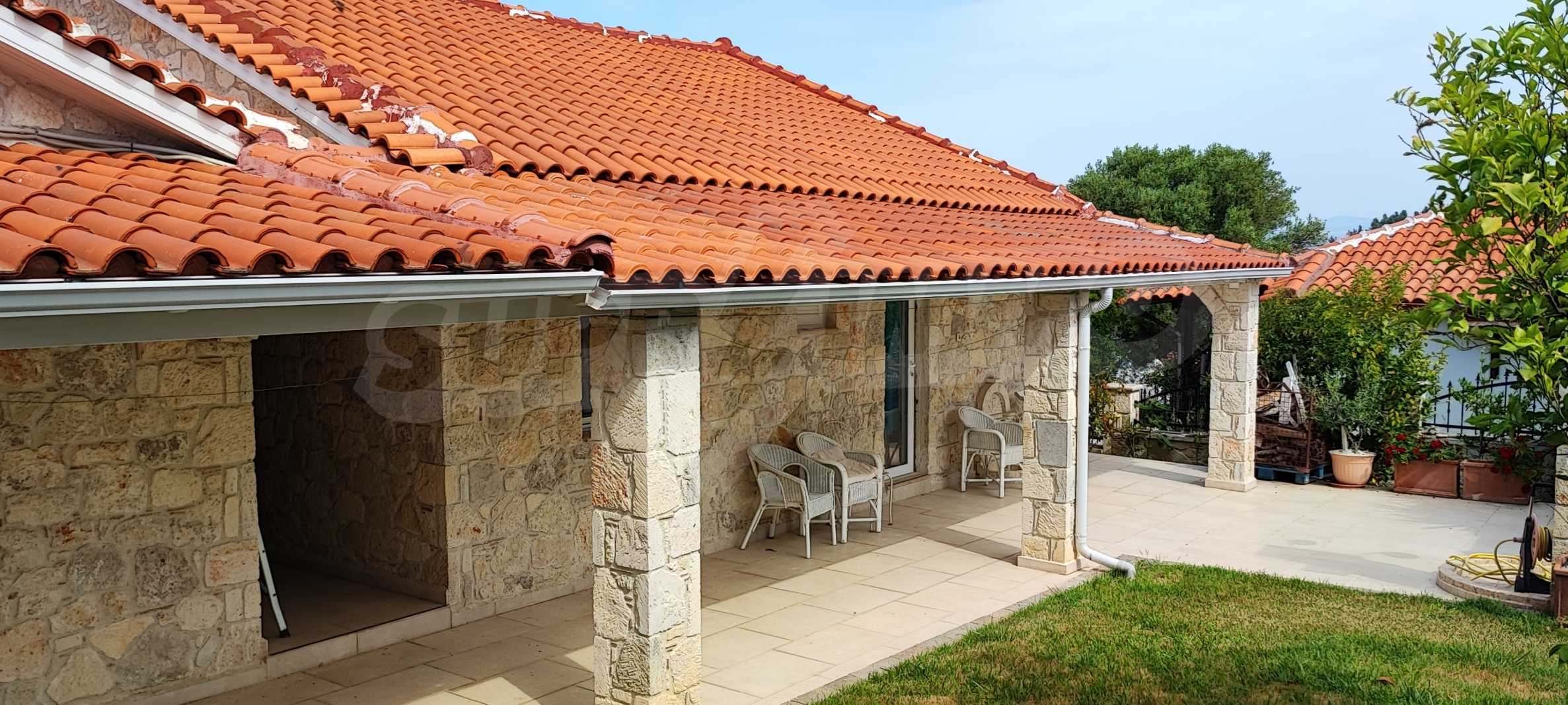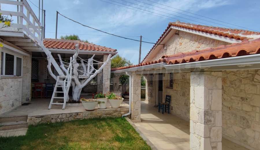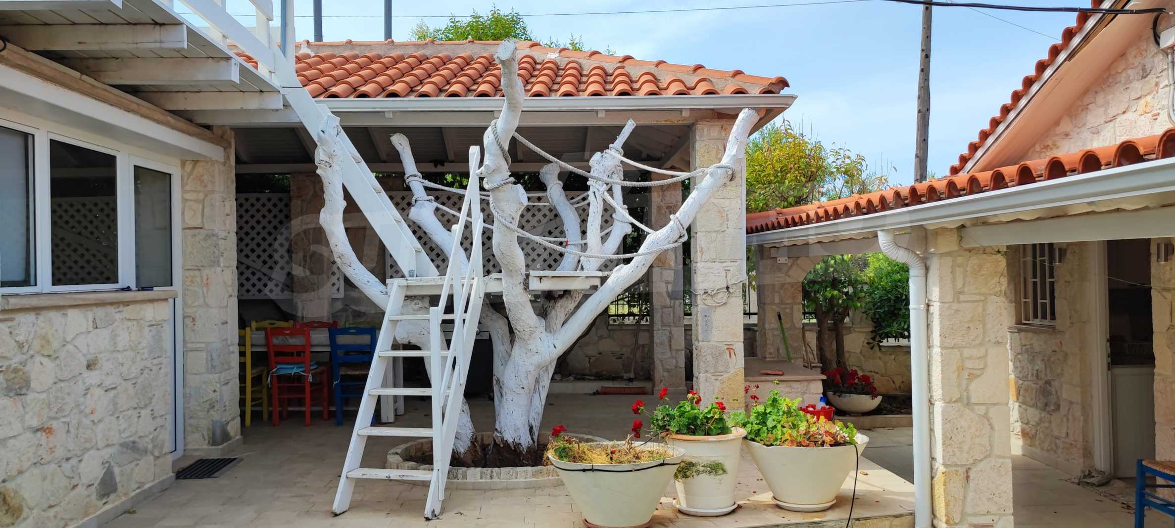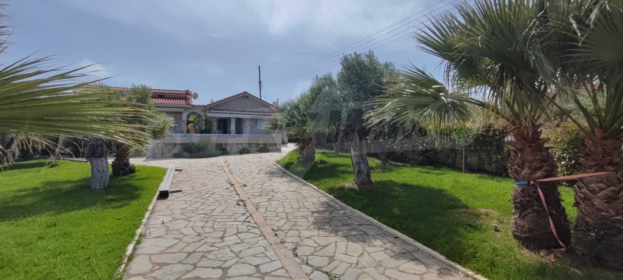 We present you a villa with typical Ionian architecture in Nea Potidea, Kassandra, Halkidiki. The villa is built on a plot of 1000 m2 and consists of two wings, which are separated as 2 separate apartments. Each wing has a living room and kitchenette, two bedrooms and a bathroom with toilet. The house also has a pergola-covered summer kitchen with BBQ, a one-bedroom apartment for support staff, and a storage room.