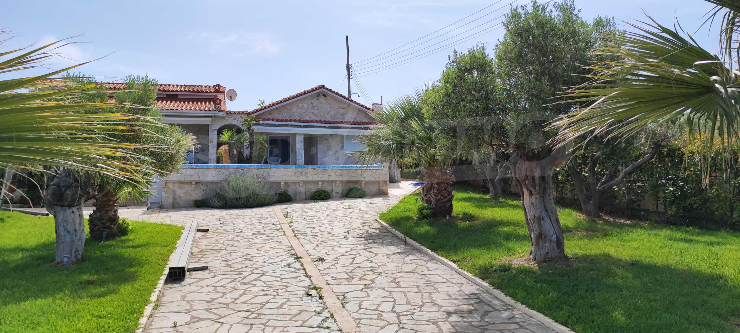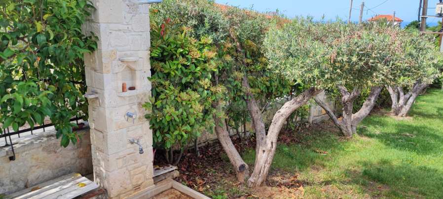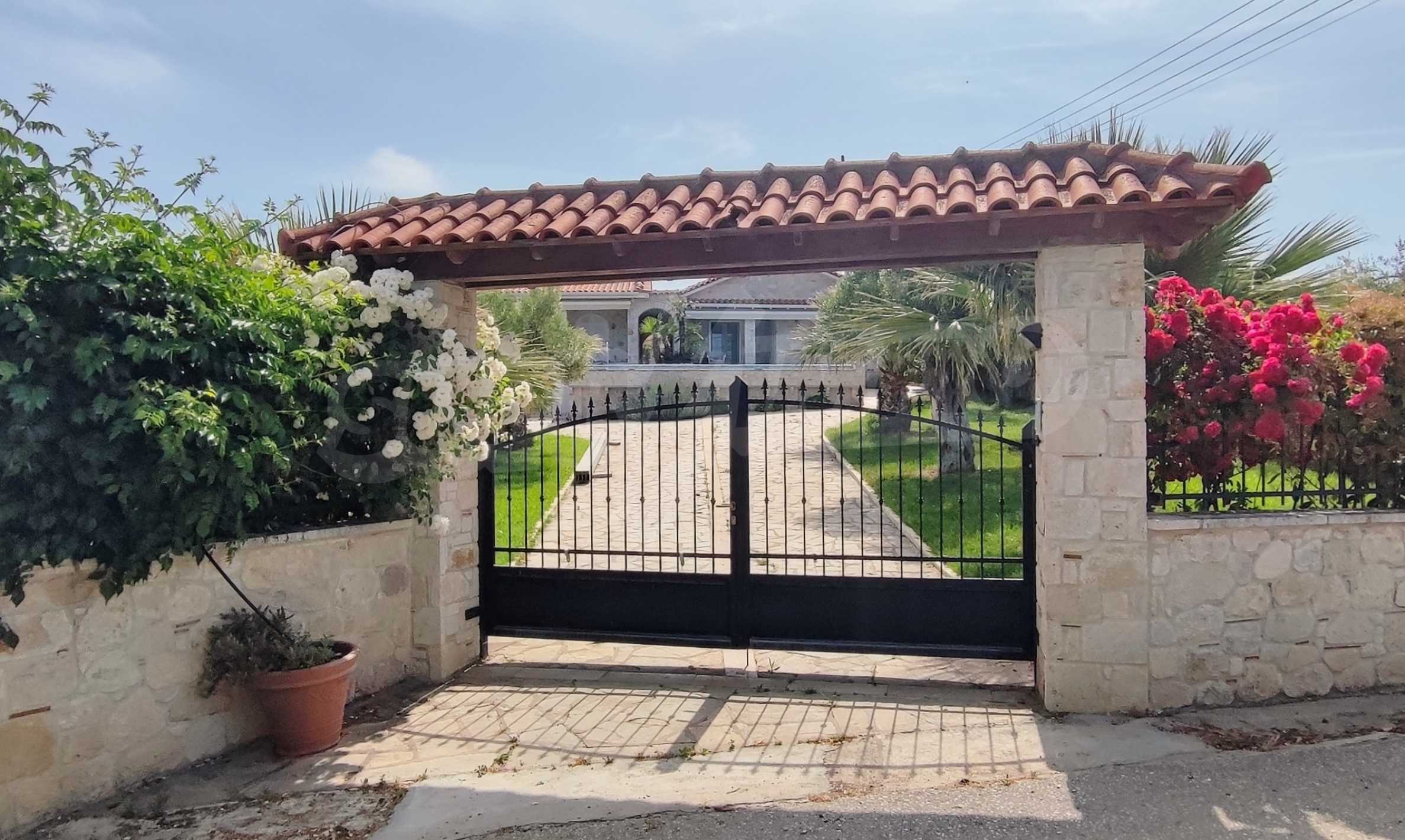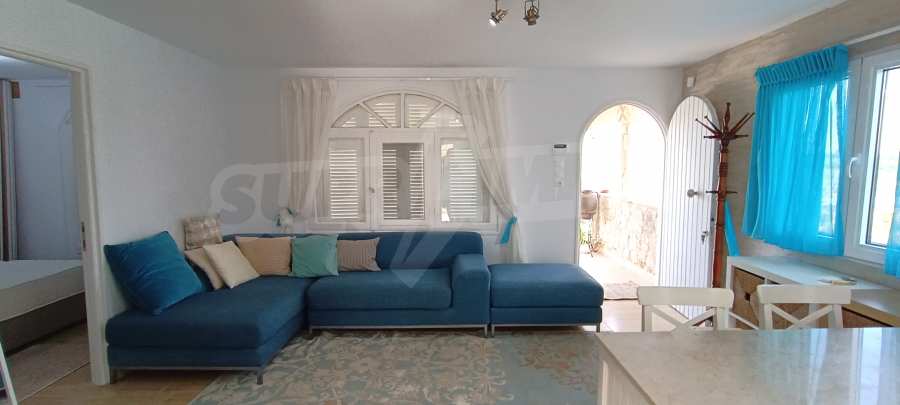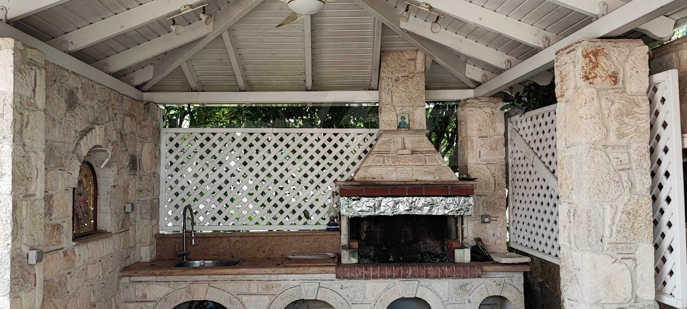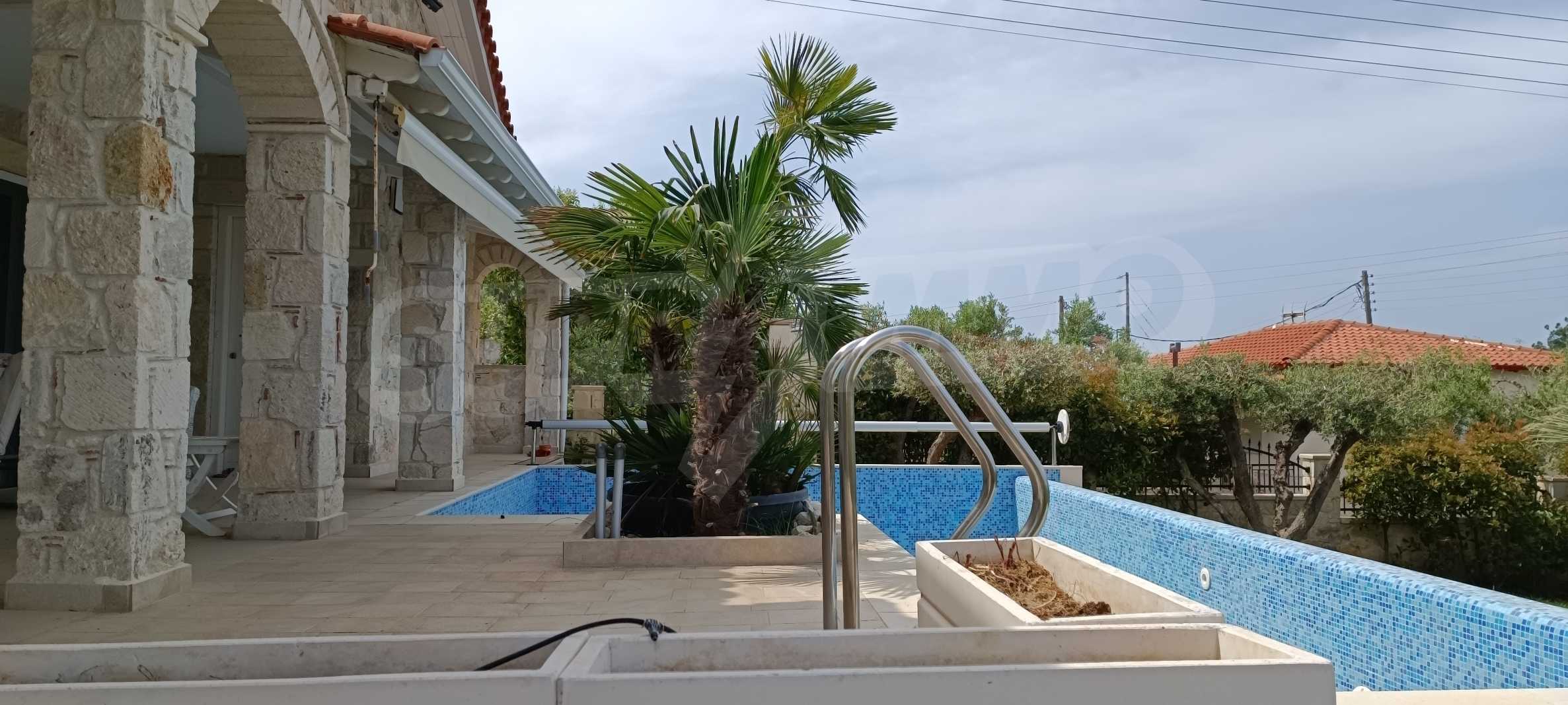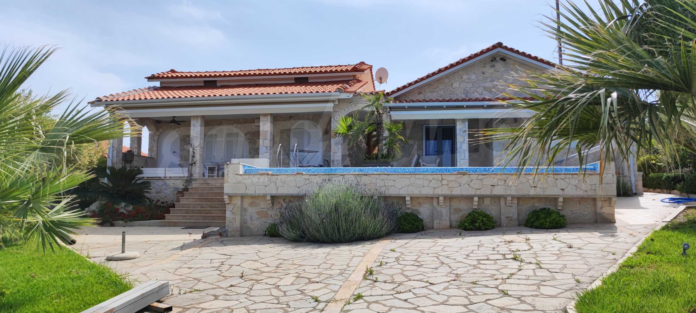 We present you a villa with typical Ionian architecture in Nea Potidea, Kassandra, Halkidiki. The villa is built on a plot of 1000 m2 and consists of two wings, which are separated as 2 separate apartments. Each wing has a living room and kitchenette, two bedrooms and a bathroom with toilet. The house also has a pergola-covered summer kitchen with BBQ, a one-bedroom apartment for support staff, and a storage room.
