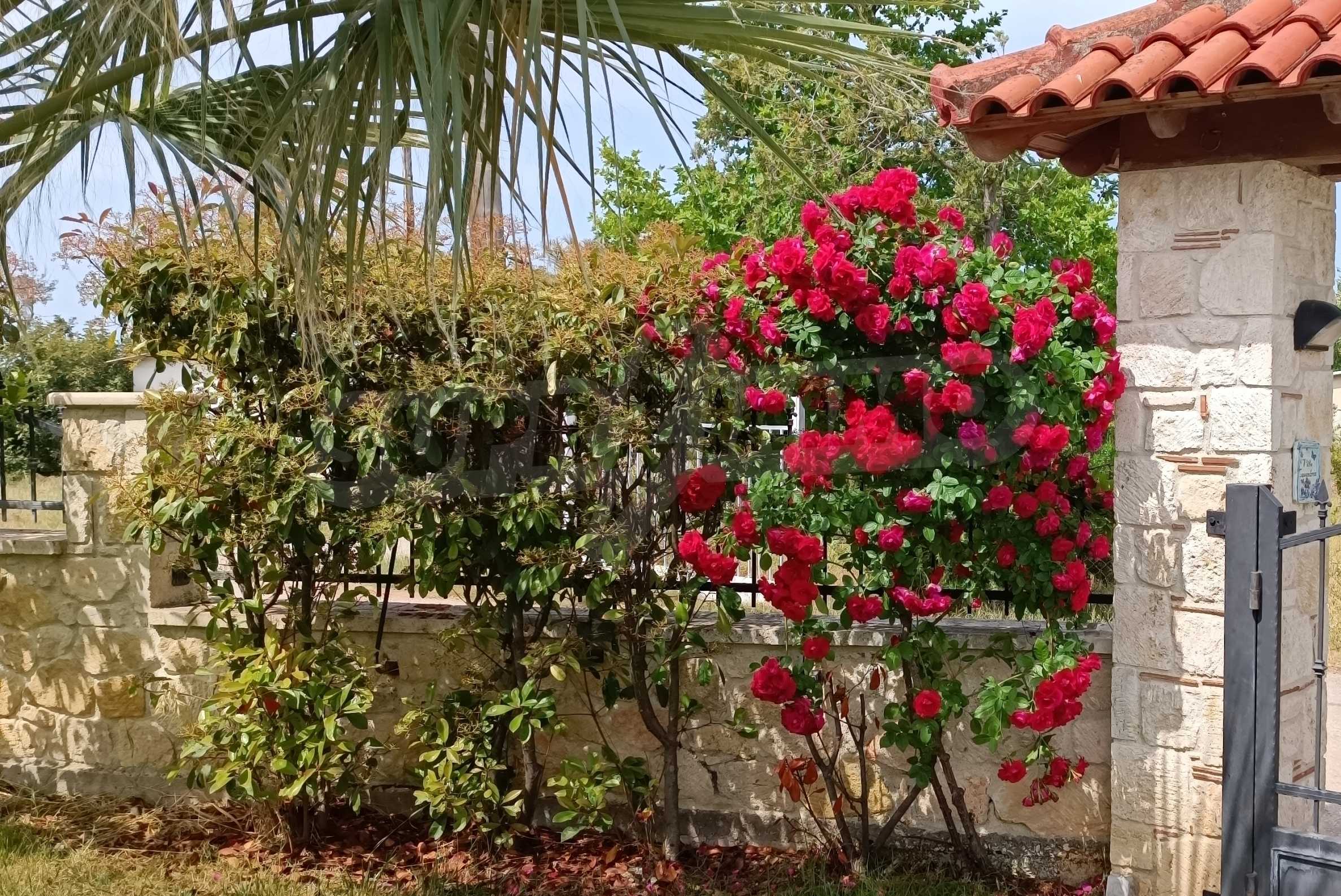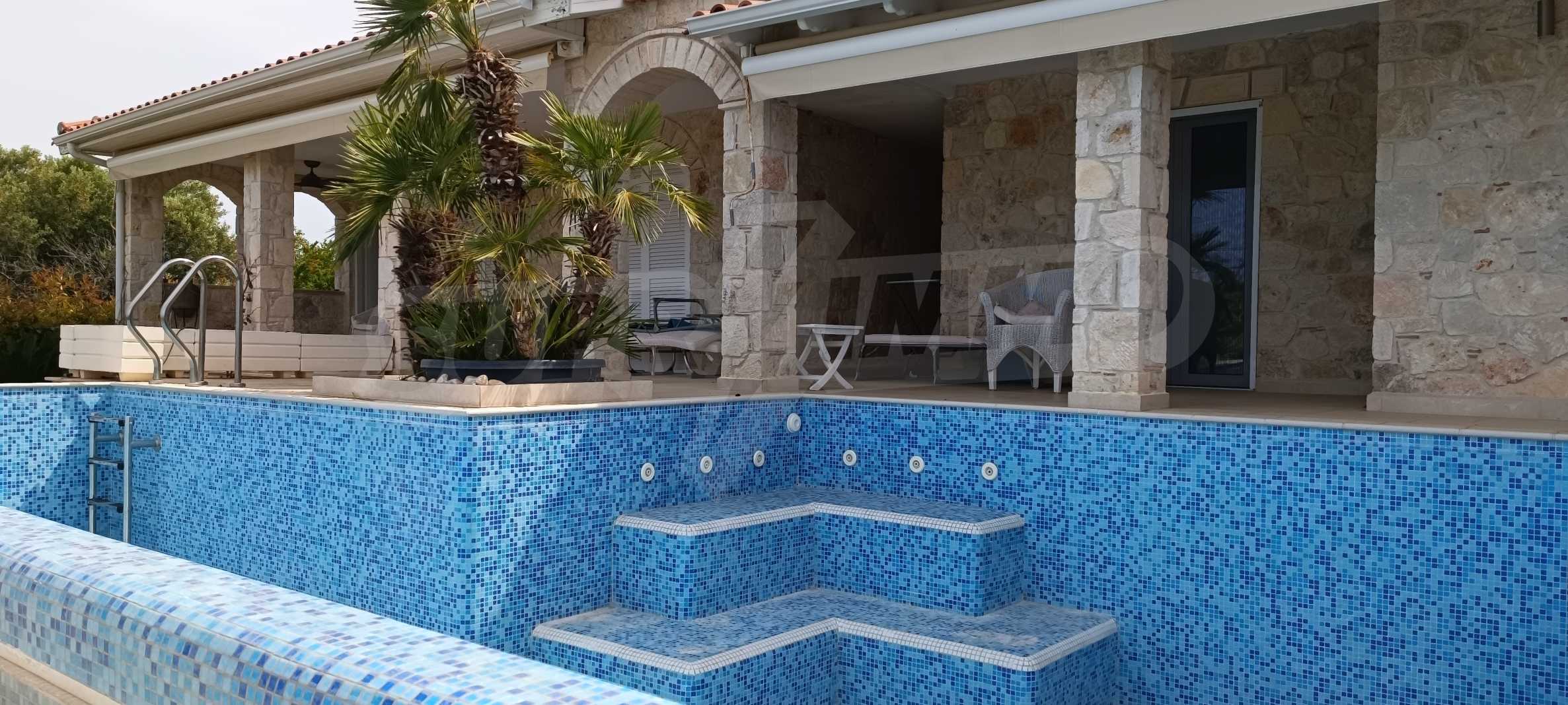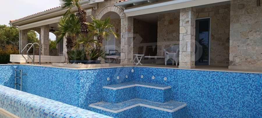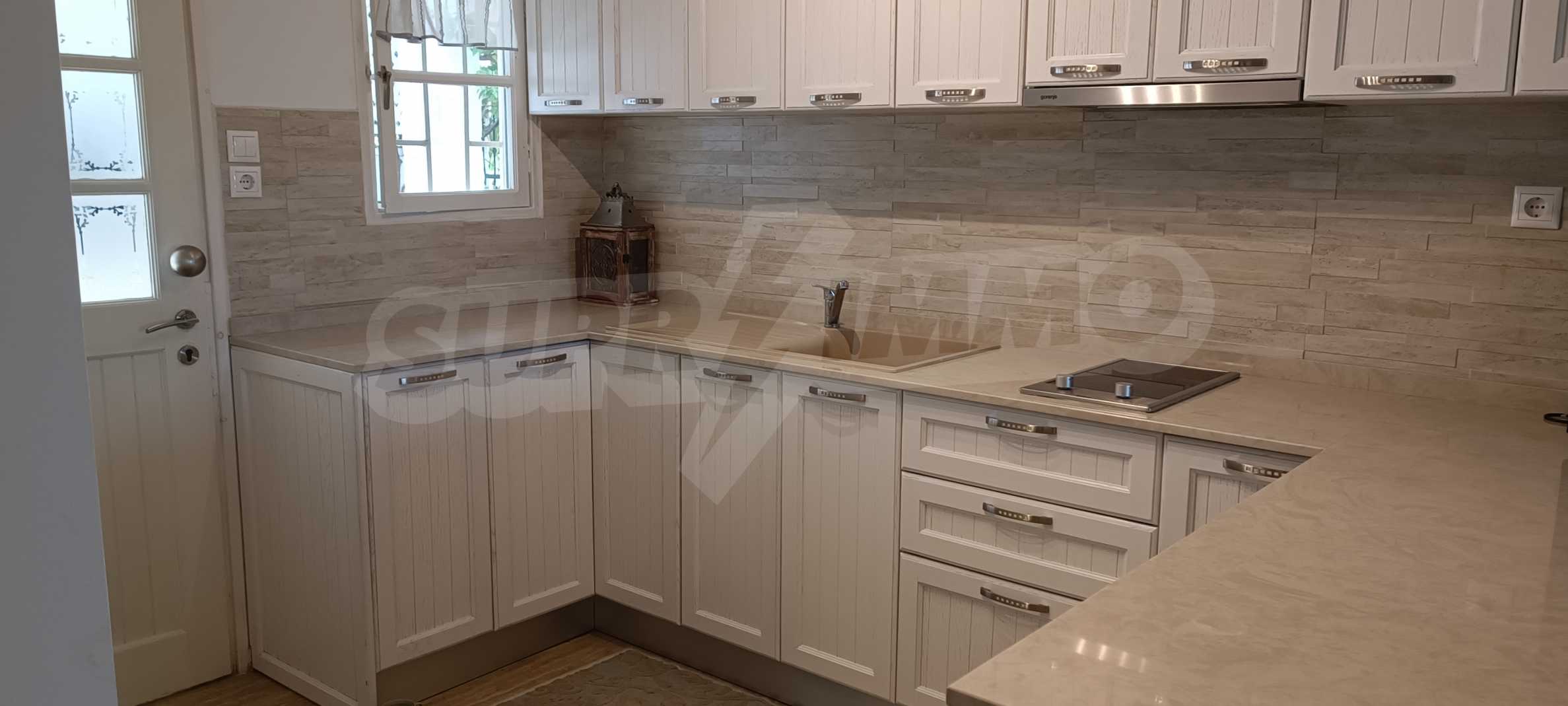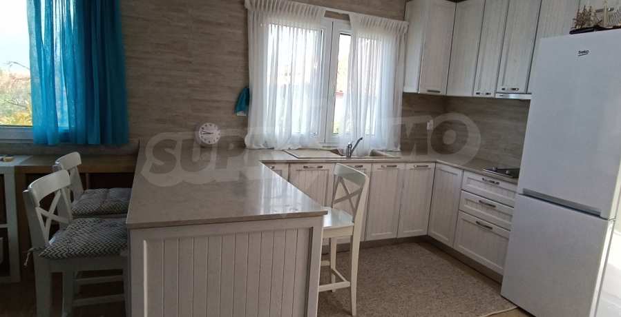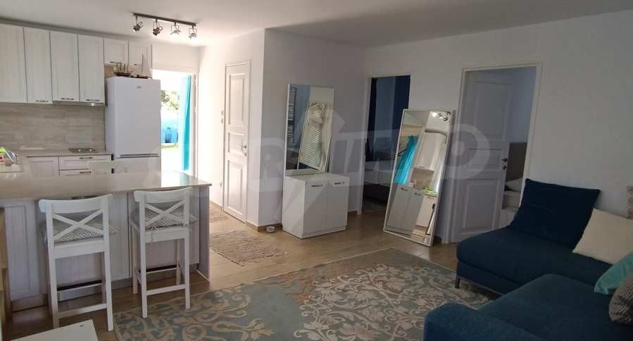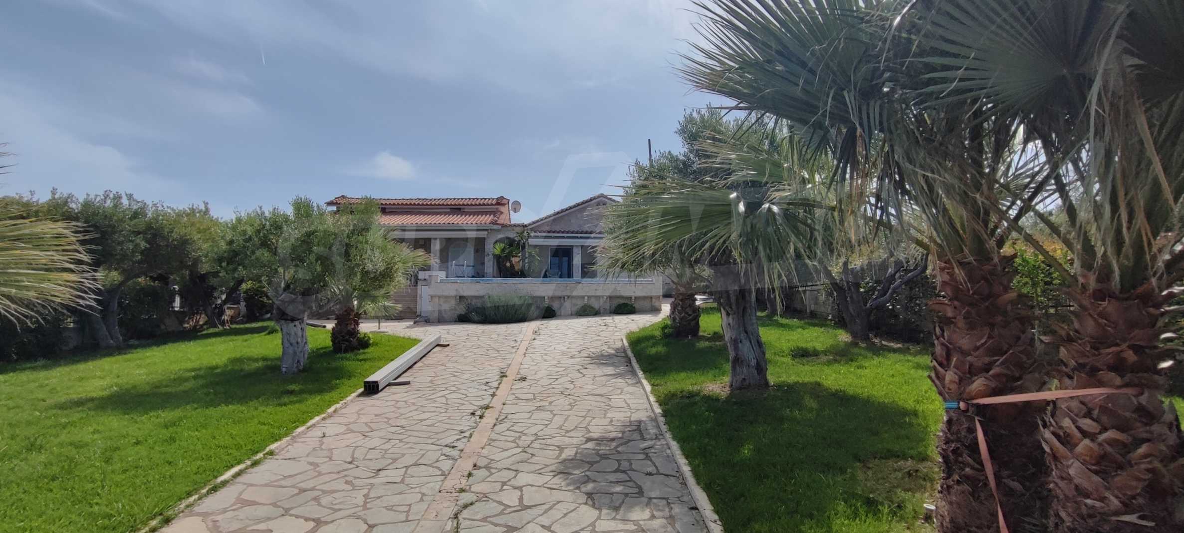We present you a villa with typical Ionian architecture in Nea Potidea, Kassandra, Halkidiki. The villa is built on a plot of 1000 m2 and consists of two wings, which are separated as 2 separate apartments. Each wing has a living room and kitchenette, two bedrooms and a bathroom with toilet. The house also has a pergola-covered summer kitchen with BBQ, a one-bedroom apartment for support staff, and a storage room.