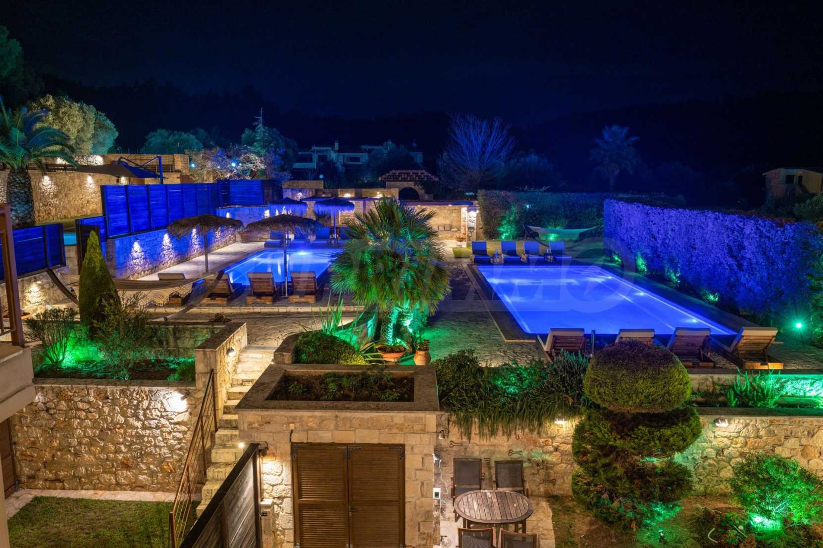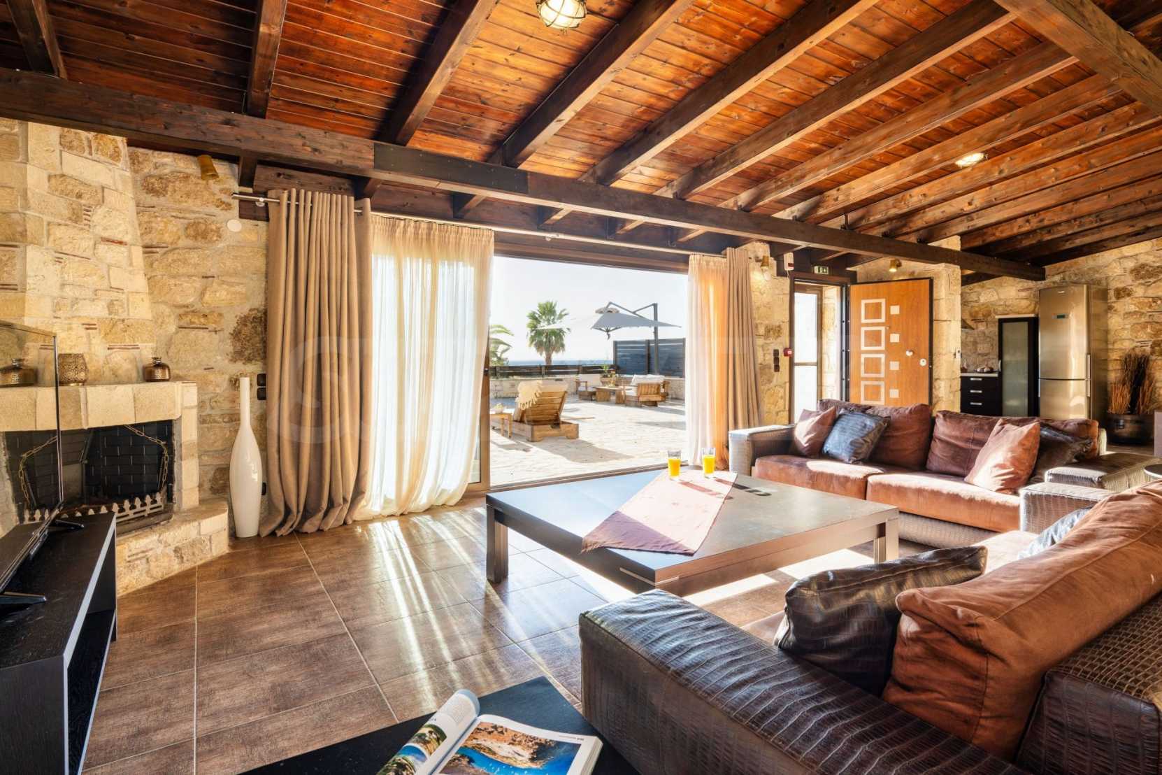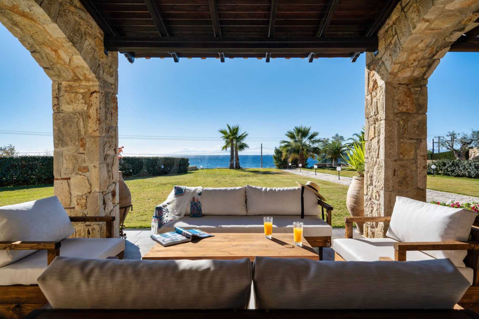 A complex of 5 independent villas on the beach is for sale. Each villa has its own outdoor private swimming pool, on a total land surface of 6.600s.qm.. The 5 villas have in total 14 bedrooms, 9 bathrooms, 1 WC and several storage places. A great sea view exists from almost everywhere in the complex. The interior is designed with high-end materials and custom made furniture. Air conditions, electric appliances, heating, and everything a house might need are already installed. This specific project is ideal for investment purposes since it already has its own clientele and its ready to work immediately!
