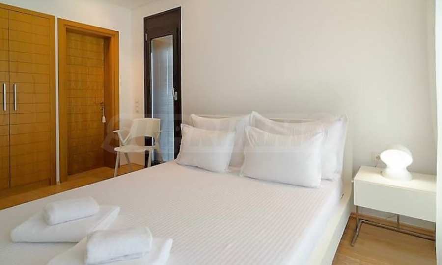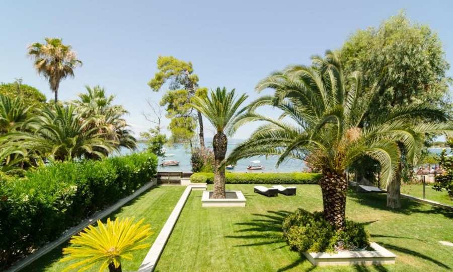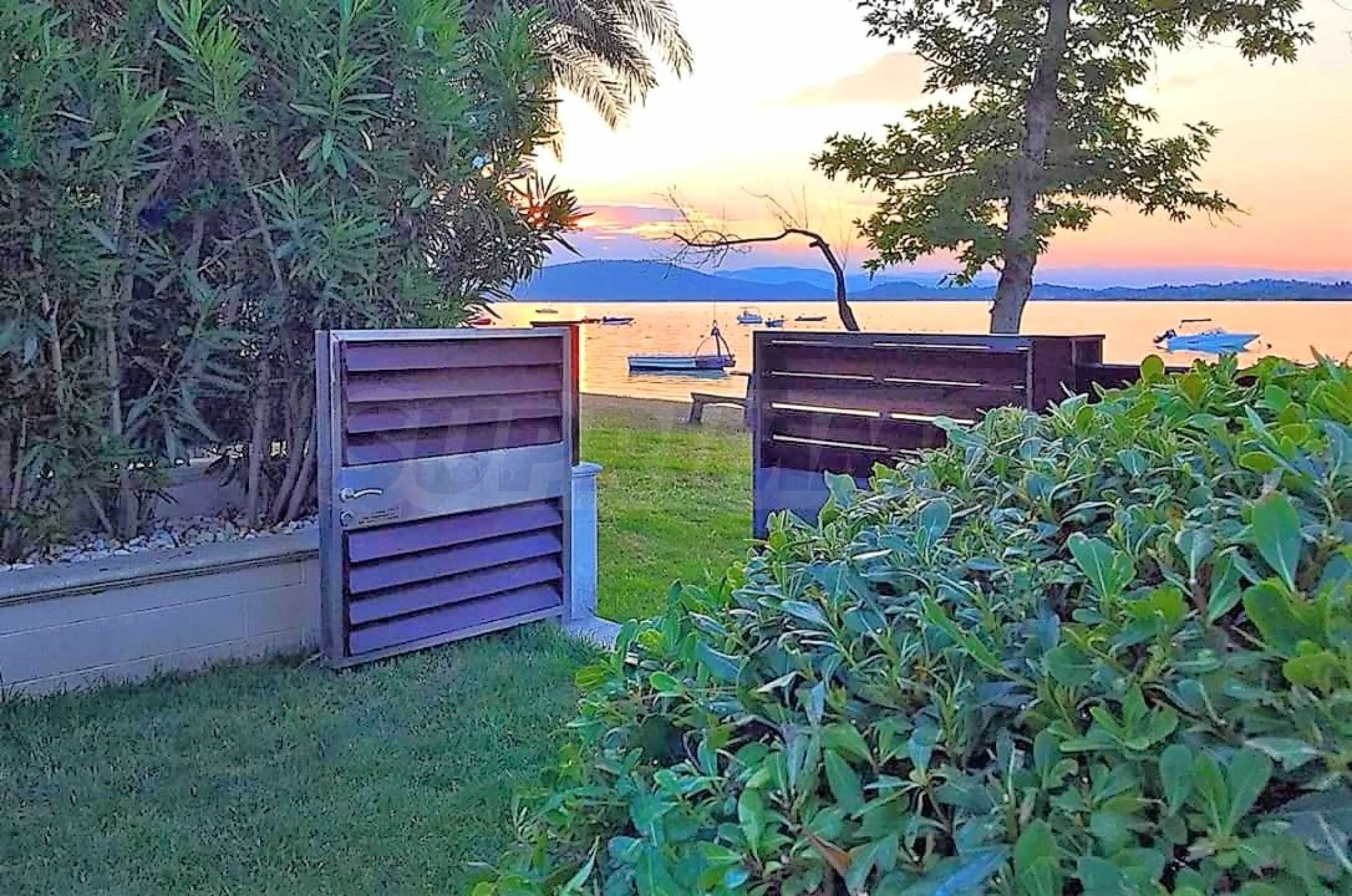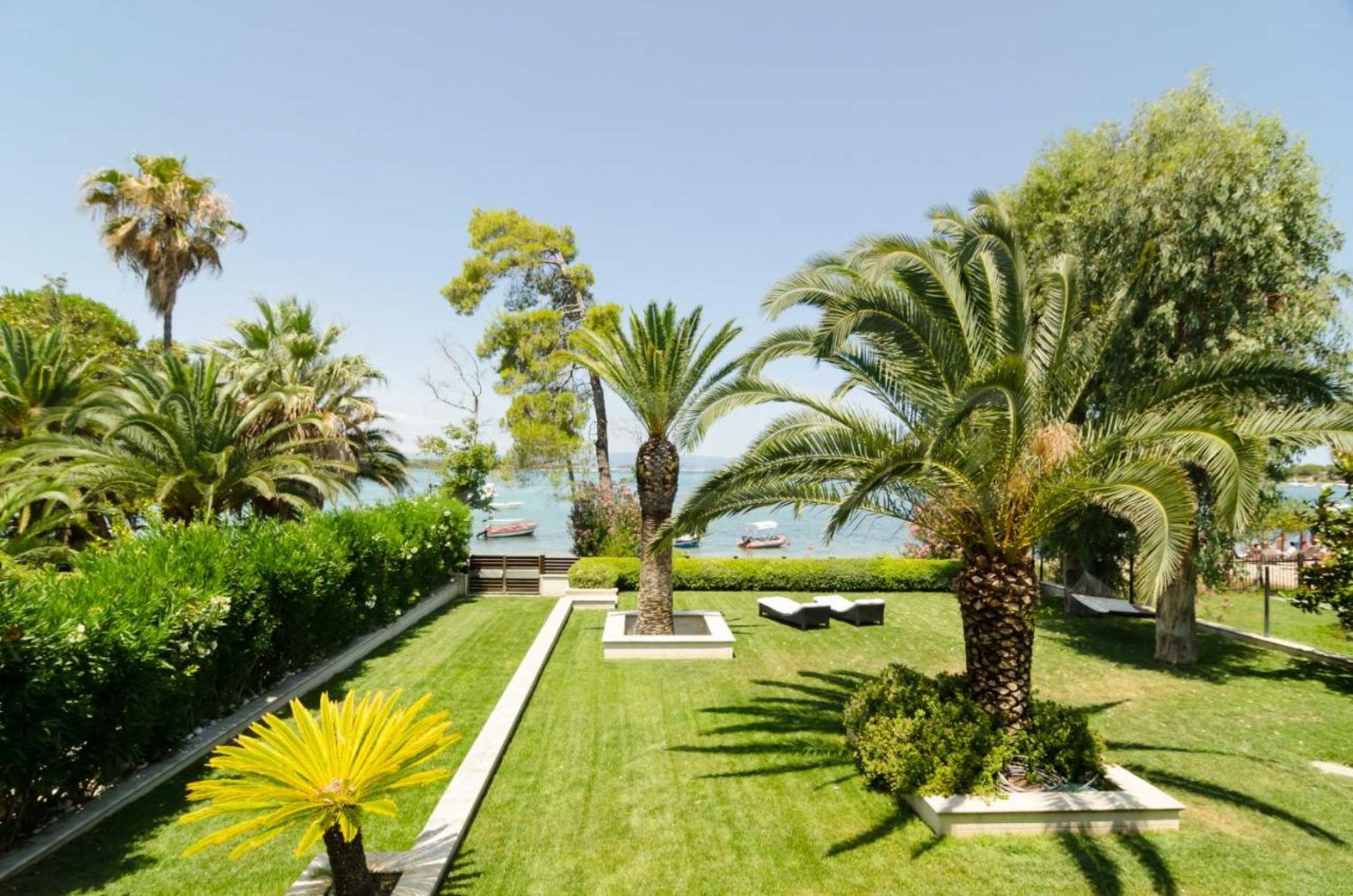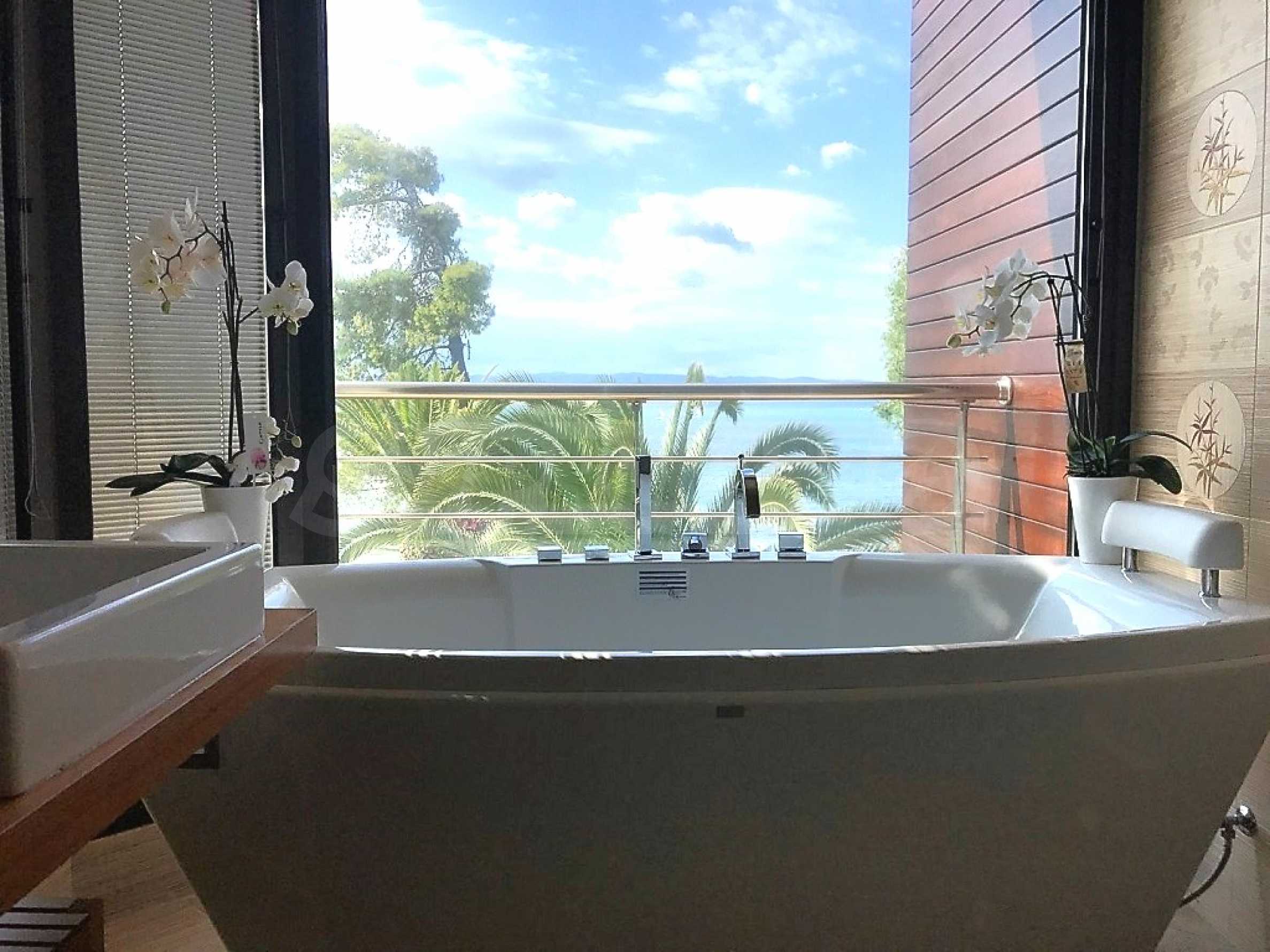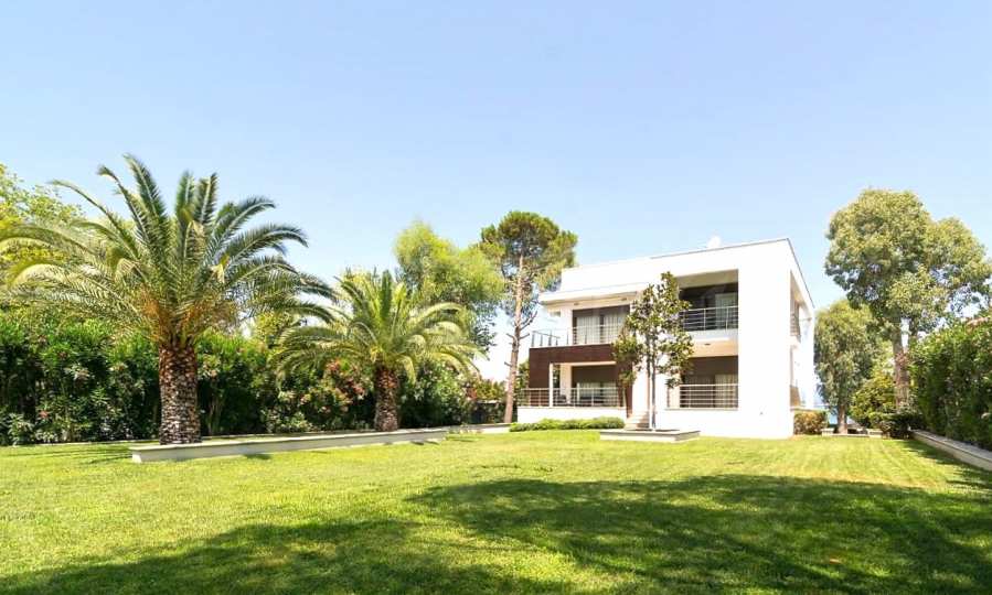 Luxury villa 1st line in Vourvourou, Sithonia, Halkidiki - a unique location for a holiday property in Greece. The coastal villa has an area of 400 m2 and is built on a plot of 1500 m2. The yard is well maintained and dotted with exotic vegetation. The property is located in the most prestigious area of Sithonia, in front of a beautiful sandy beach in Vourvourou, offering spectacular views of the sea and the island of Diaporos. The villa is built over three levels with 6 double bedrooms, all with en-suite bathrooms, one main living room and two kitchens. On the ground floor there is one kitchen, two bedrooms, a bathroom and a storage room. The first floor includes a living room, kitchen, dining room, living room, bathroom and bedroom with private bathroom. The second floor consists of two bedrooms, each with a private bathroom and a master bedroom of 60 m2 with a private bathroom with a bathtub and a view of the sea. The villa is fully furnished and equipped with everything you need for your holiday. The property is fully air-conditioned with a central heating system, which gives a unique advantage for living in the house all year round. It has solar collectors, alarm system and surveillance cameras, smart TVs, satellite TV, DVD and wi-fi internet.