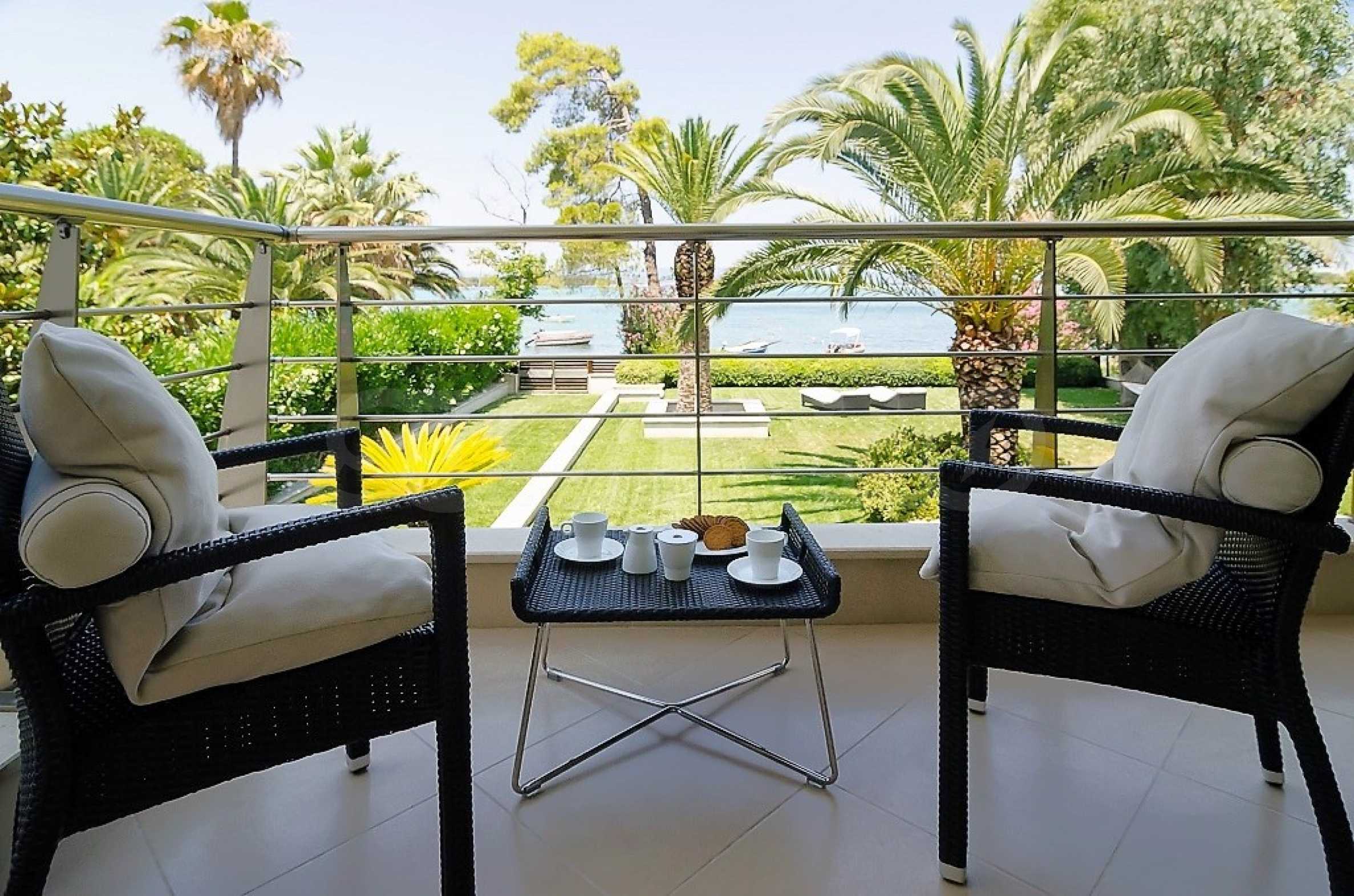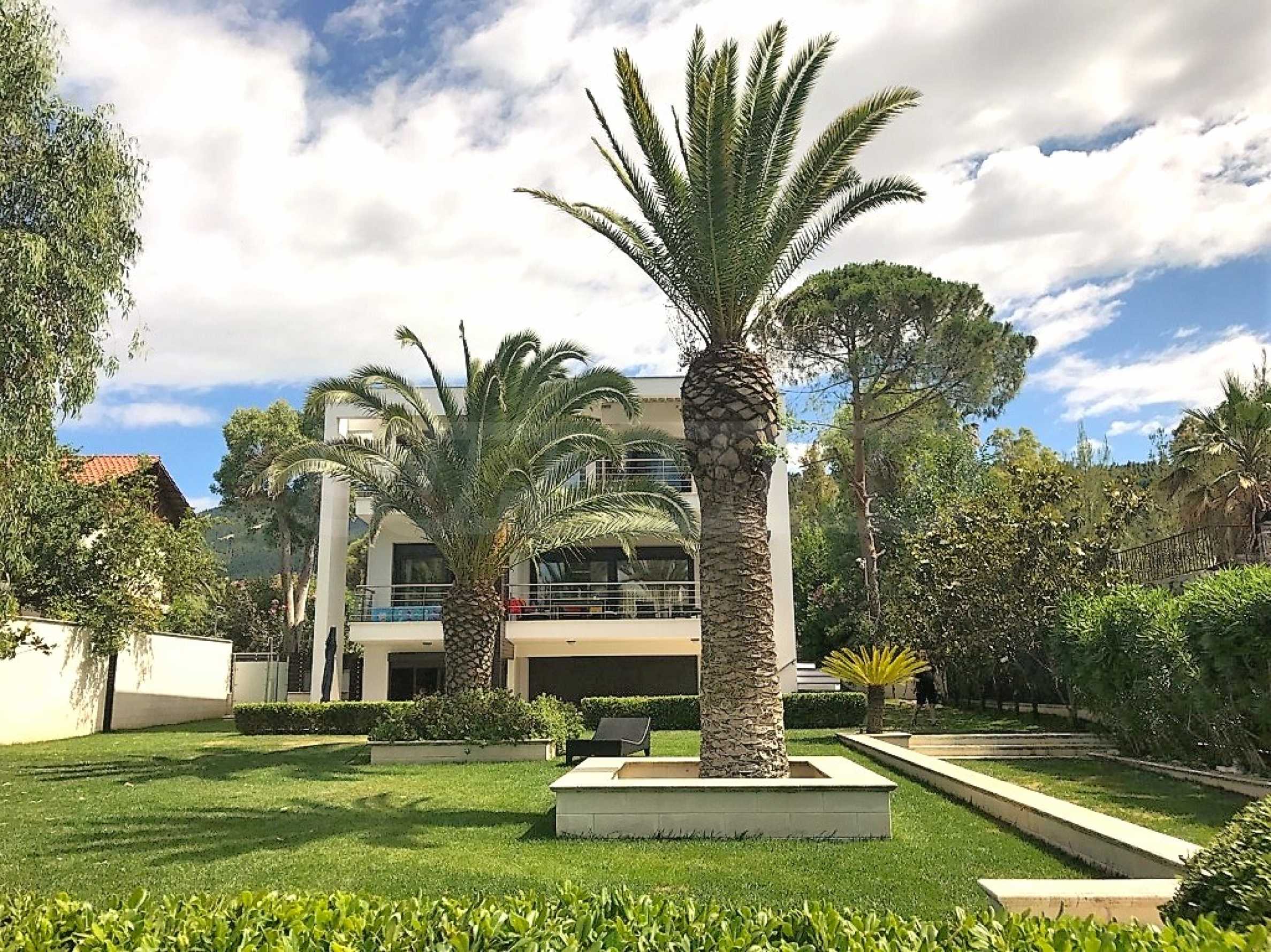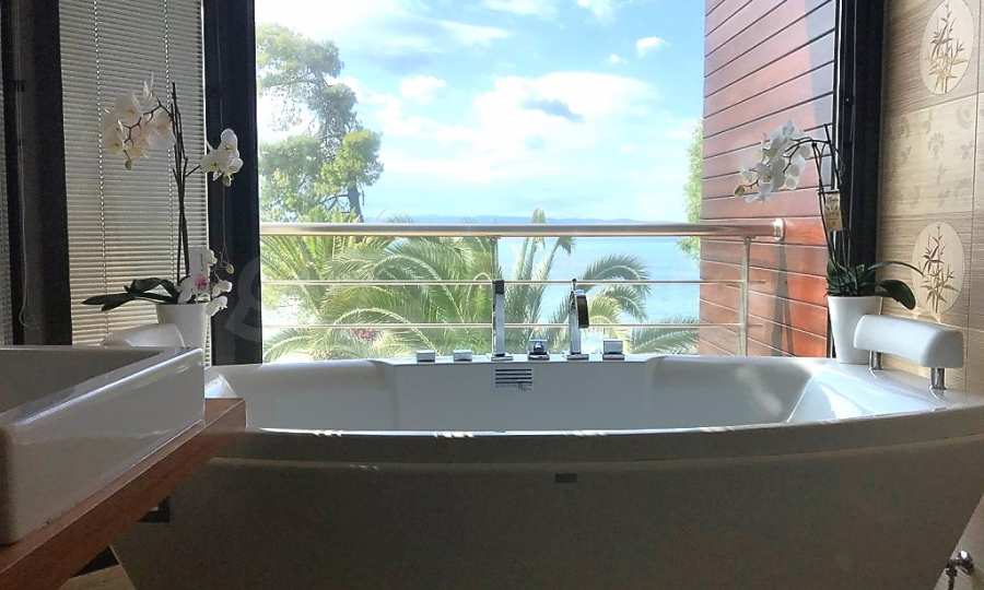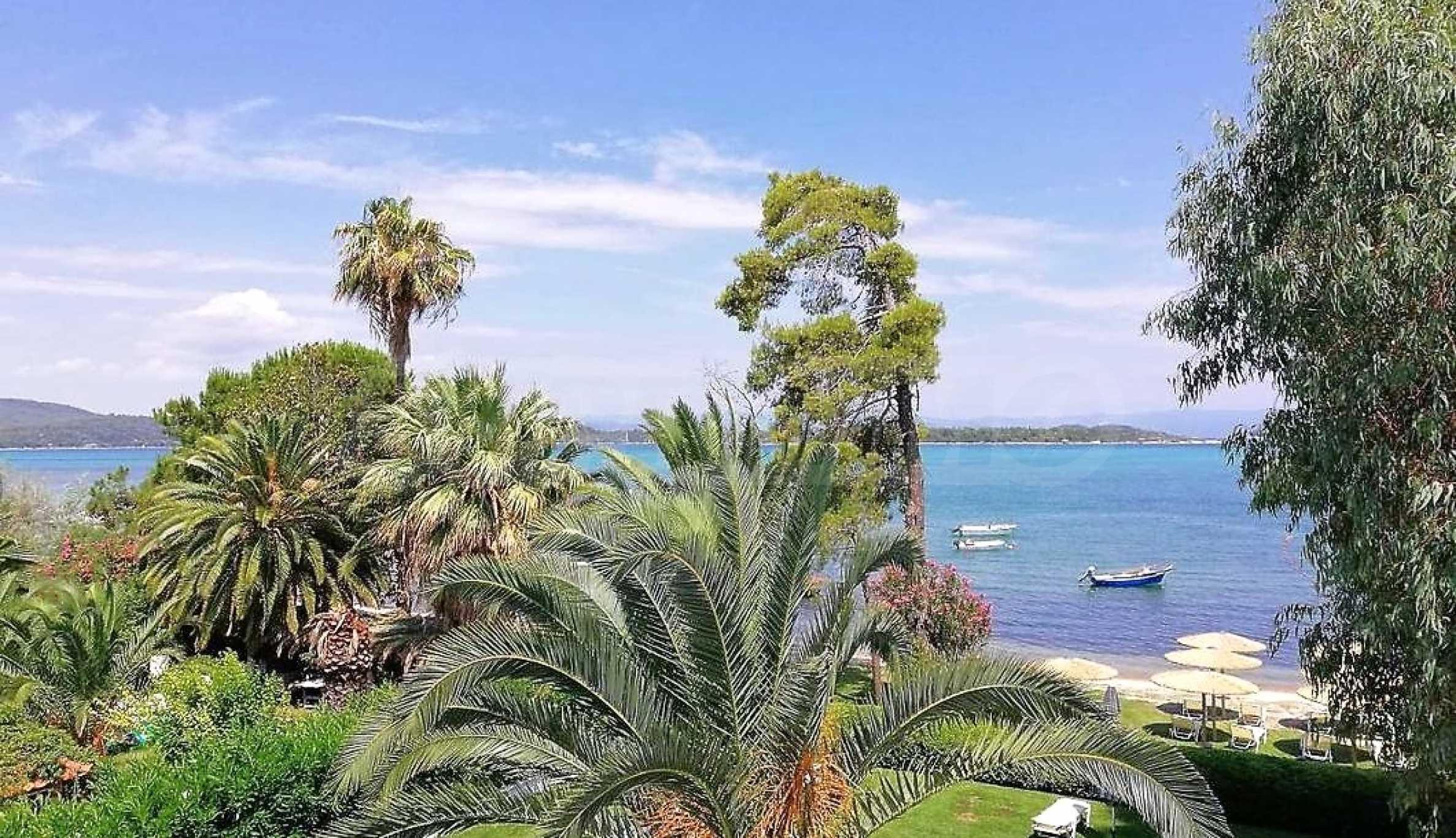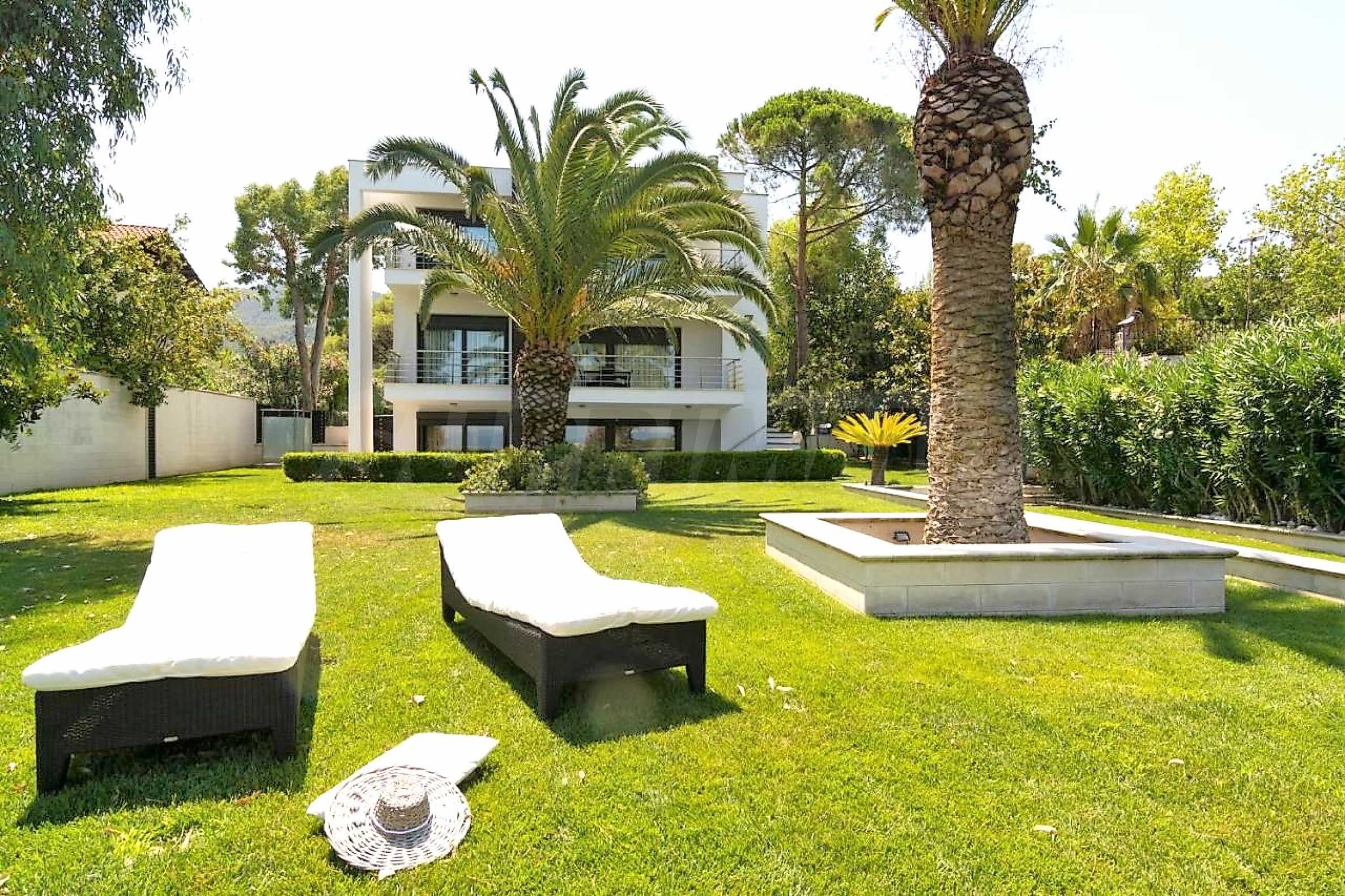 Luxury villa 1st line in Vourvourou, Sithonia, Halkidiki - a unique location for a holiday property in Greece. The coastal villa has an area of 400 m2 and is built on a plot of 1500 m2. The yard is well maintained and dotted with exotic vegetation. The property is located in the most prestigious area of Sithonia, in front of a beautiful sandy beach in Vourvourou, offering spectacular views of the sea and the island of Diaporos. The villa is built over three levels with 6 double bedrooms, all with en-suite bathrooms, one main living room and two kitchens. On the ground floor there is one kitchen, two bedrooms, a bathroom and a storage room. The first floor includes a living room, kitchen, dining room, living room, bathroom and bedroom with private bathroom. The second floor consists of two bedrooms, each with a private bathroom and a master bedroom of 60 m2 with a private bathroom with a bathtub and a view of the sea. The villa is fully furnished and equipped with everything you need for your holiday. The property is fully air-conditioned with a central heating system, which gives a unique advantage for living in the house all year round. It has solar collectors, alarm system and surveillance cameras, smart TVs, satellite TV, DVD and wi-fi internet.