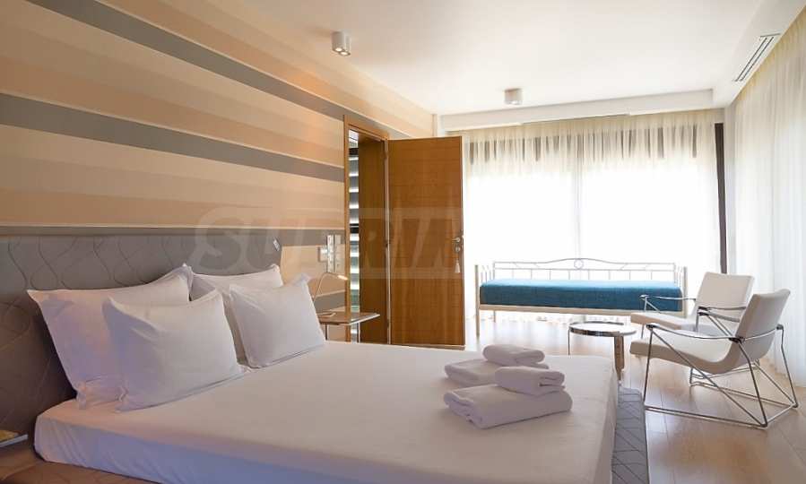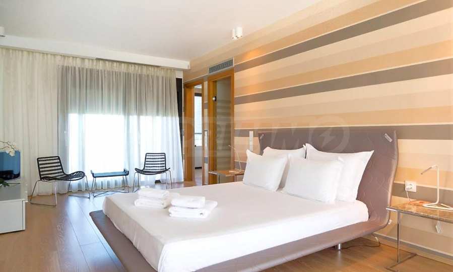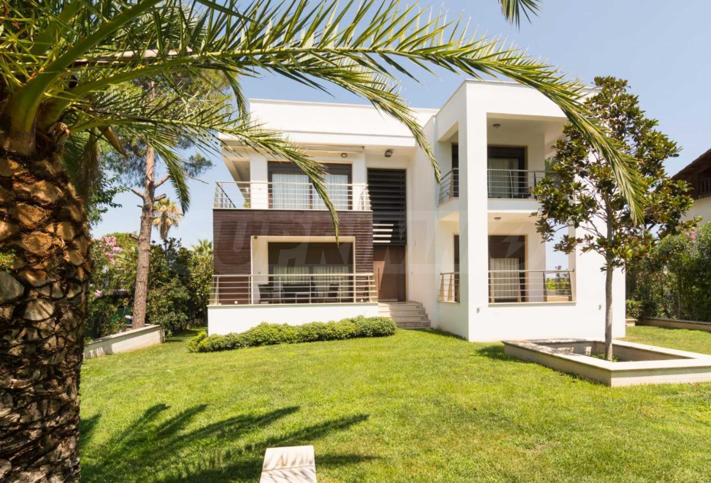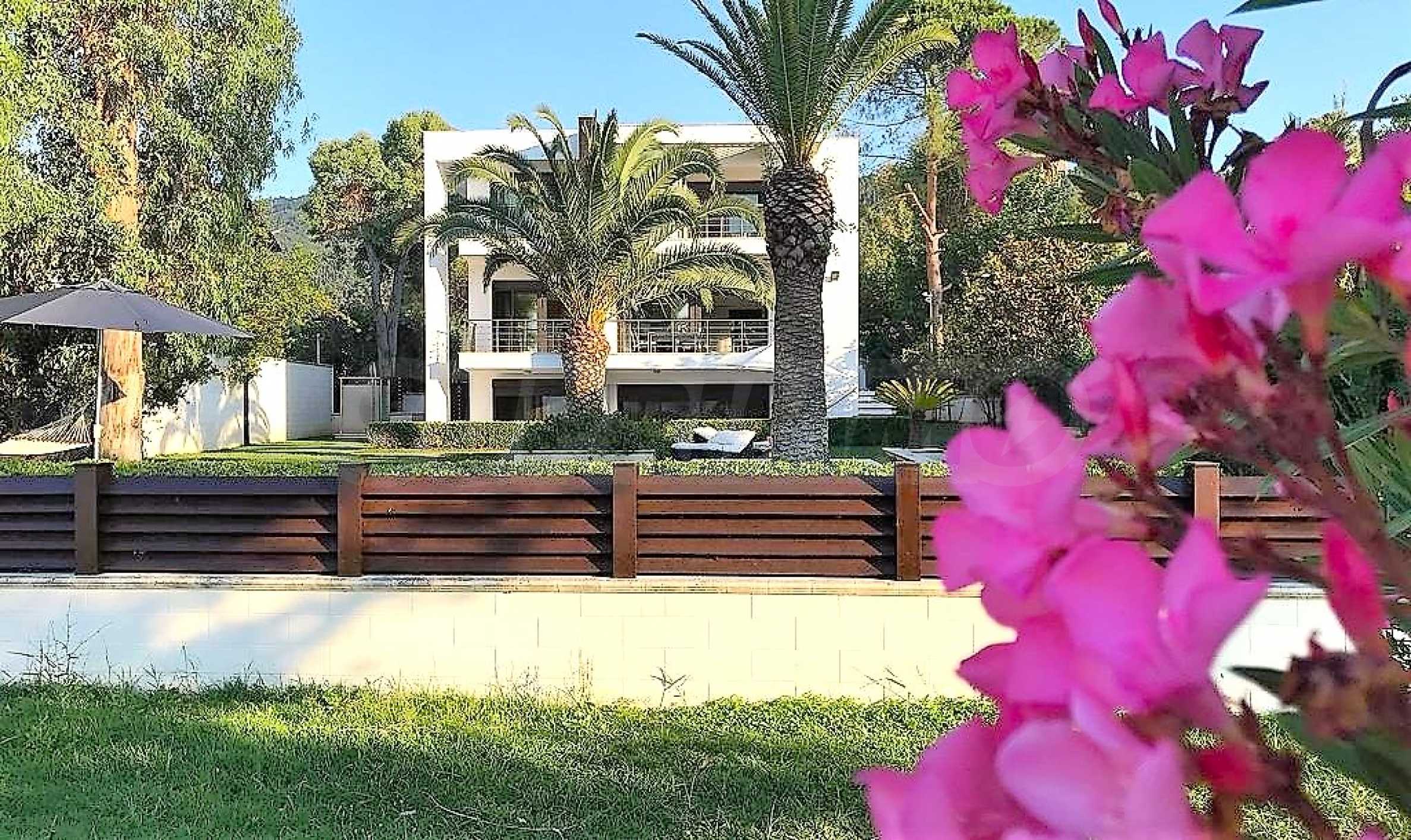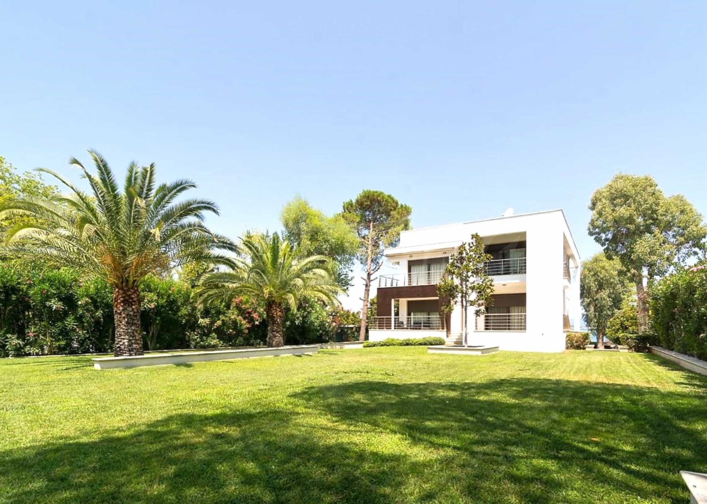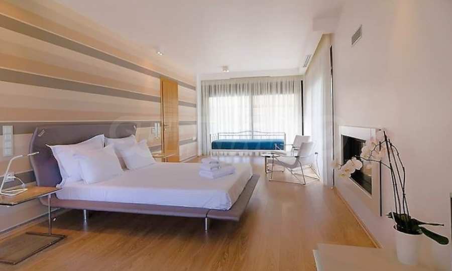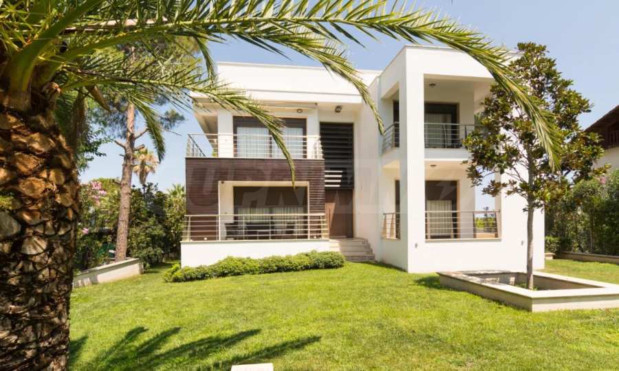 Luxury villa 1st line in Vourvourou, Sithonia, Halkidiki - a unique location for a holiday property in Greece. The coastal villa has an area of 400 m2 and is built on a plot of 1500 m2. The yard is well maintained and dotted with exotic vegetation. The property is located in the most prestigious area of Sithonia, in front of a beautiful sandy beach in Vourvourou, offering spectacular views of the sea and the island of Diaporos. The villa is built over three levels with 6 double bedrooms, all with en-suite bathrooms, one main living room and two kitchens. On the ground floor there is one kitchen, two bedrooms, a bathroom and a storage room. The first floor includes a living room, kitchen, dining room, living room, bathroom and bedroom with private bathroom. The second floor consists of two bedrooms, each with a private bathroom and a master bedroom of 60 m2 with a private bathroom with a bathtub and a view of the sea. The villa is fully furnished and equipped with everything you need for your holiday. The property is fully air-conditioned with a central heating system, which gives a unique advantage for living in the house all year round. It has solar collectors, alarm system and surveillance cameras, smart TVs, satellite TV, DVD and wi-fi internet.