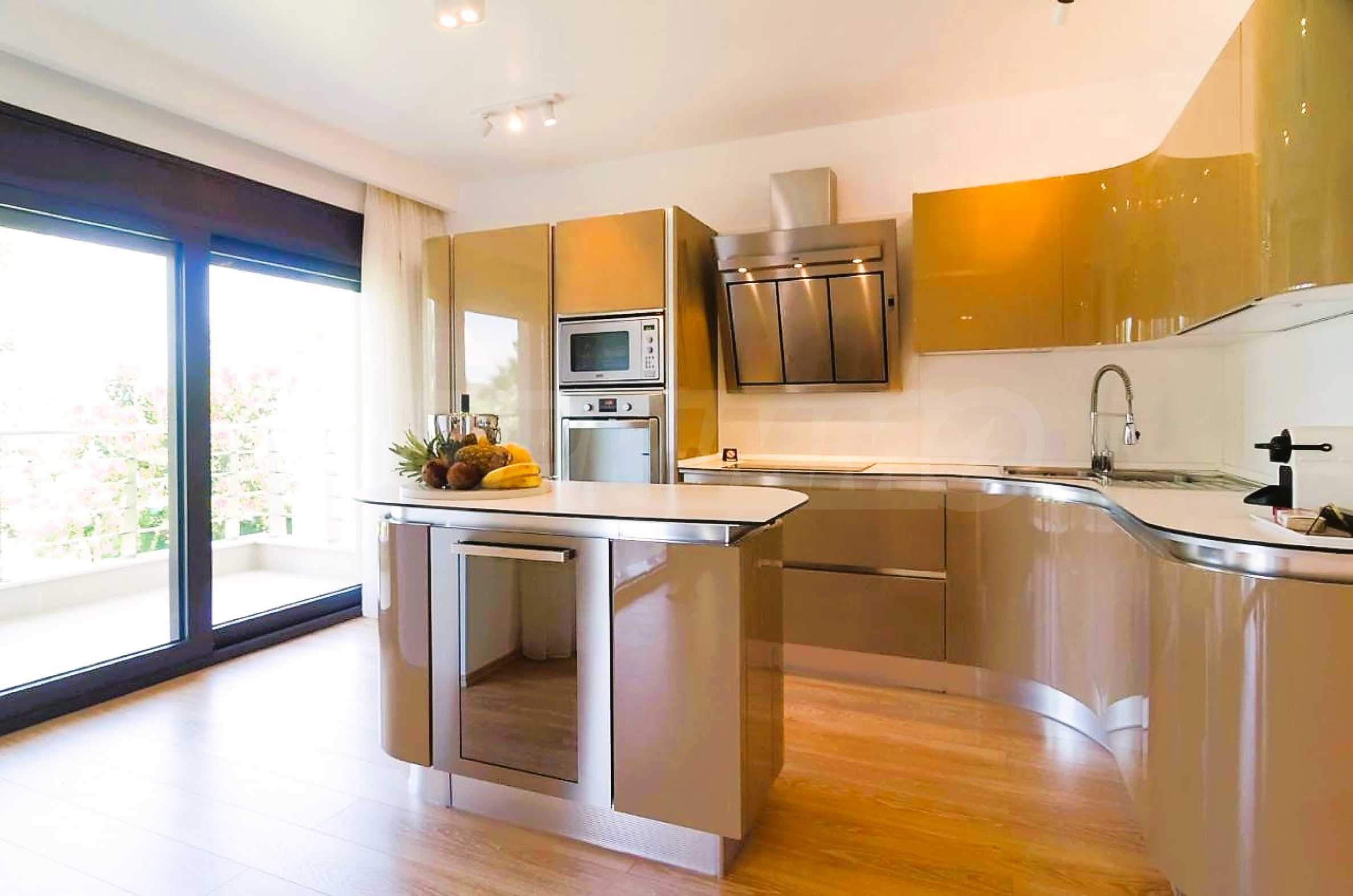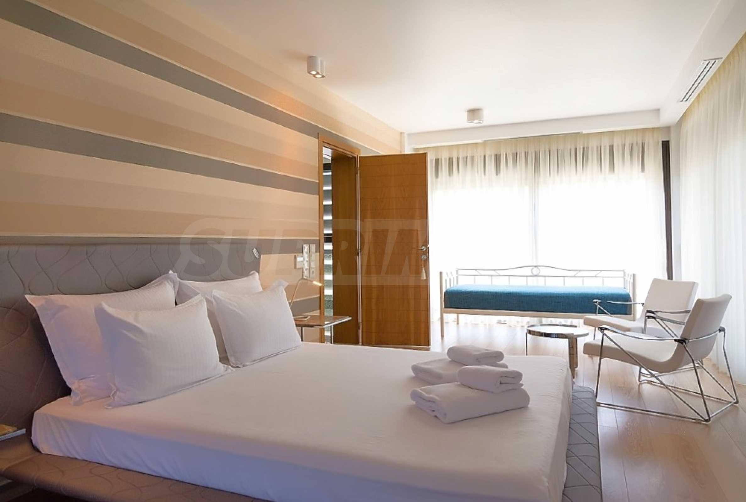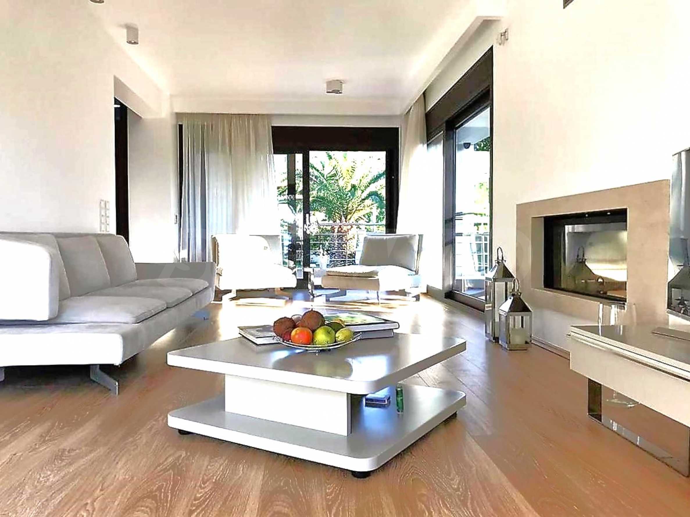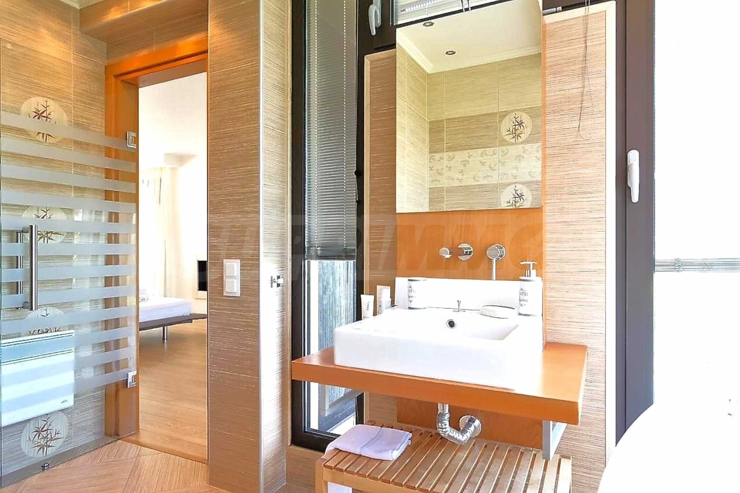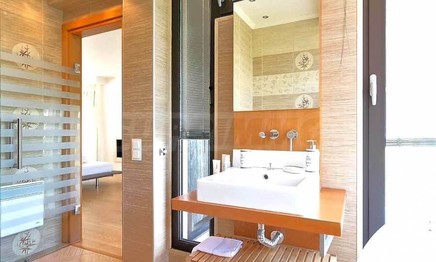 Luxury villa 1st line in Vourvourou, Sithonia, Halkidiki - a unique location for a holiday property in Greece. The coastal villa has an area of 400 m2 and is built on a plot of 1500 m2. The yard is well maintained and dotted with exotic vegetation. The property is located in the most prestigious area of Sithonia, in front of a beautiful sandy beach in Vourvourou, offering spectacular views of the sea and the island of Diaporos. The villa is built over three levels with 6 double bedrooms, all with en-suite bathrooms, one main living room and two kitchens. On the ground floor there is one kitchen, two bedrooms, a bathroom and a storage room. The first floor includes a living room, kitchen, dining room, living room, bathroom and bedroom with private bathroom. The second floor consists of two bedrooms, each with a private bathroom and a master bedroom of 60 m2 with a private bathroom with a bathtub and a view of the sea. The villa is fully furnished and equipped with everything you need for your holiday. The property is fully air-conditioned with a central heating system, which gives a unique advantage for living in the house all year round. It has solar collectors, alarm system and surveillance cameras, smart TVs, satellite TV, DVD and wi-fi internet.