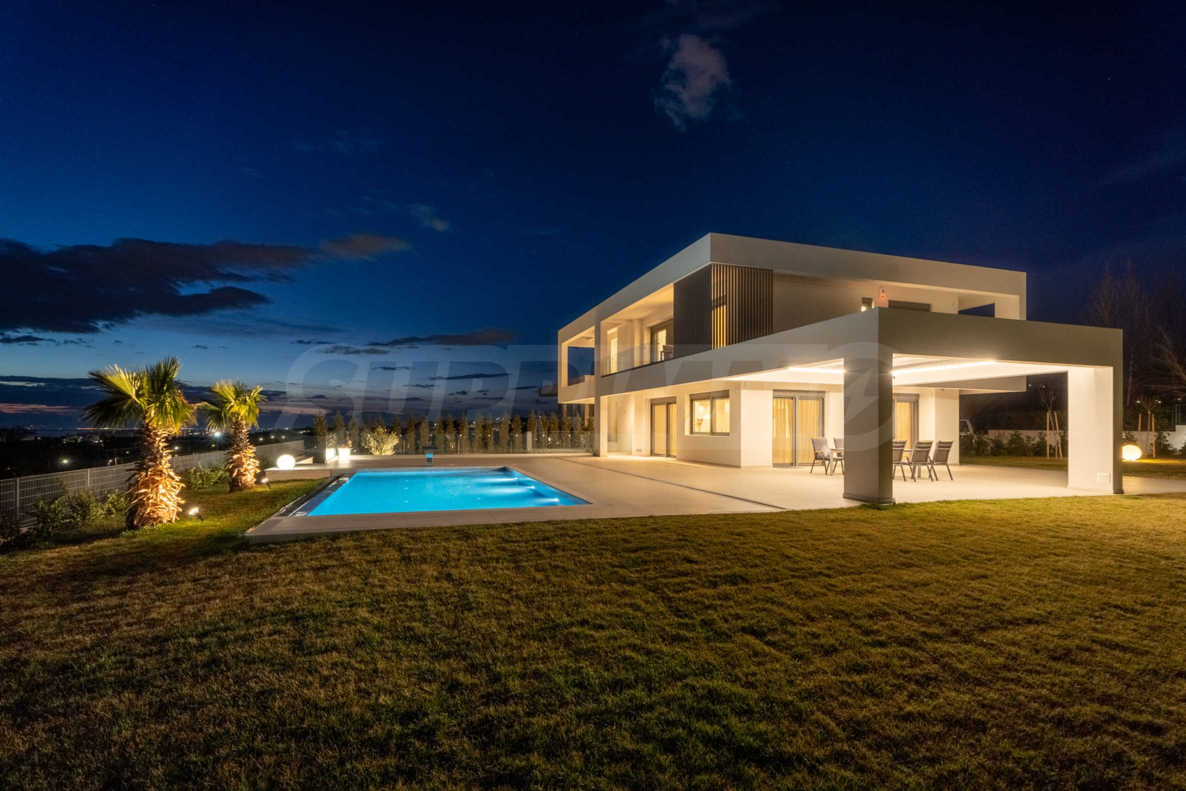 The villa is located away from the main road, in an ecologically clean and peaceful place. This is a great solution for families with children and people who prefer silence to the noisy city. The large panoramic windows offer a wonderful view of Thermaikos Bay and the city of Thessaloniki itself.