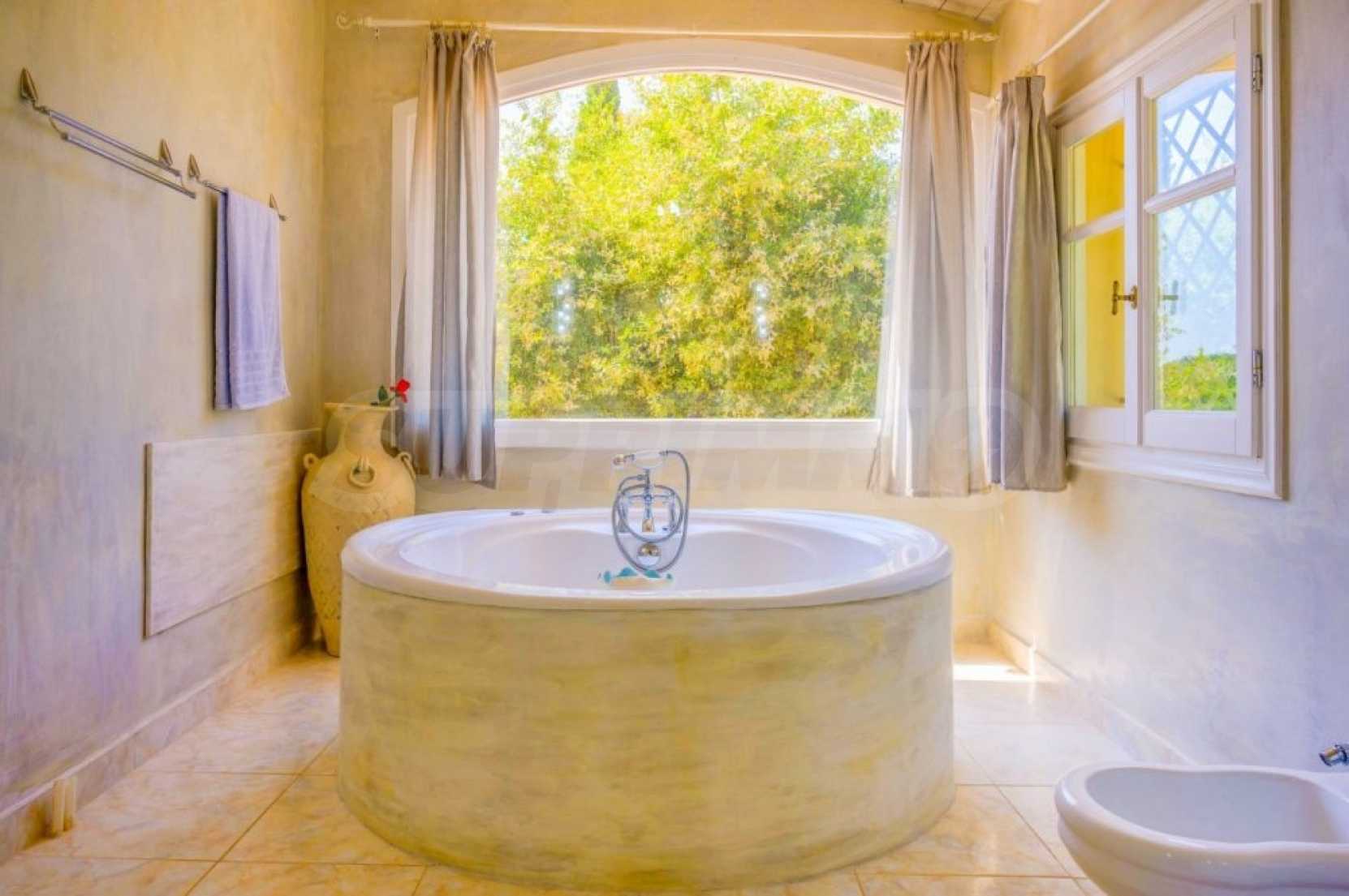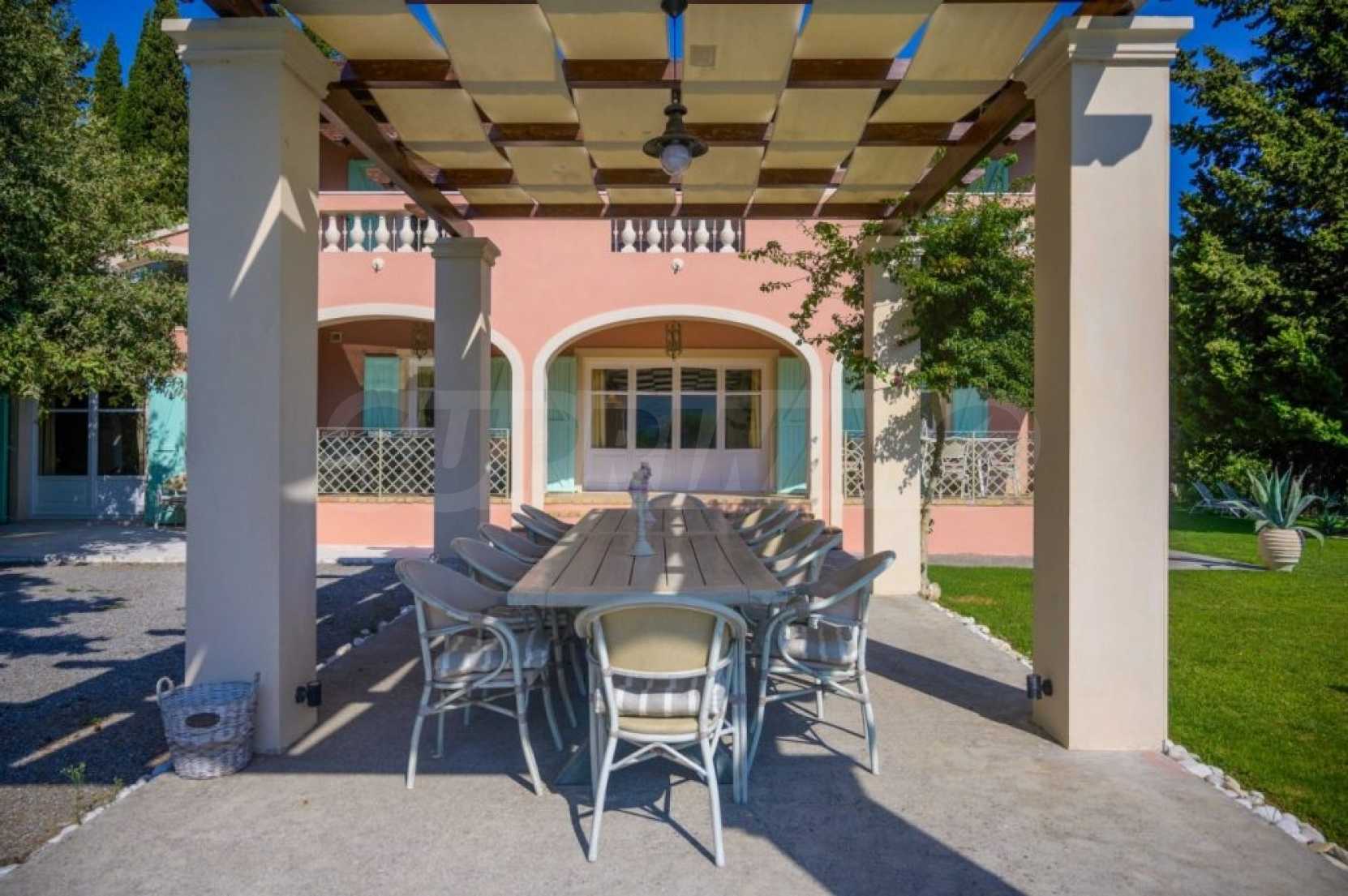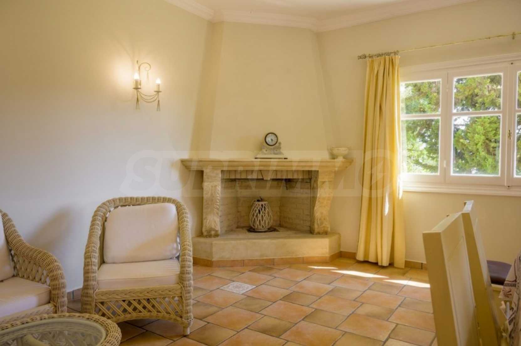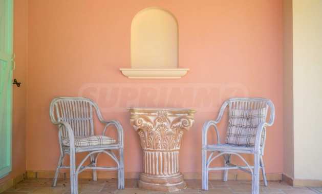 The villa is arranged on two levels and consists of 6 large en suite bedrooms with fitted wardrobes, air conditioning and access to balconies. Each floor has an open plan kitchen-dining room with fireplace and exit to the garden. The special red living room and the tv room can offer moments of relaxation for young and old. The levels are joined by an internal staircase, but can also be accessed separately.