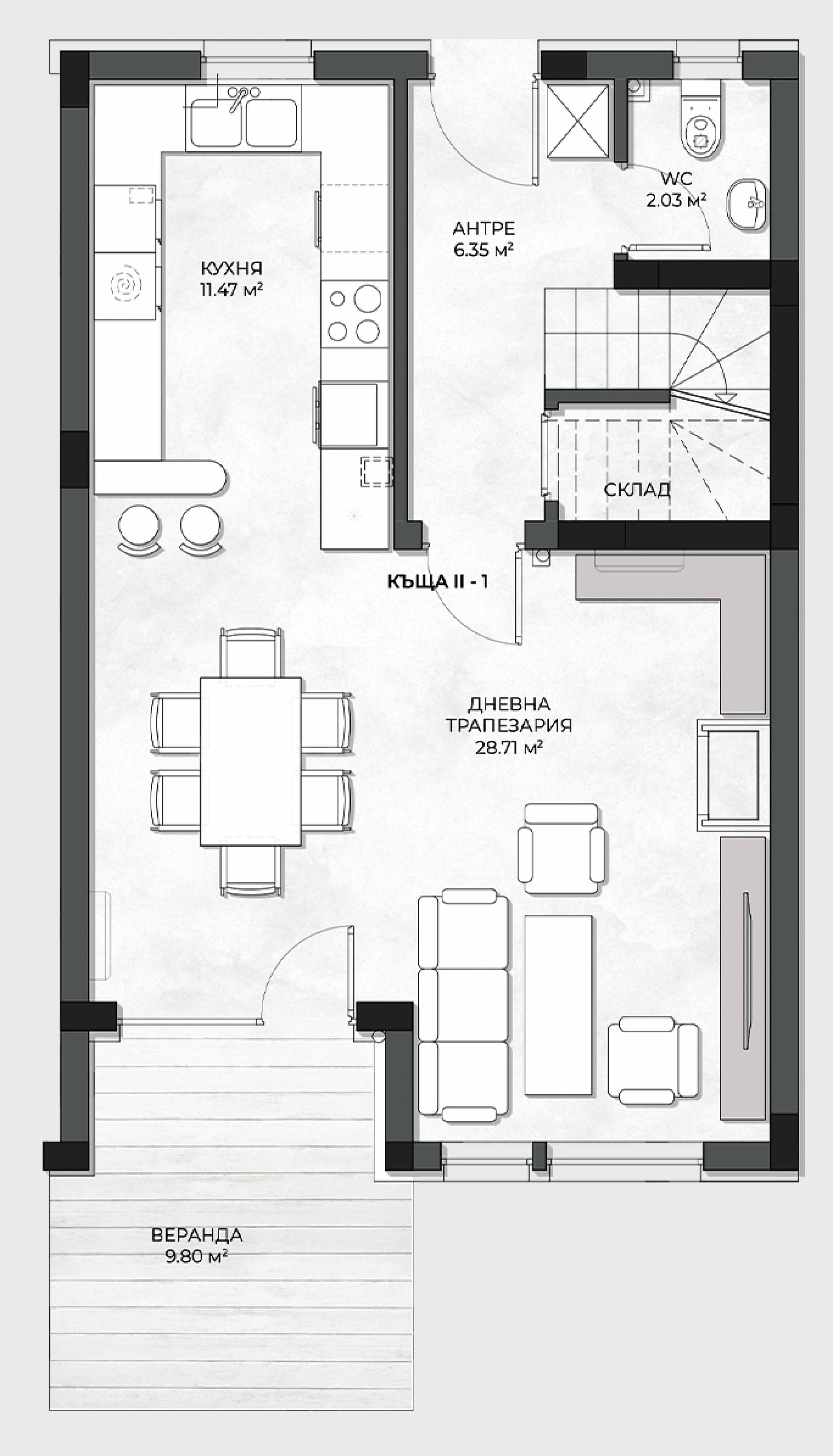 • first floor - 63.44 m2 - spacious living room with dining room and kitchenette, veranda - 9.80 m2, entrance hall, storage room, toilet;