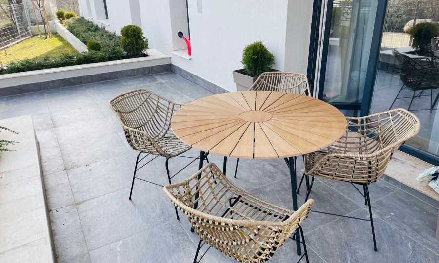 The apartment is located on the ground floor and has a total area of 85.31 sq m, of which 58.88 sq m of built-up area, 7.72 sq m of common areas and 18.71 sq m of spacious terrace, surrounded by a large landscaped yard.