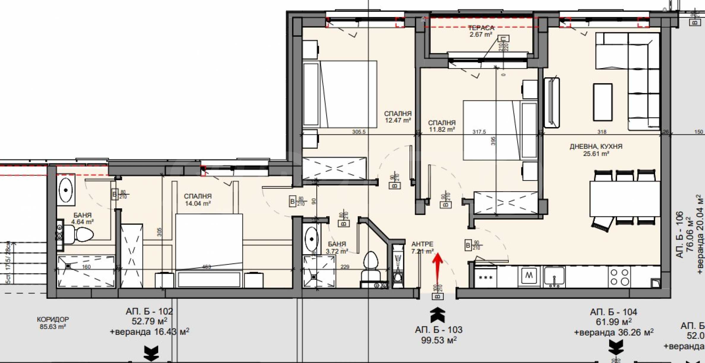 The property is situated on the 1st floor and offers 120.49 sq m of total area (net area 99.36 sq m + common areas 21.13 sq m). It consists of an entrance hall, a living room with a kitchenette, a bedroom with a private bathroom with a toilet, two more bedrooms, a second bathroom with a toilet, a terrace.