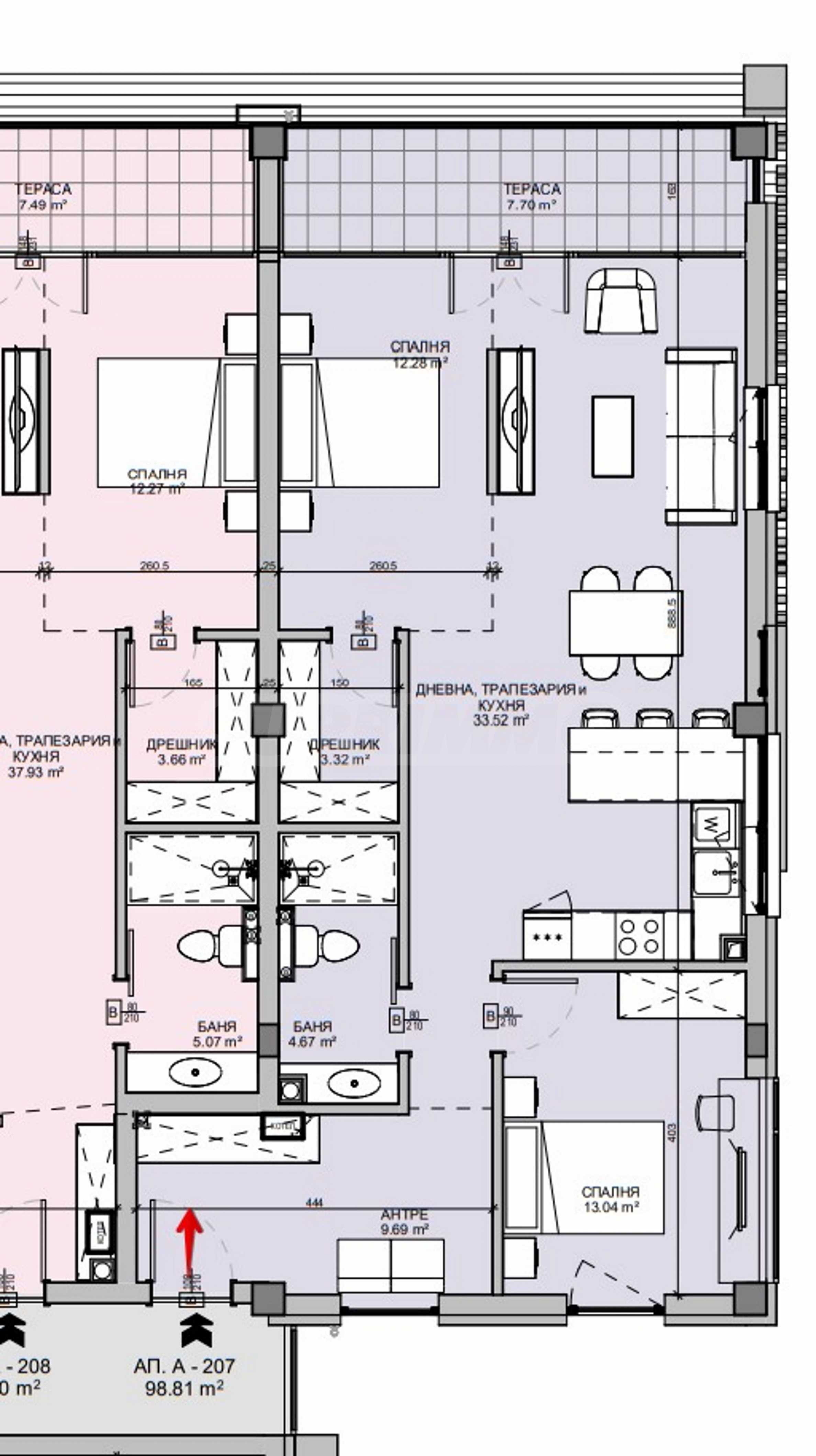 The property is situated on the 1st floor and offers 122.08 sq m of total area (net area 98.82 sq m + common areas 23.26 sq m). It consists of an entrance hall, living room with kitchenette, closet, bedroom, bathroom with toilet, terrace. There is a possibility of redevelopment into a three-bedroom apartment.