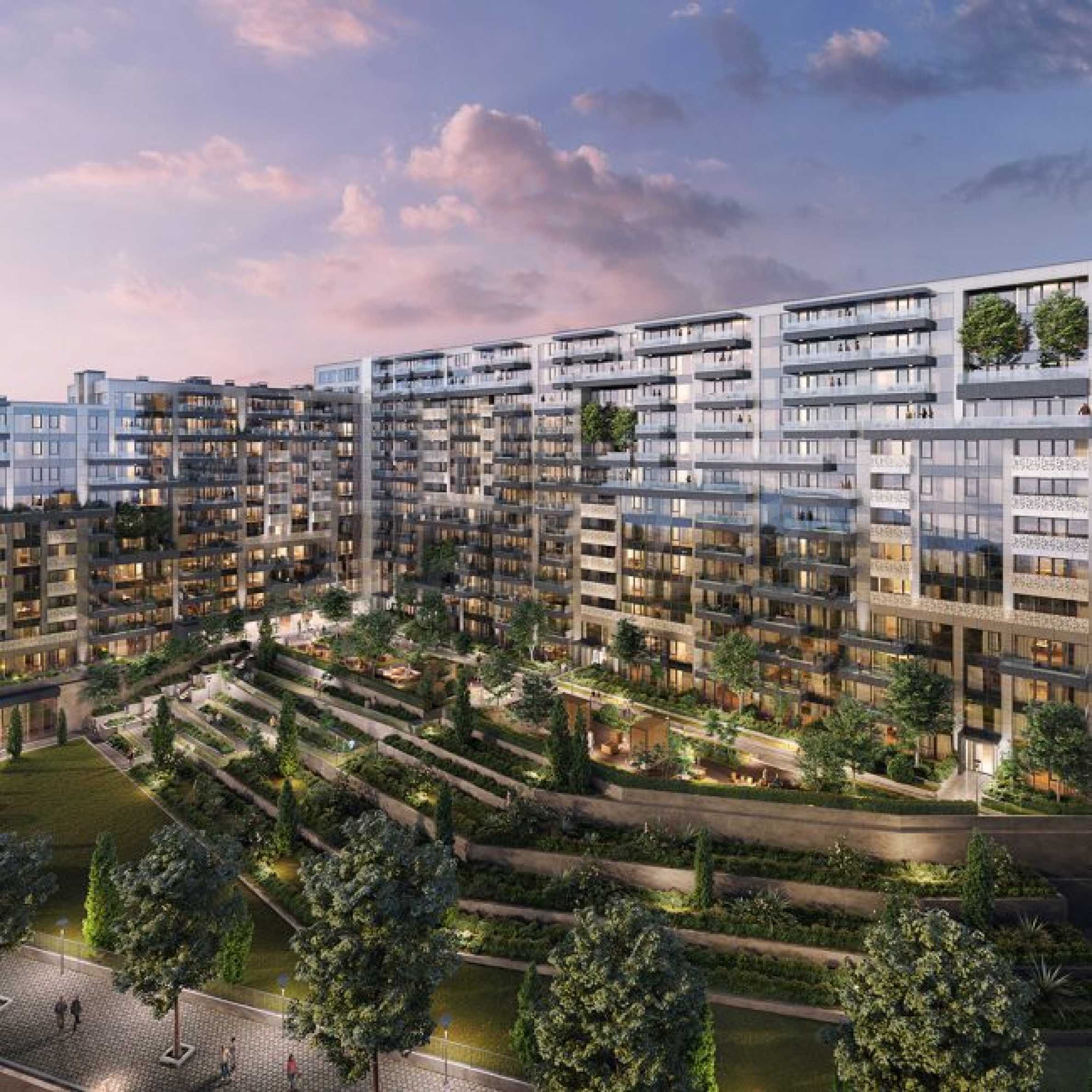 The residence has its own internal park, landscaped spaces and common terraces for relaxation and entertainment. A supermarket, a beauty center, a cafe, shops and a gym on two levels are planned on the ground level.