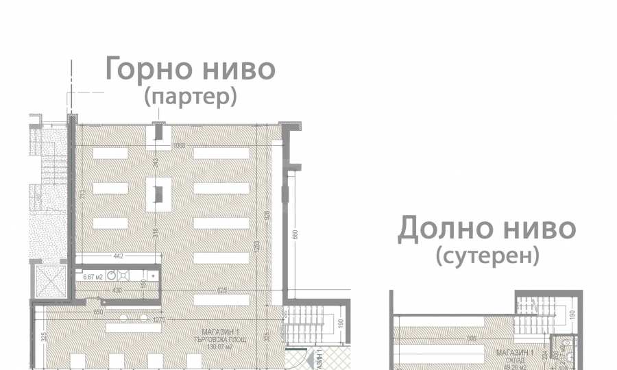 A total of 5 retail outlets are positioned in the commercial area of the building. They are organized on 2 levels (except for the smallest outlet, which is on one level). The upper level is located on the ground floor of the building (floor "0"), and the lower level is located on the first underground level of the building (floor "-1"). The two levels are connected by an internal staircase, individual for each outlet. Each of the entrances to the retail outlets is located directly on the ground floor of the building and has direct access from the street. The retail area itself is separated from the entrances to the residential and office parts of the building. The areas of the available stores vary from 106.32 m2 to 259.76 m2, including common areas. The main and larger storefronts of the retail outlets are located on the ground floor, facing the western facade of the building, from Simeonovsko Shose Blvd. The objects also have small storefronts on the other, eastern side of the building, so that visibility to them is available from both long facades of the building (eastern and western facades).
