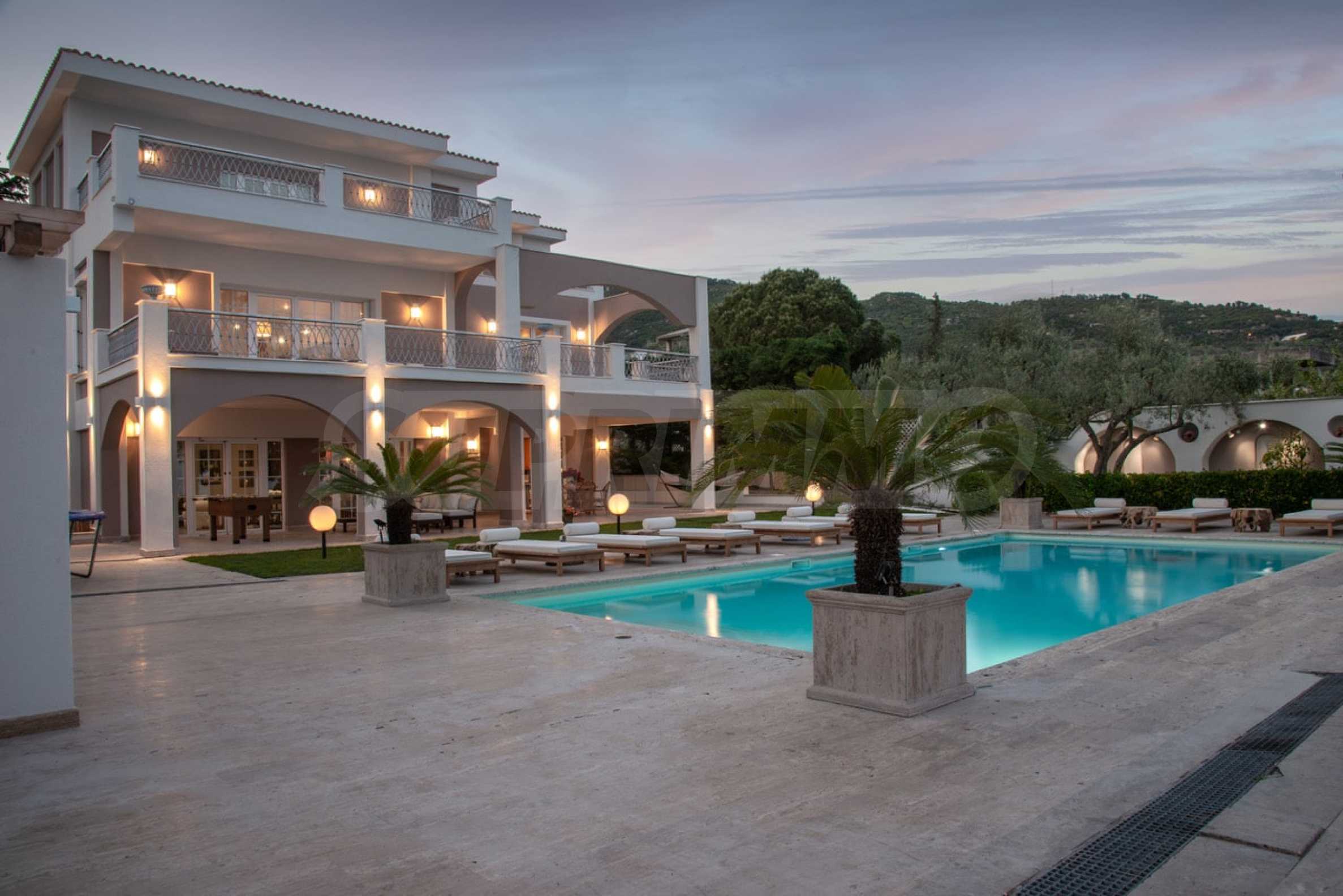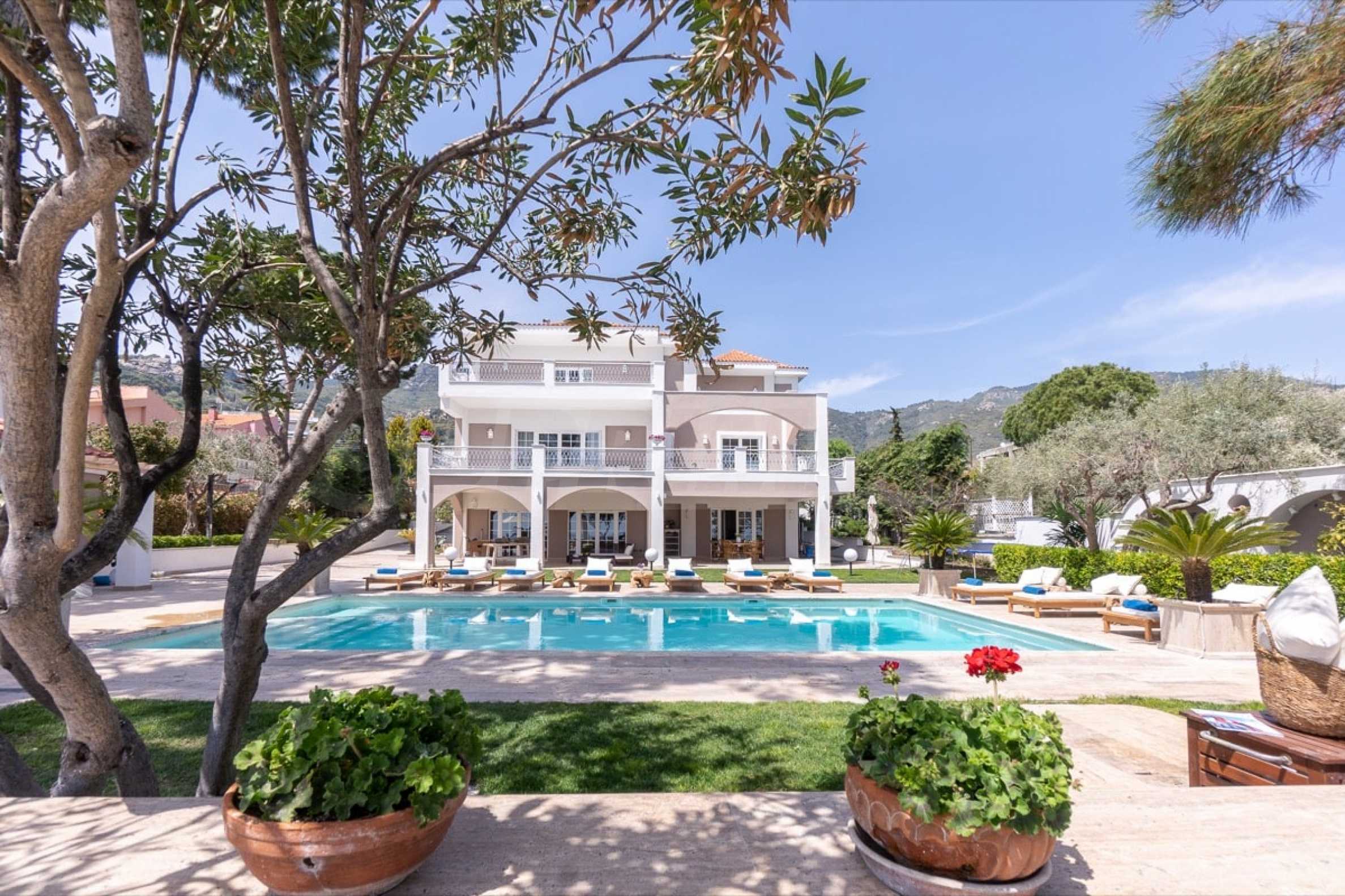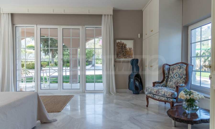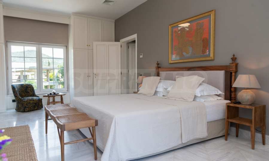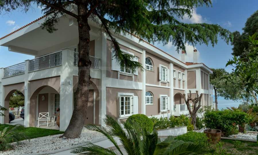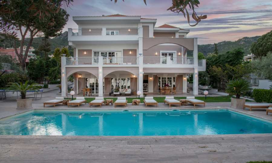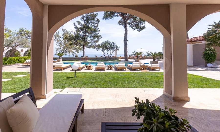 Come into this gorgeous property featuring 6 bedrooms, 8 bathrooms, 2 living rooms and 2 fully equipped kitchens, also with a playroom in the semi-basement. Five of the bedrooms have their own bathroom, as well as an outdoor sitting area, veranda or terrace. In the extremely well-maintained yard arranged with different types of trees, palms, pines, olives, oranges and lemons, you will enjoy a swimming pool, a summer kitchen with a pizza oven and BBQ, a dining room, and many corners from which you can admire the unique views of Aegean Sea.