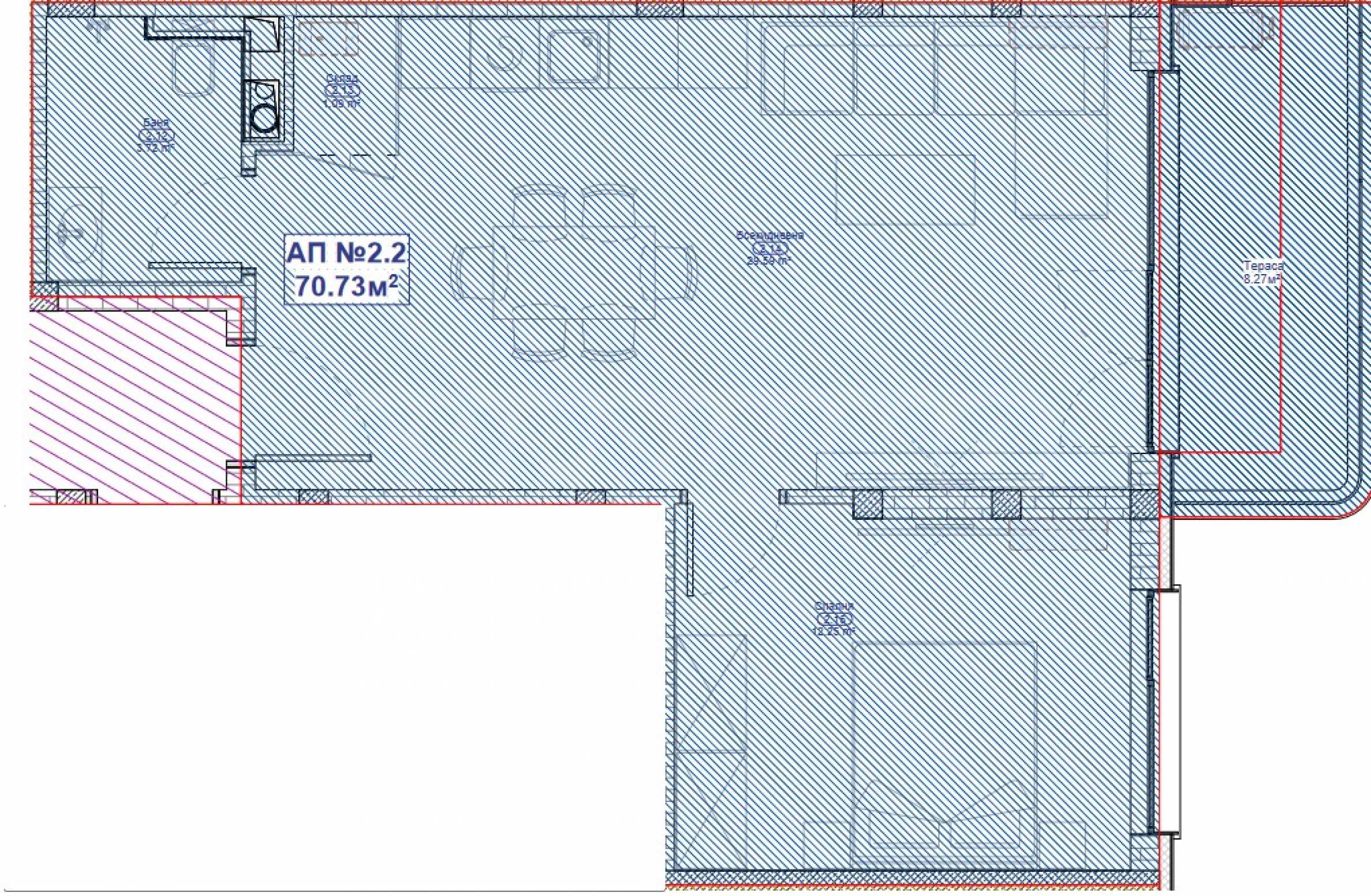 The property has an area of 70.73 m2., located on the 2nd floor facing east and consists of: entrance hall, living room with kitchen, bedroom, bathroom with toilet, closet and terrace. It is issued in the degree of completion according to BDS, putty and putty.