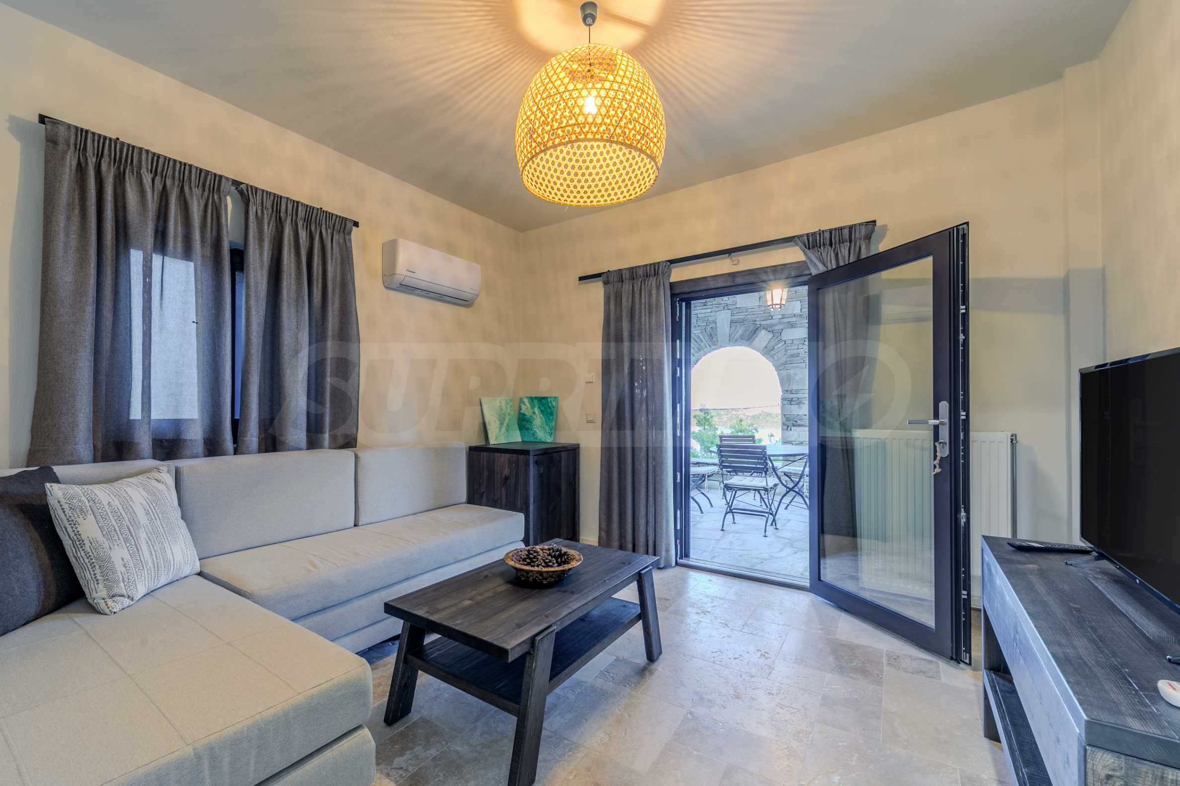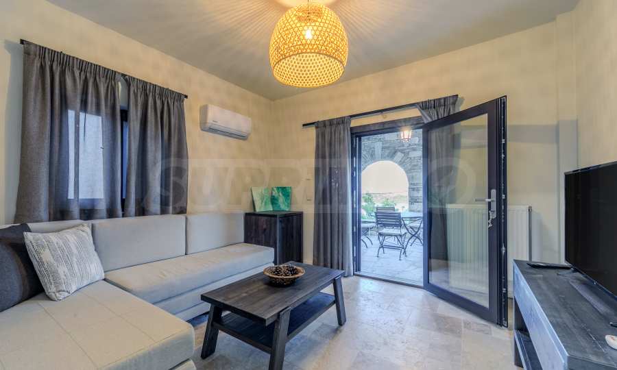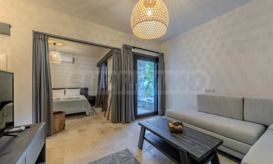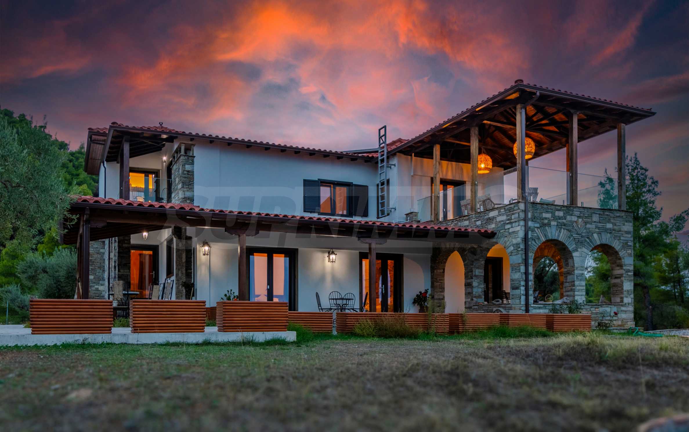 The majestic, fully renovated villa towers above the crystal clear waters of the Aegean Sea and offers stunning views and landscapes stretching across the island of Diaporos to the sacred Mount Athos/Mount Athos.