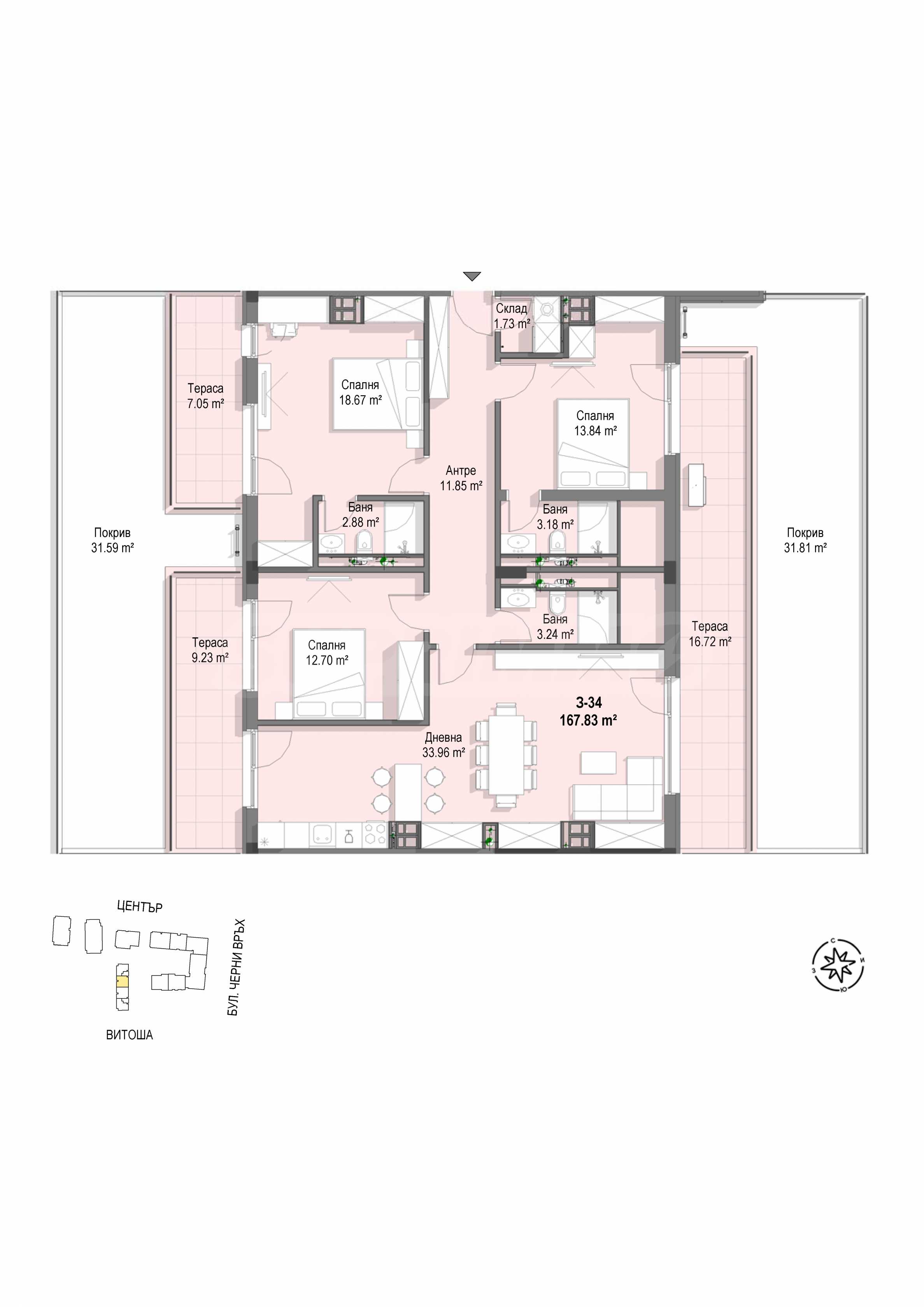 The apartment is functionally distributed and offers spacious rooms with regular shapes. The total area of the apartment is 198.16 m2., of which the net area is 167.83 m2. and the roof terrace is 63.40 m2. The distribution includes: