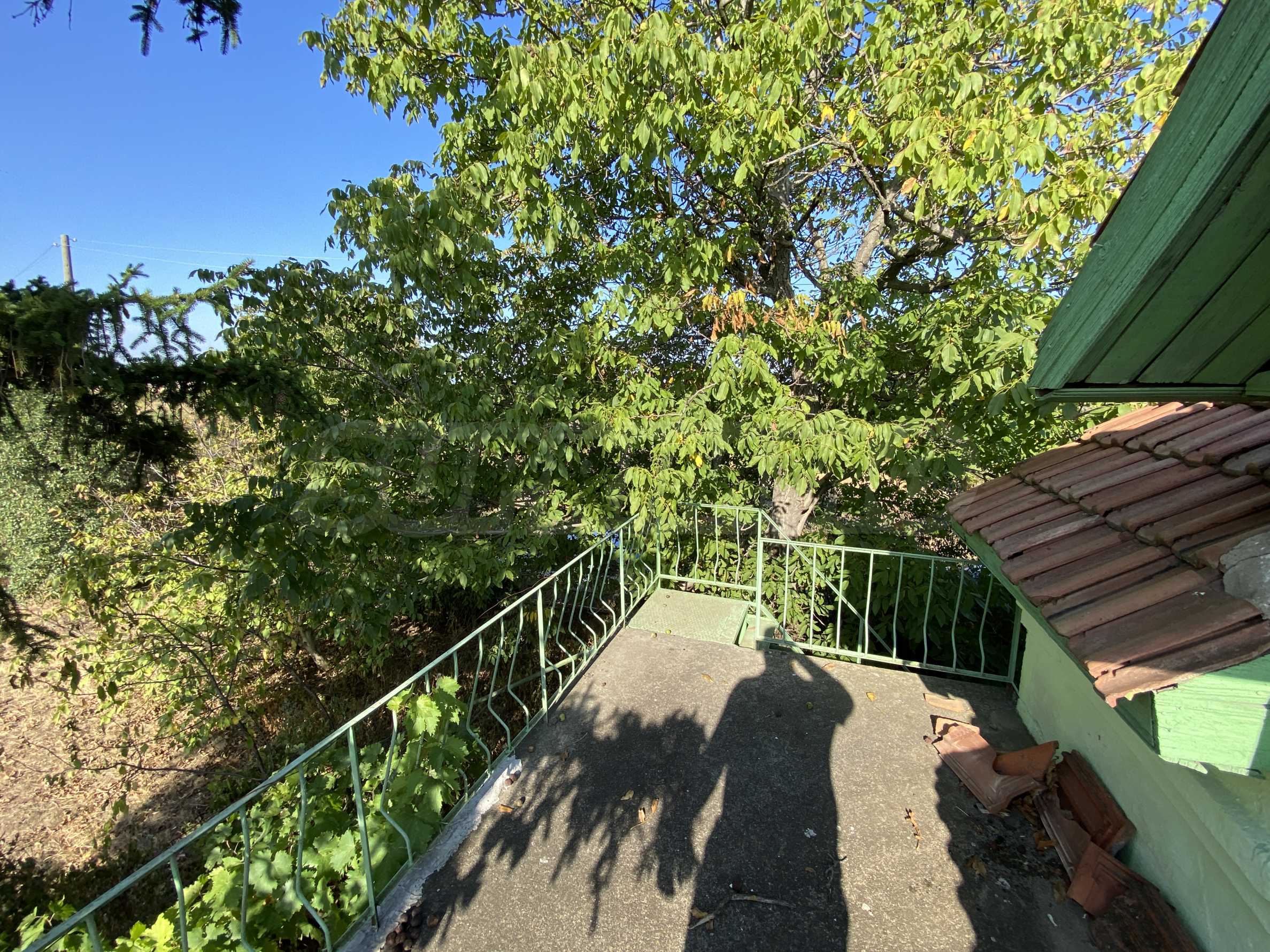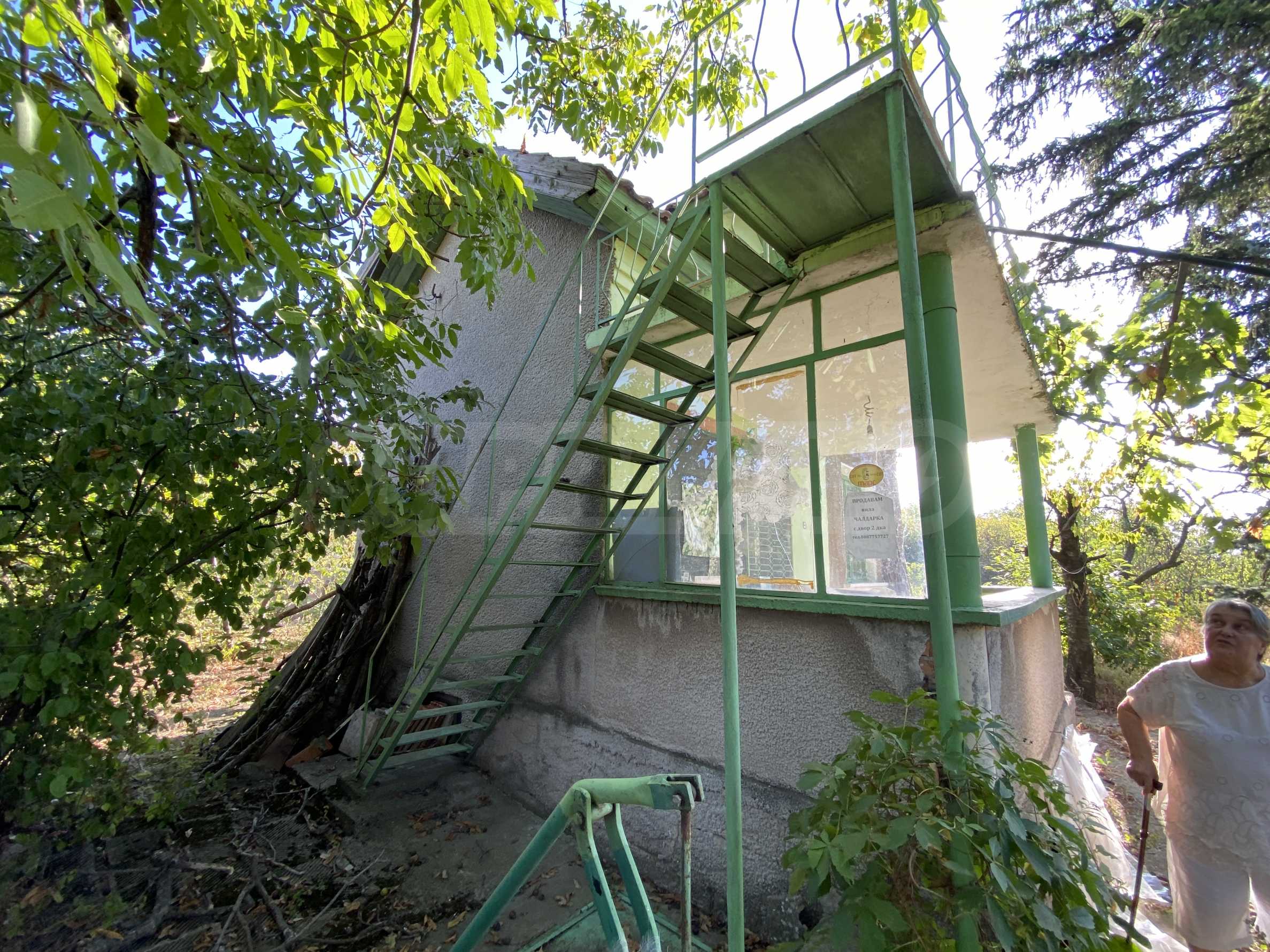 The property has an area of 25 sq.m., suitable for weekend use. The house consists of a veranda and two rooms. A metal staircase leads to the attic.
