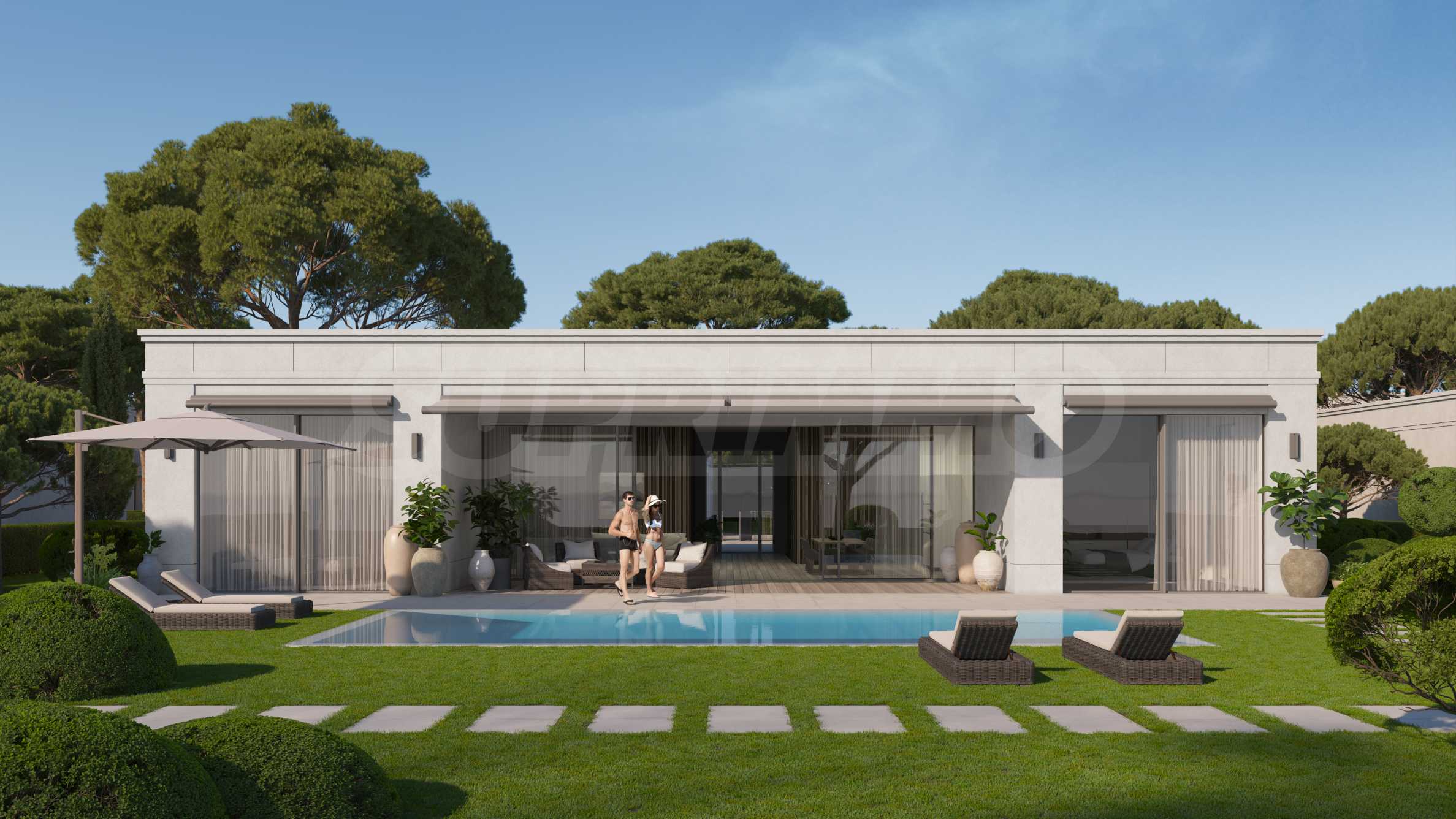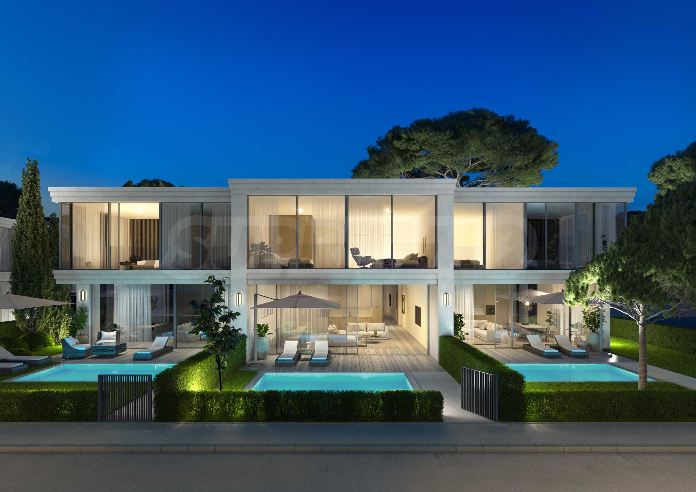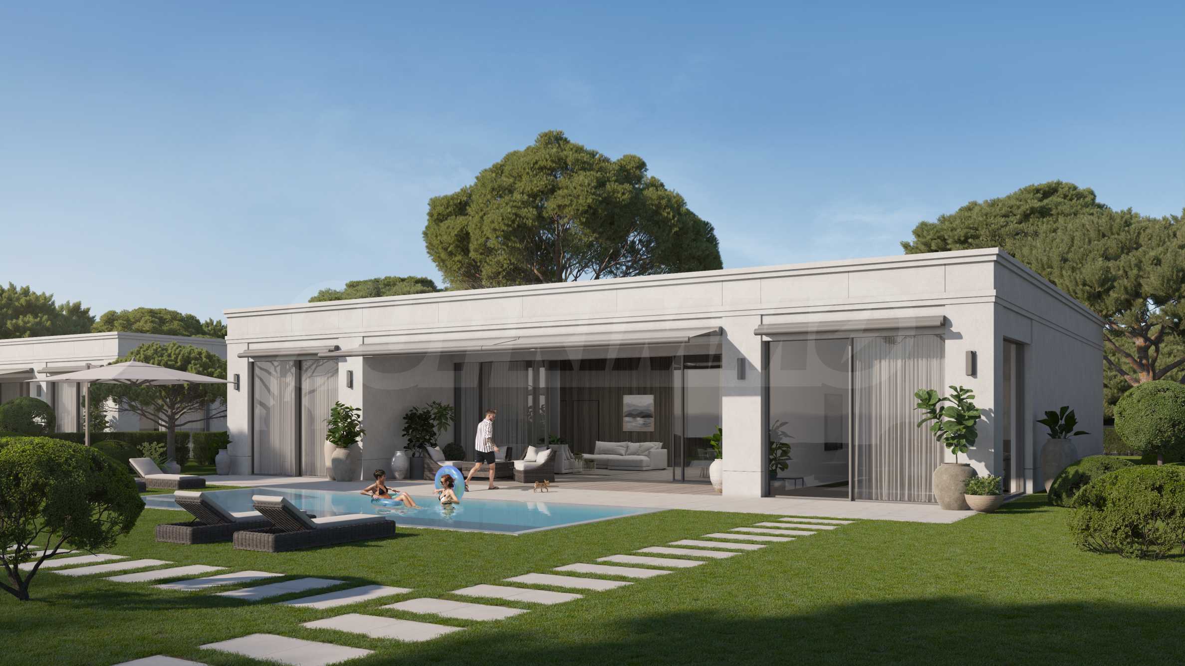 • on the first line - 9 one-story villas, each with its own yard and option for a swimming pool, with 3 outdoor parking spaces;