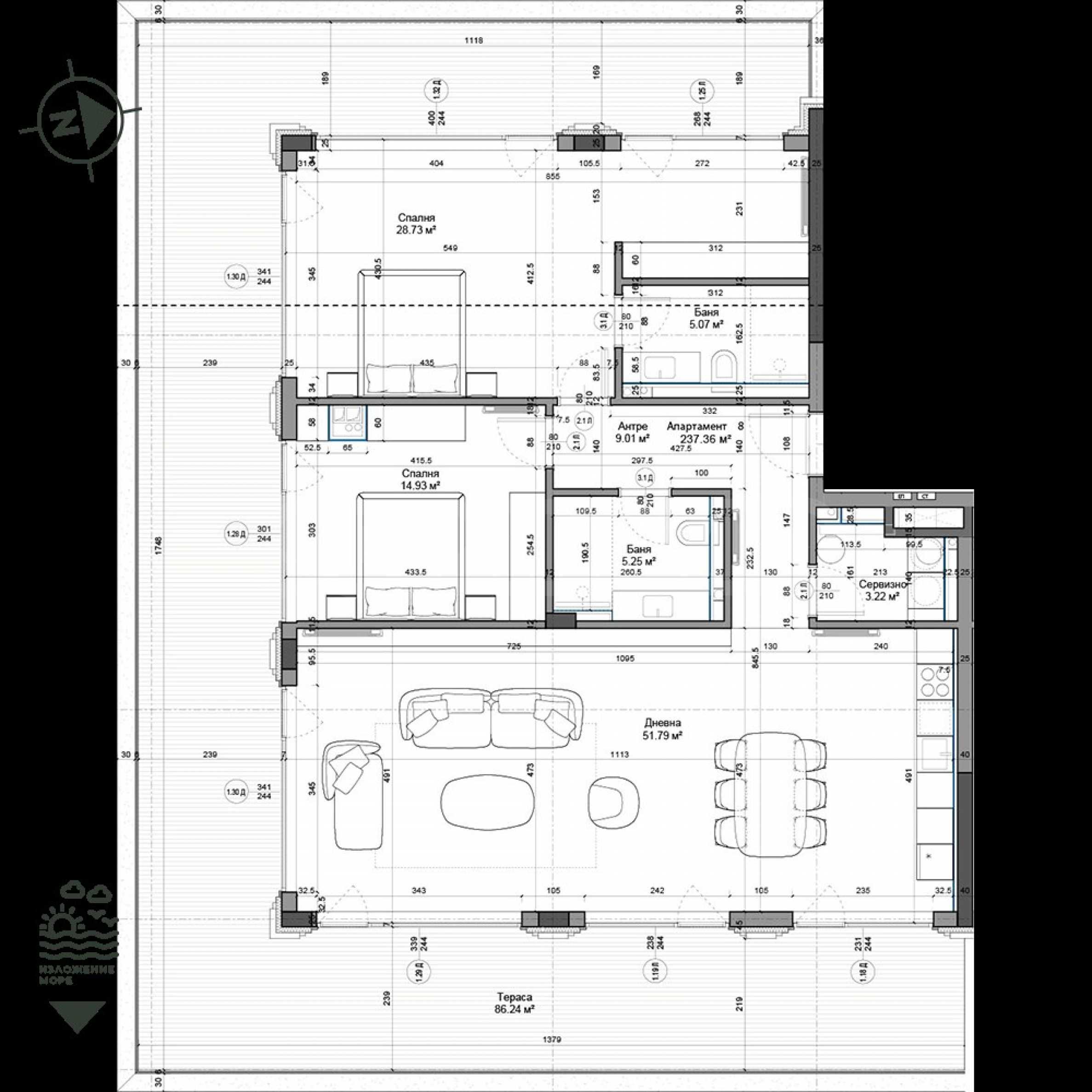 The property we are presenting for sale is part of a three-story building No. 1, Entrance "A", out of a total of 4 buildings. It is located on the top terraced floor, facing the sea - east/west/south, and has a total area of 263.60 m2.