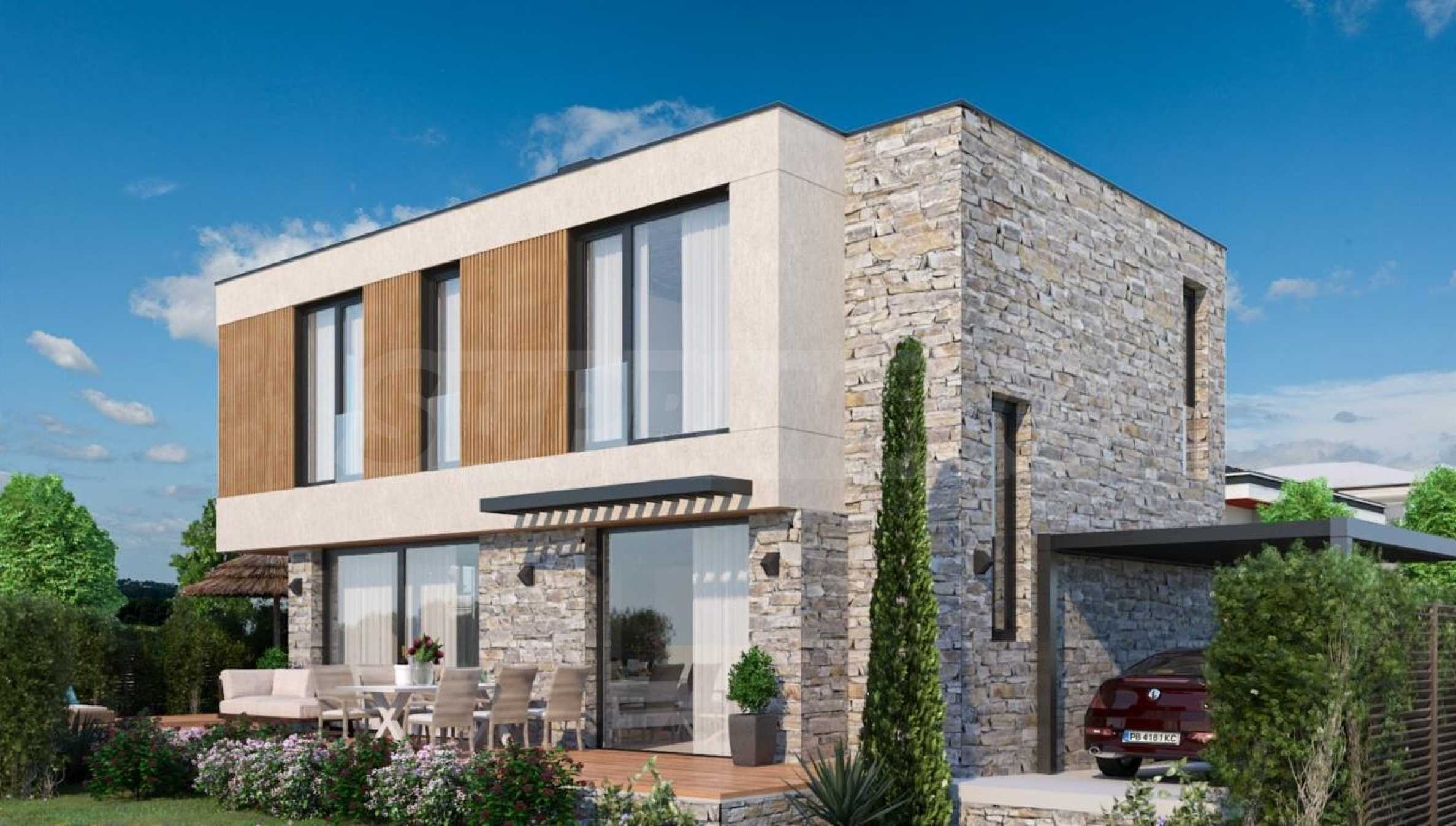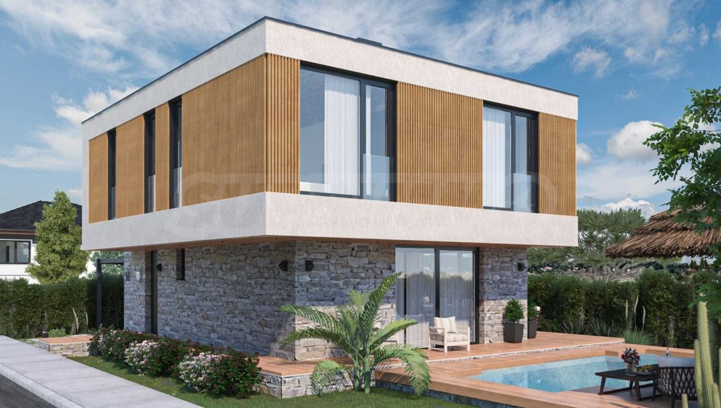 • fully finished facade with mineral silicone plaster, natural facade stone and composite wood slats;