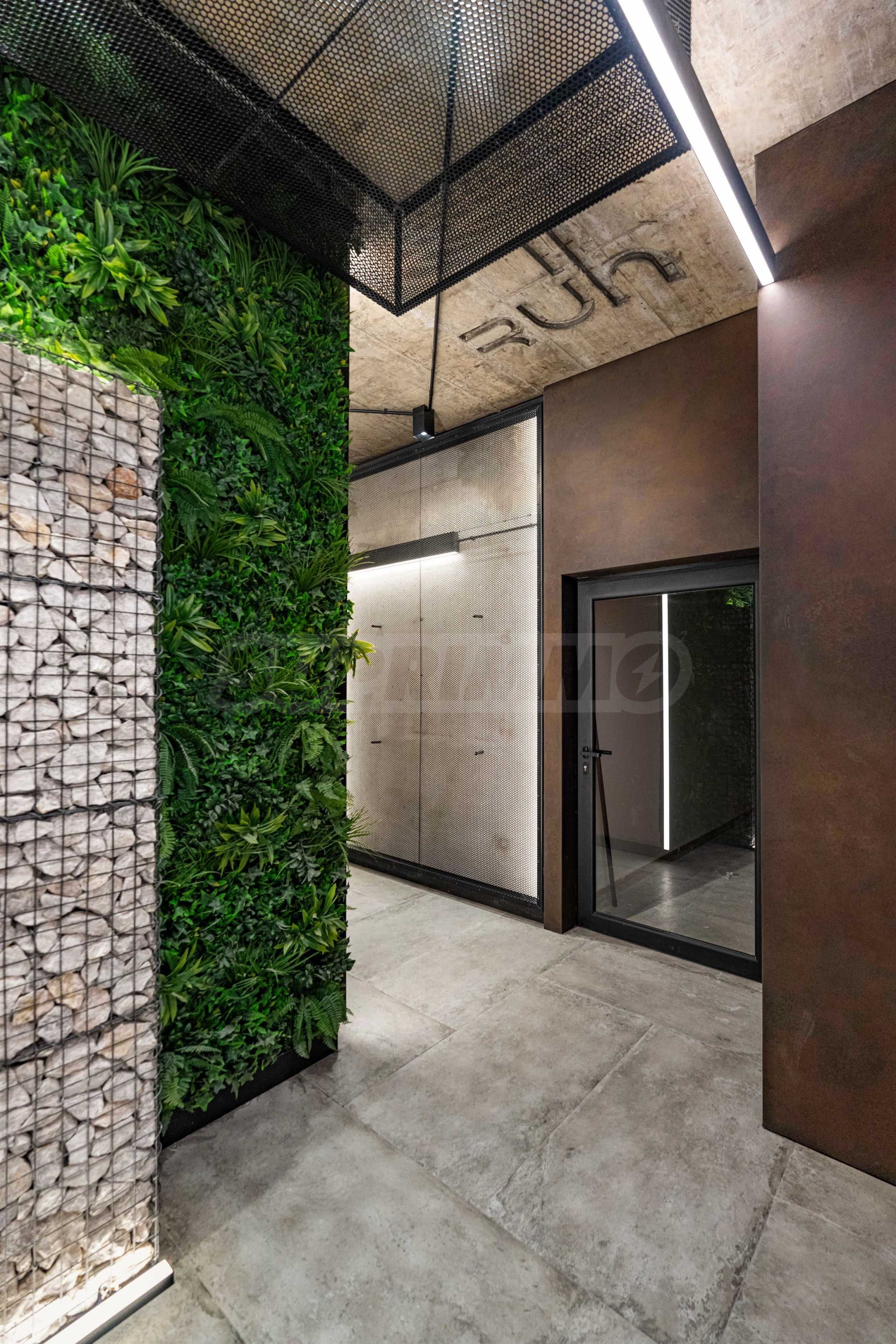 The sought-after play in the plasticity of protruding and sinking glass volumes in the common facade is combined with a motif of vertical green walls, aesthetically hiding air conditioning units. All terraces, including those on the top floor, are designed as covered in view of the sun. The flooring of the terraces is a type of double floor of granite tiles. The openwork railings are made in two versions - glass triplex or with a metal frame with expanded metal mesh in black according to architectural detail, following the compositional idea. The additional composition of the facade linear LED lighting is purposefully sought to emphasize the main idea at night. The idea of the dynamic composition is continued in the project for landscaping the main courtyard of the complex in combination with gabions, park furniture and lighting and a water area.