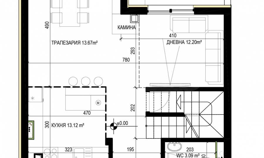 - On the ground floor (elevation ±0.00) there is a living room with a mezzanine in the recreation area with a height of up to the third floor, a dining room and a kitchen, connected to an outdoor terrace and a toilet; a yard and a barbecue area;