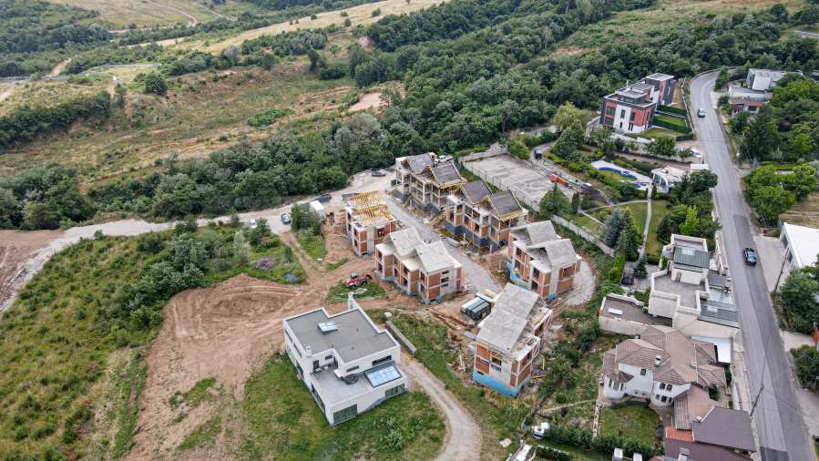 It consists of 12 semi-detached single-family houses, grouped into six elegant Alpine-style residential buildings, with a total built-up area of 2,506 sq m. It has its own spacious green yard and a completely new infrastructure, as well as a completely new, private asphalt road.