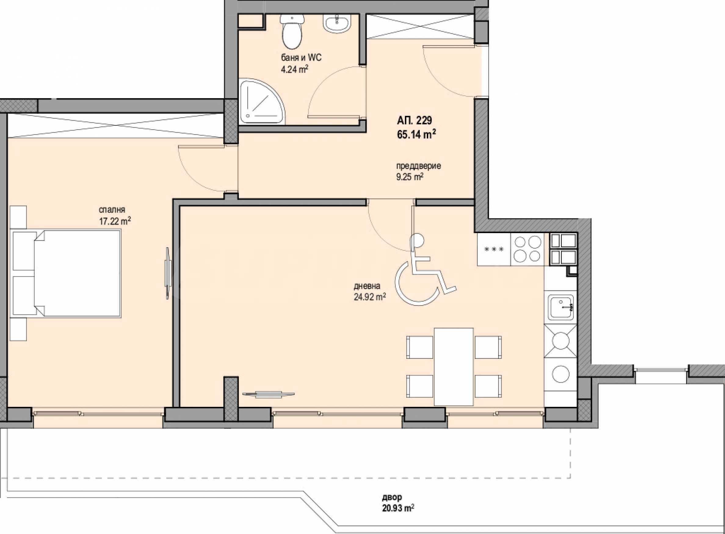 The property of 77.04 m2. is located on the 1st floor in entrance "A" and has a western exposure. It consists of an entrance hall, bathroom with toilet, living room with kitchen, bedroom, yard of 20.93 m2.