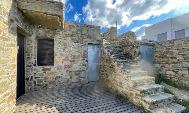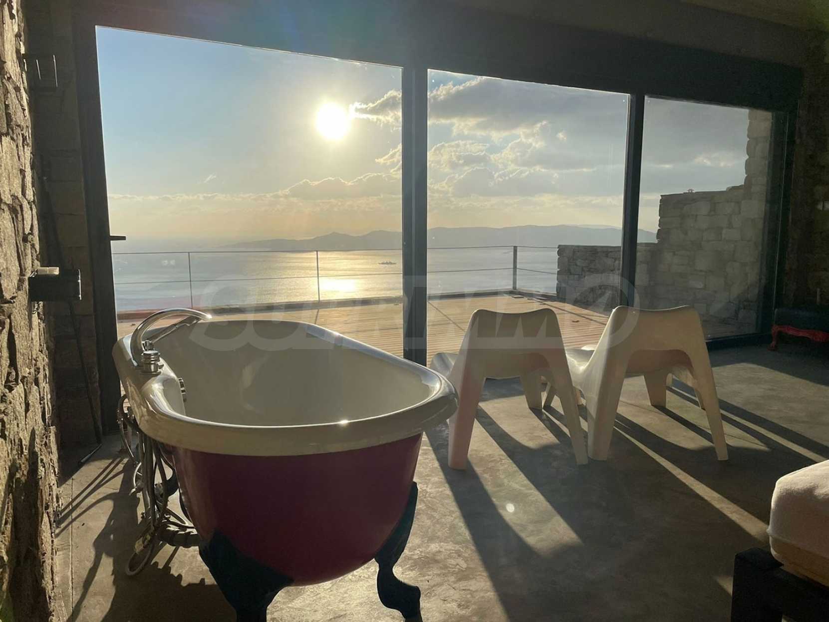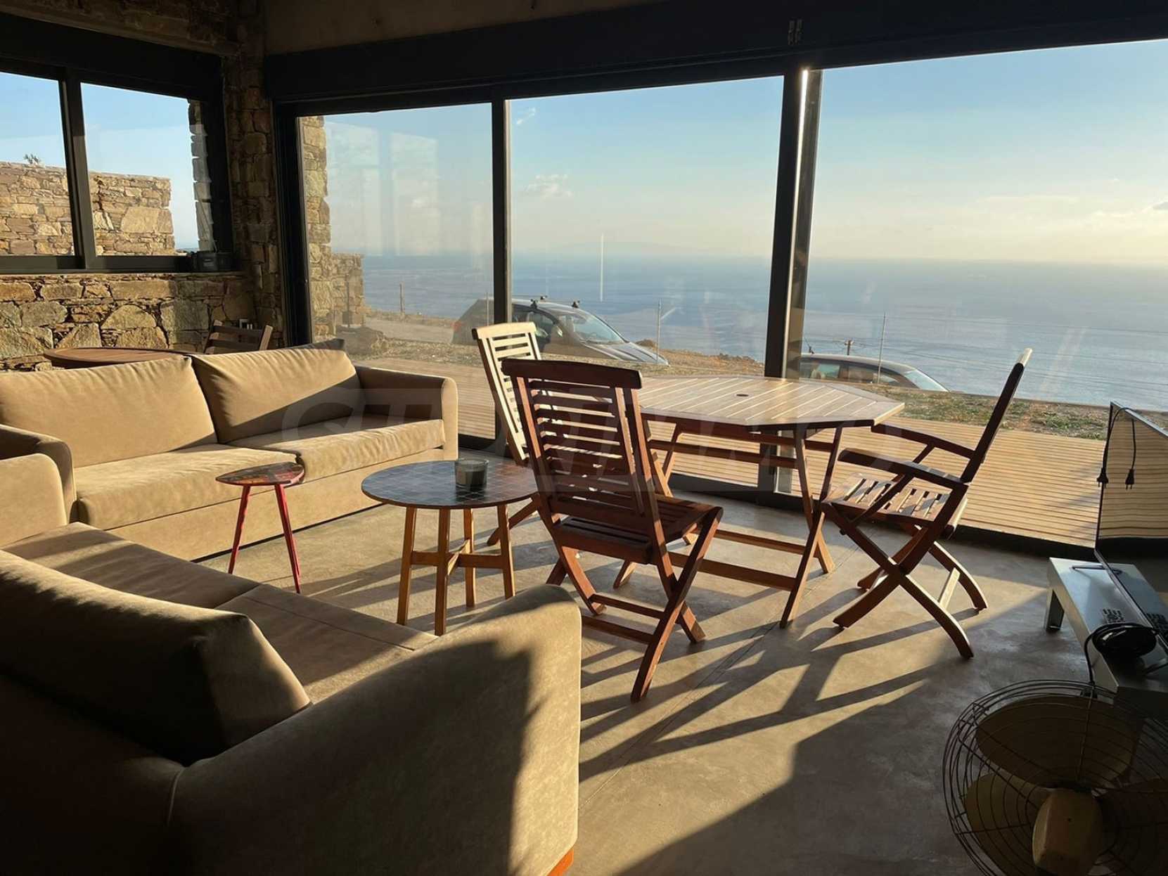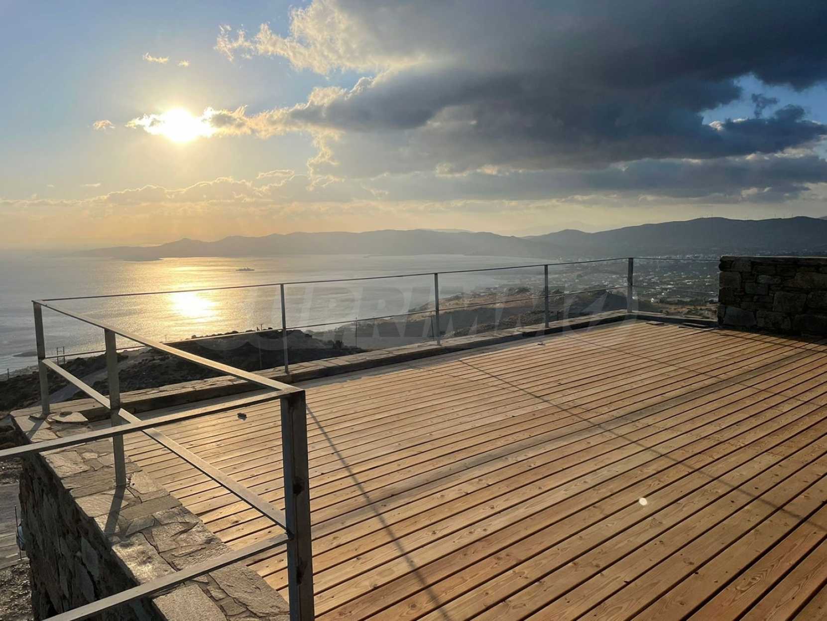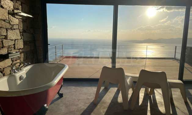 The unique staircase leads to a bedroom with a kingsize bed with breathtaking views. There is a bathtub right next to the bed for you to create perfect moments every day. The spacious balcony can very well accommodate up to 10 people, and offer you outside living and working space to enjoy the clearest air of Greece and its seaside.