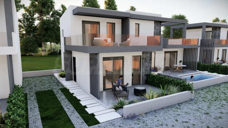 • 9 two-story houses on two levels with an area of 74.02 m2., consisting of a living room with kitchenette, 2 bedrooms, 2 bathrooms and a swimming pool in the yard.