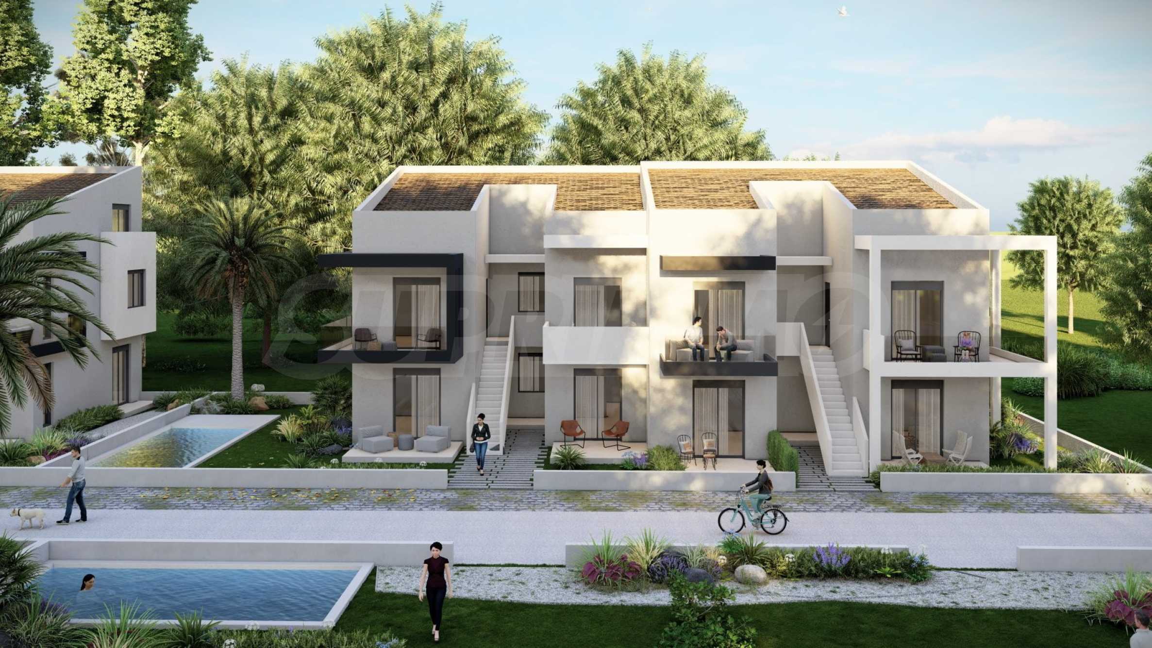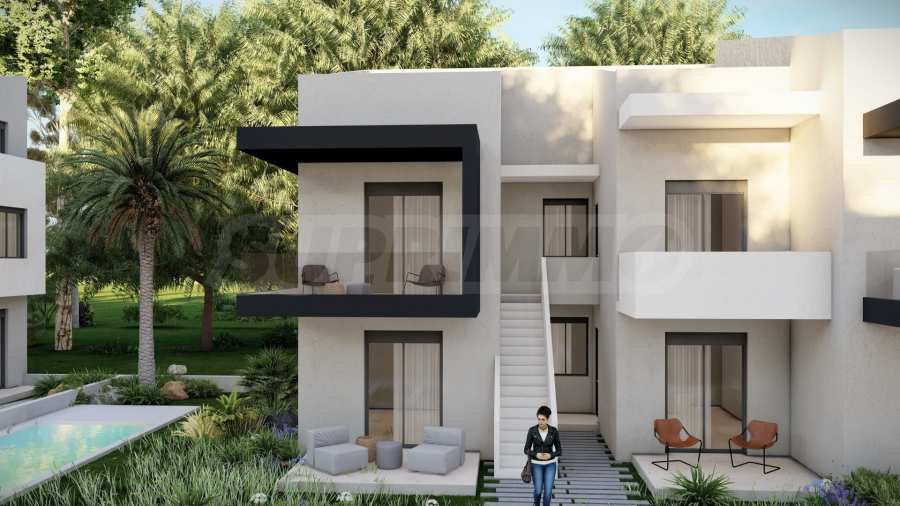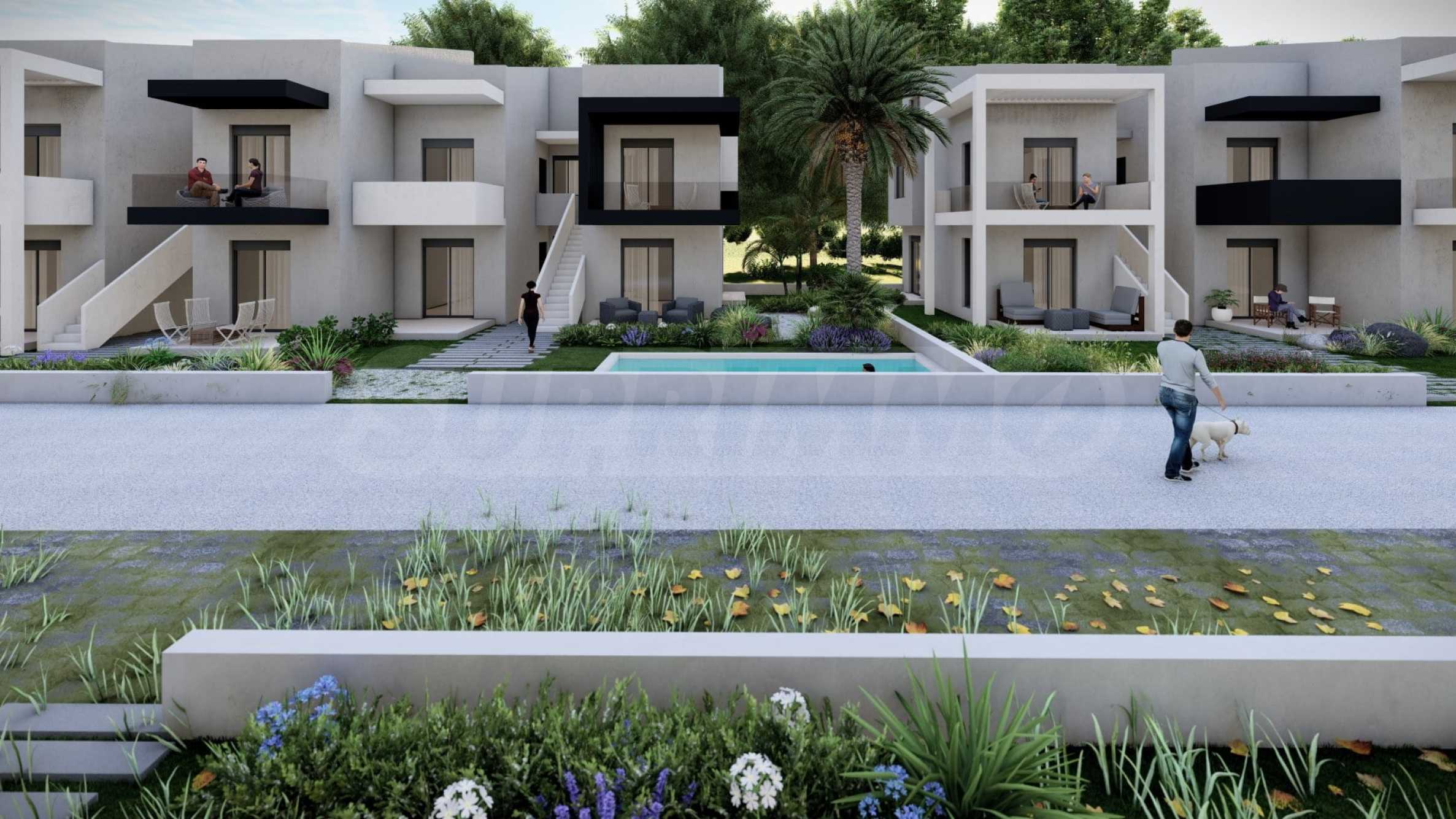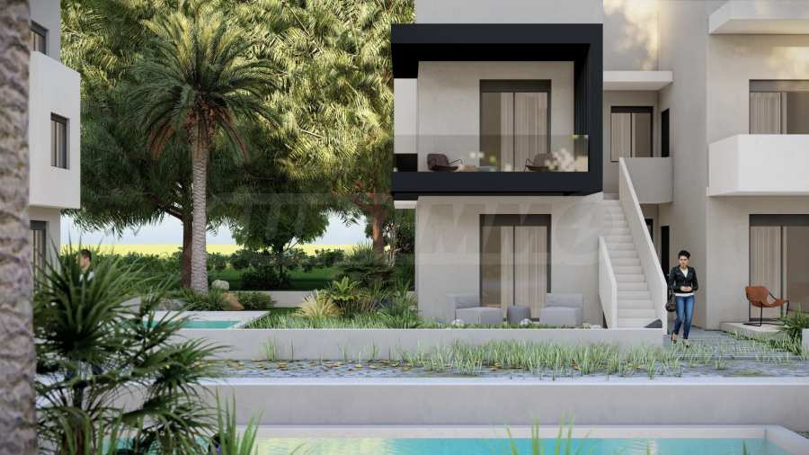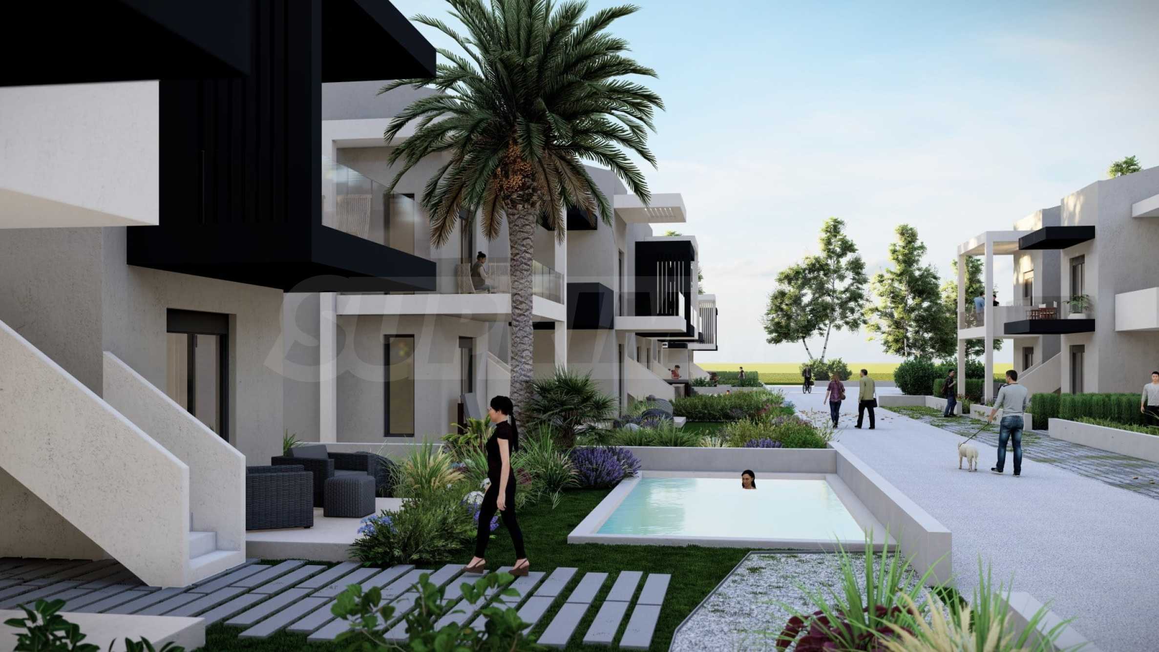 In the beautiful gardens between the buildings, there are natural stone paths that lead to relaxation areas, as well as to communal swimming pools, which contribute to the feeling of coolness and tranquility and are an excellent place for relaxation.