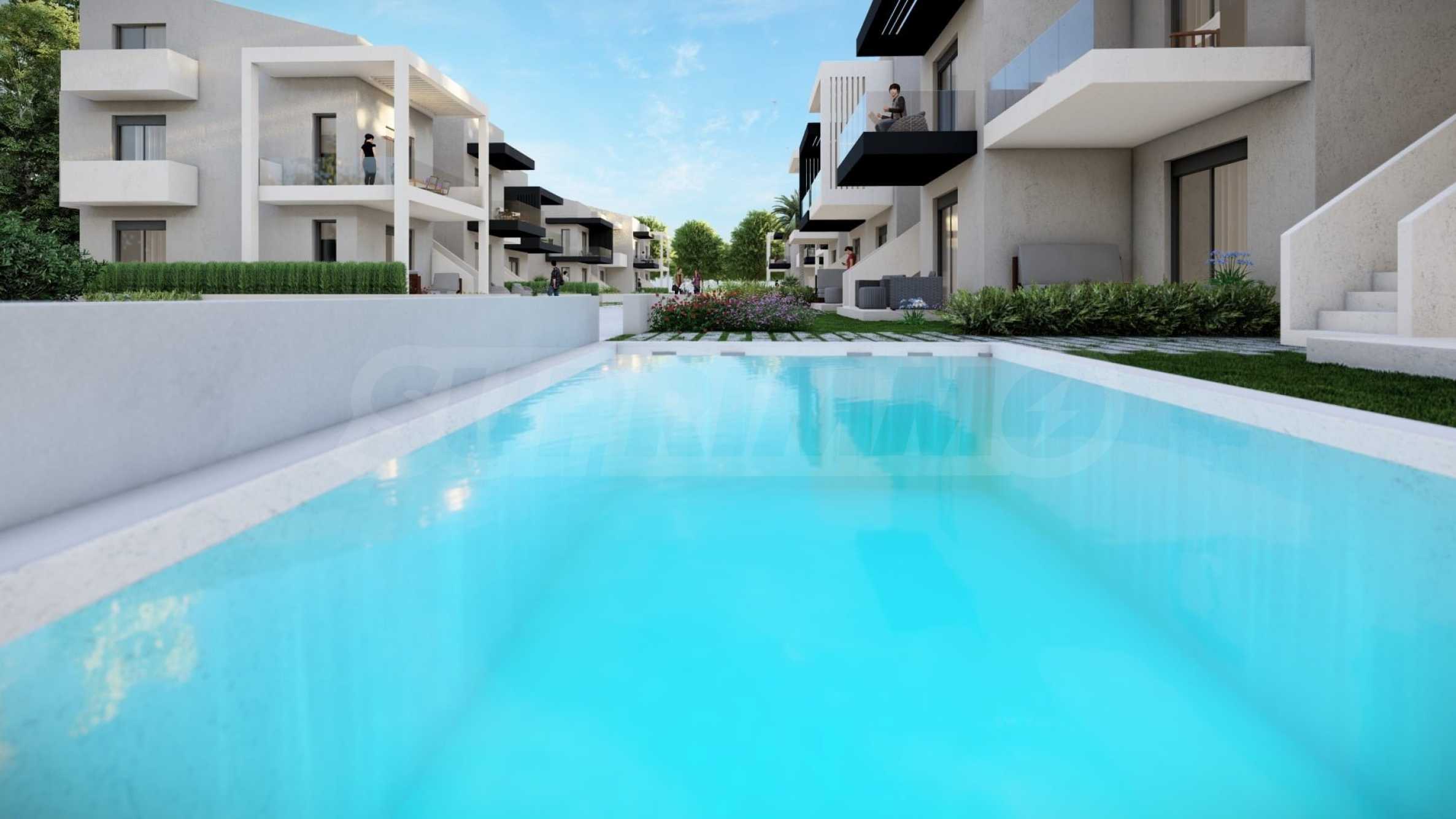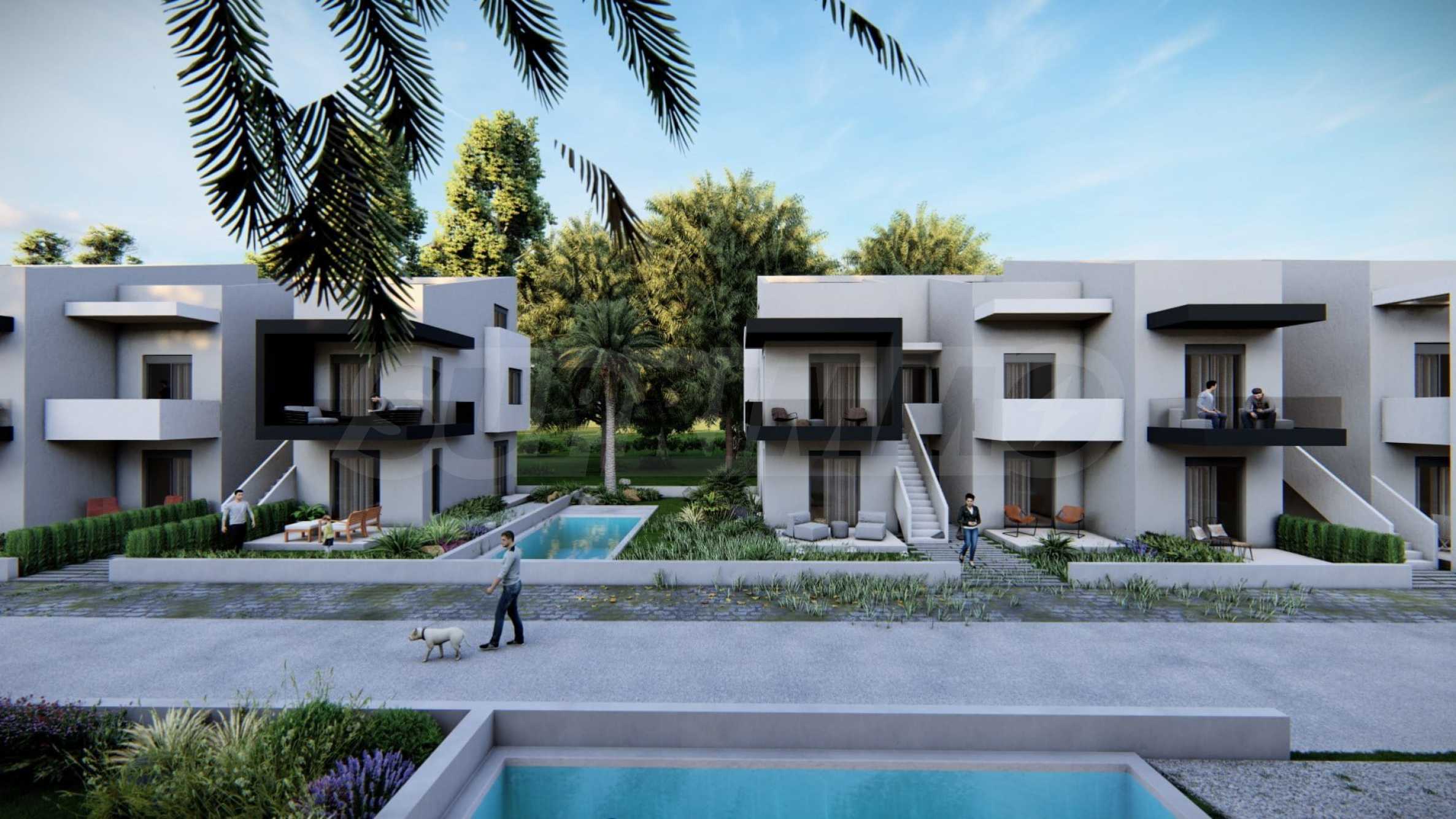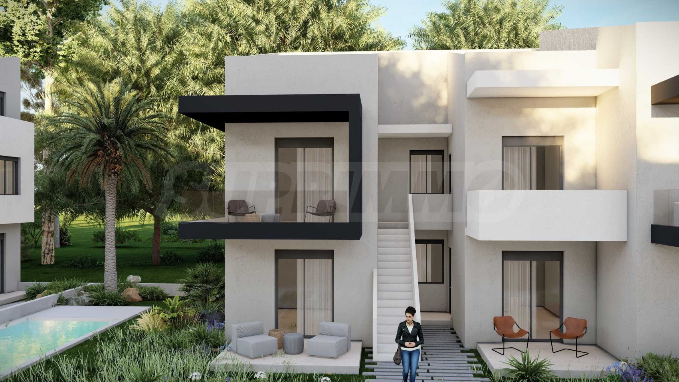 In the beautiful gardens between the buildings, there are natural stone paths that lead to relaxation areas, as well as to communal swimming pools, which contribute to the feeling of coolness and tranquility and are an excellent place for relaxation.
