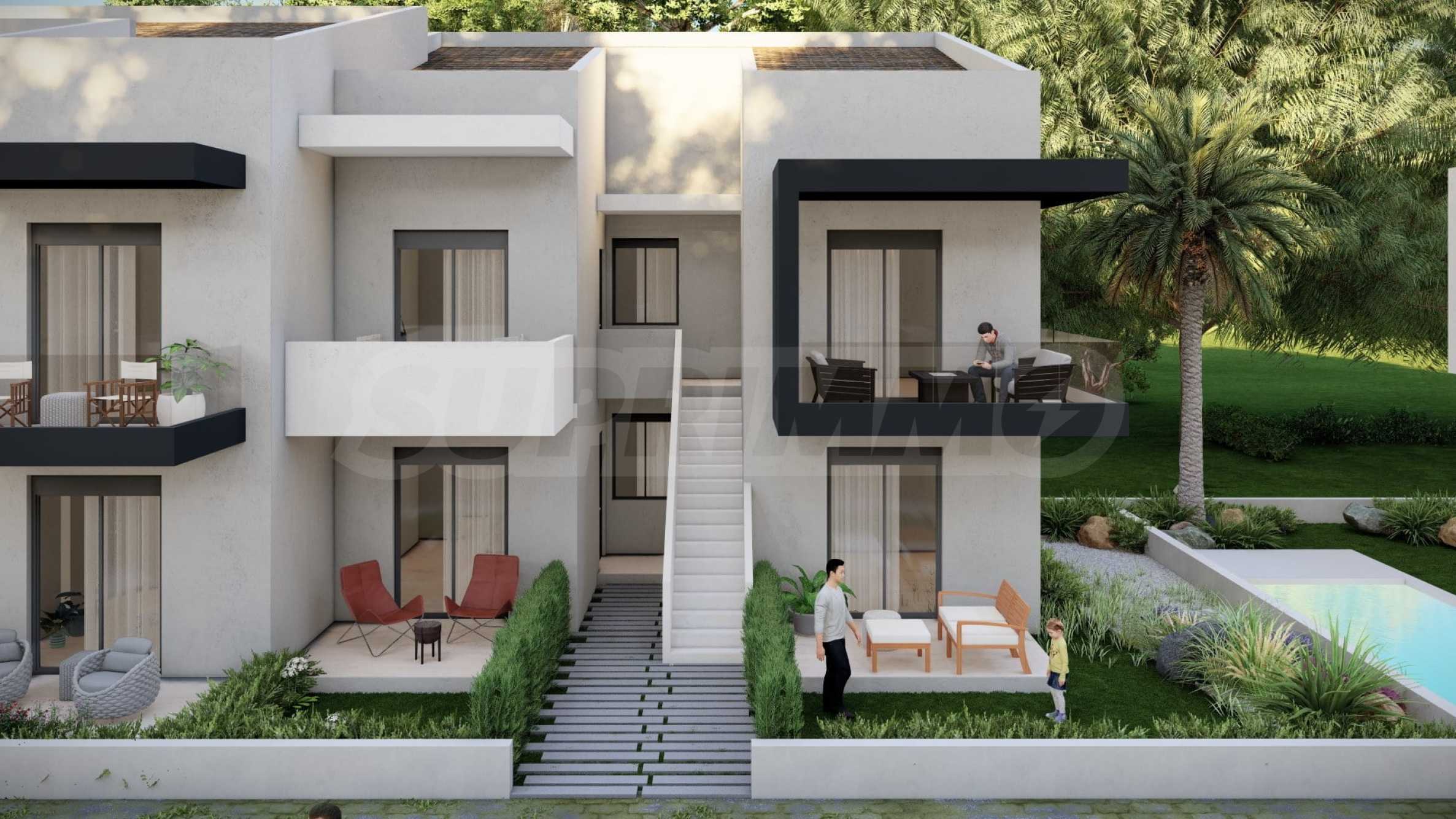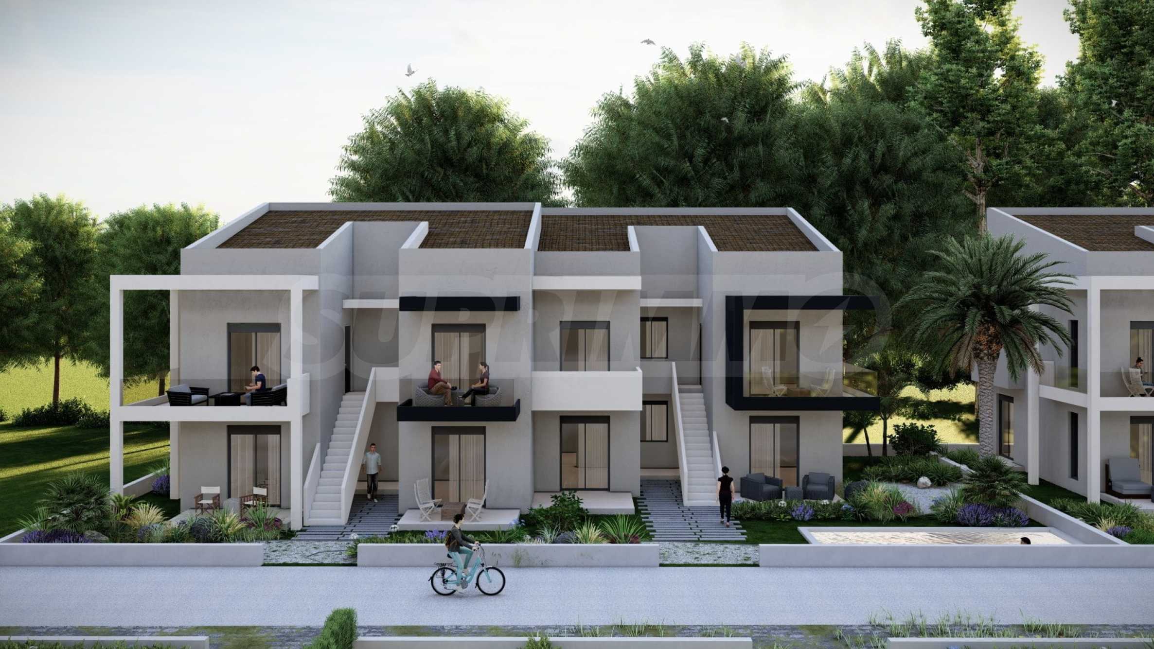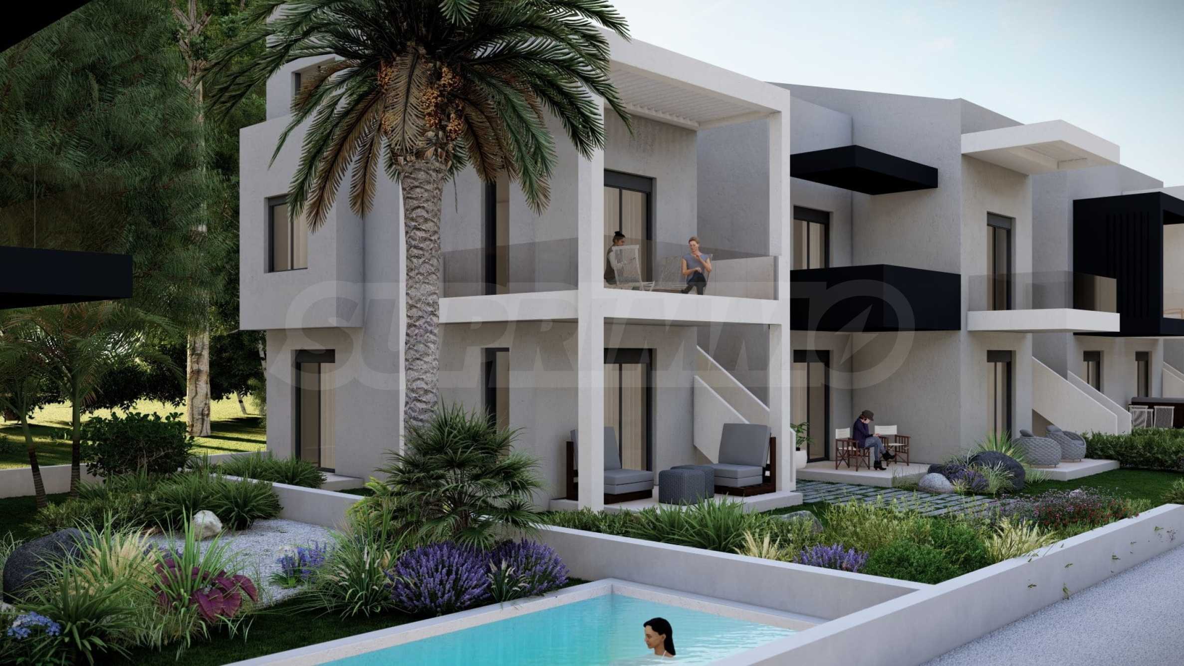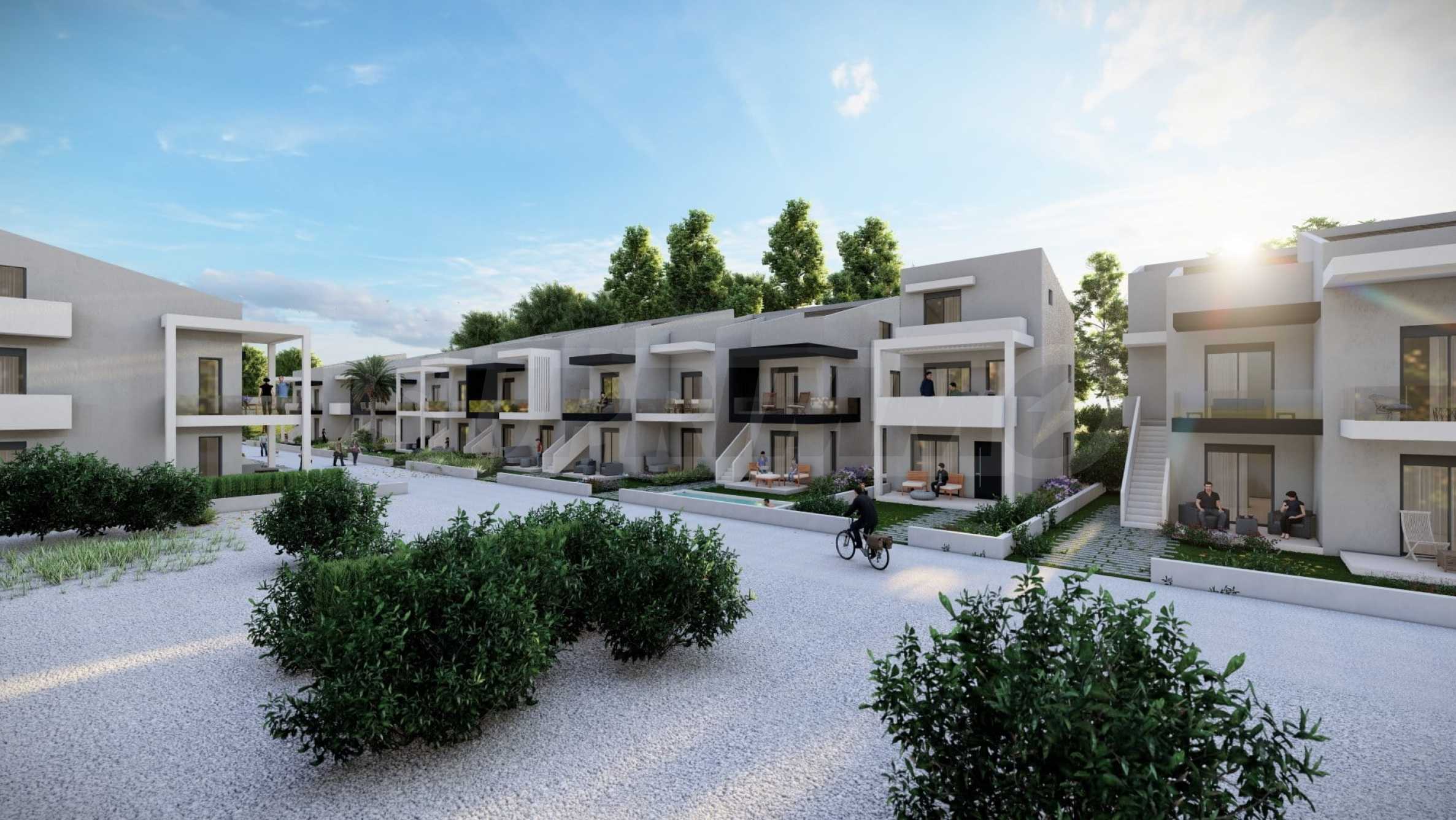 In the beautiful gardens between the buildings, there are natural stone paths that lead to relaxation areas, as well as to communal swimming pools, which contribute to the feeling of coolness and tranquility and are an excellent place for relaxation.
