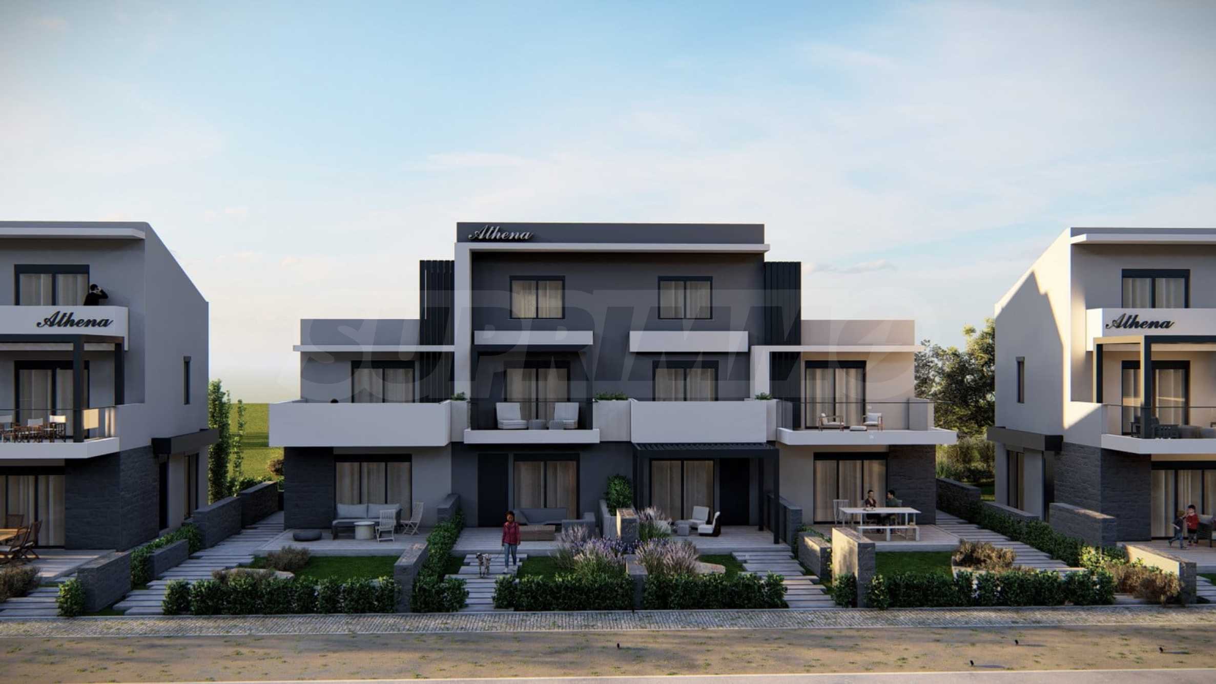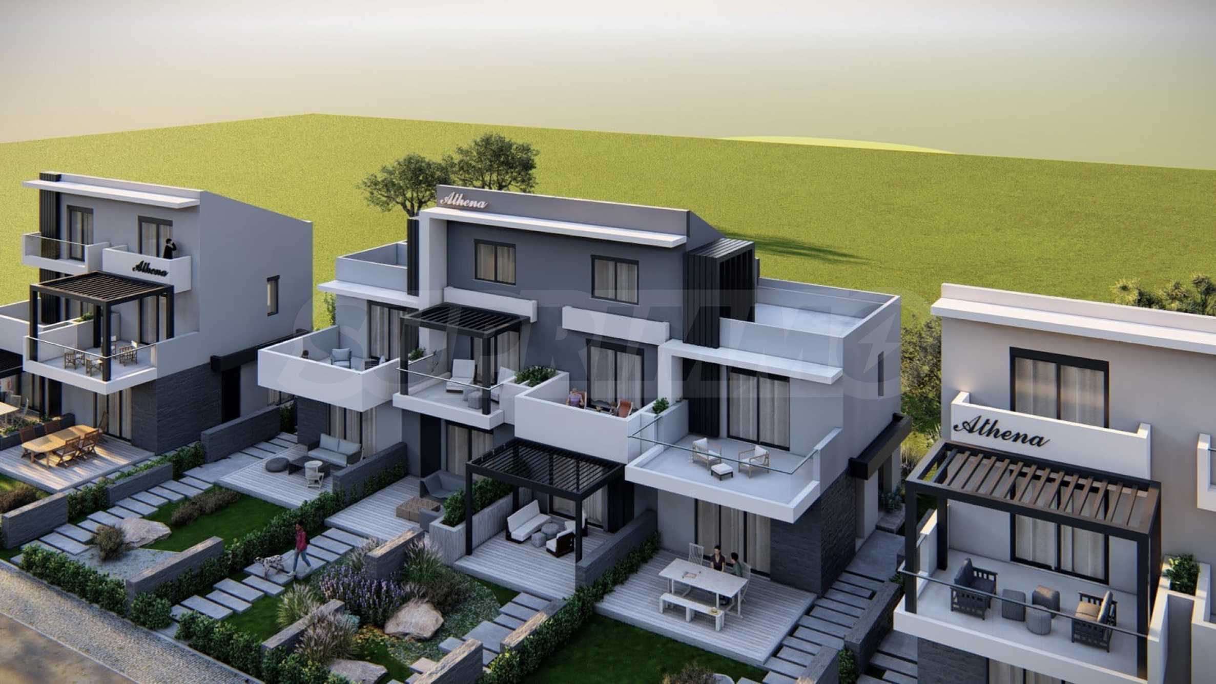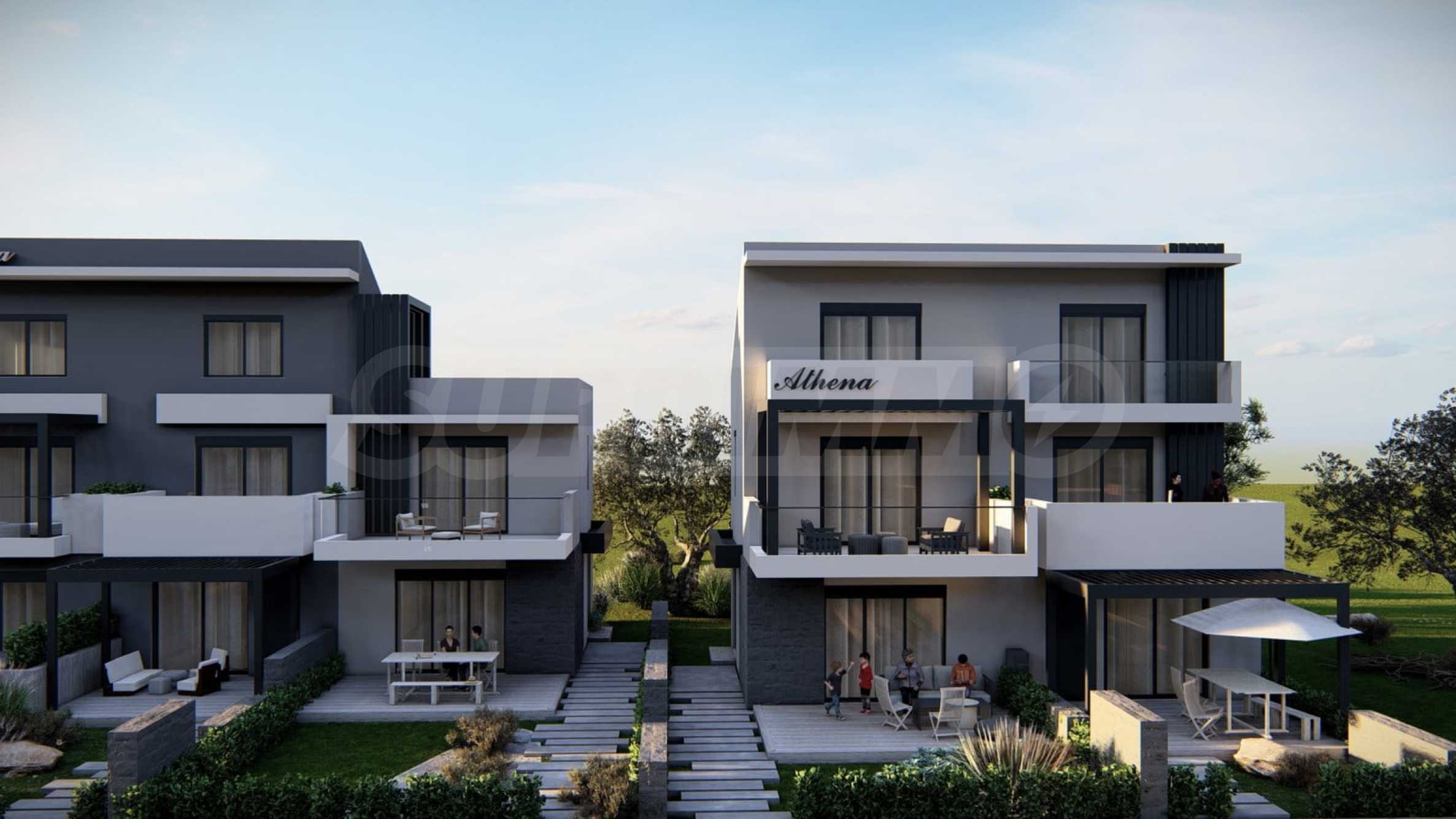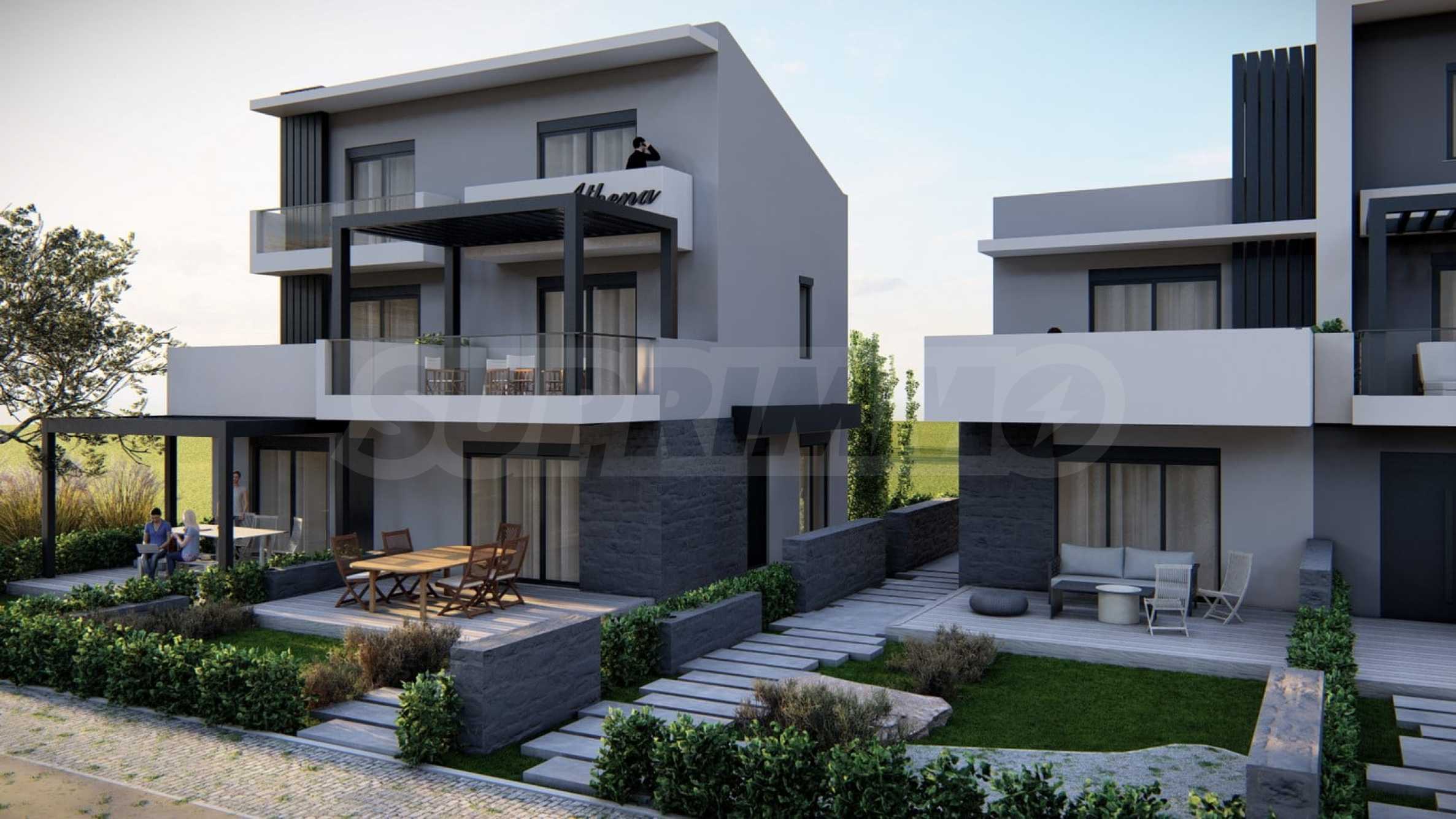 Athena includes 8 luxurious summer residences, with spacious, bright rooms and functional layouts, allowing for privacy and peaceful rest for its residents. The buildings are designed not only to look elegant from the outside, but also to provide outdoor spaces for relaxation and rest in the form of spacious balconies with pergolas and large verandas. The space around the houses is also consistent with the overall concept and is a combination of stone paths and green bushes, giving a finished appearance to the complex.