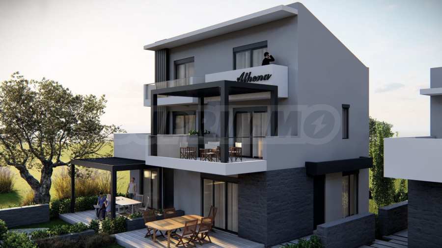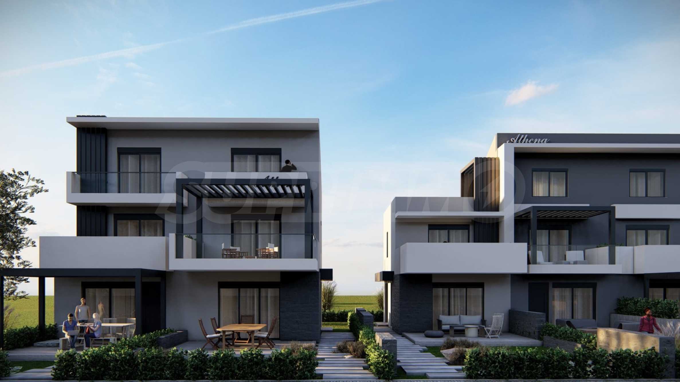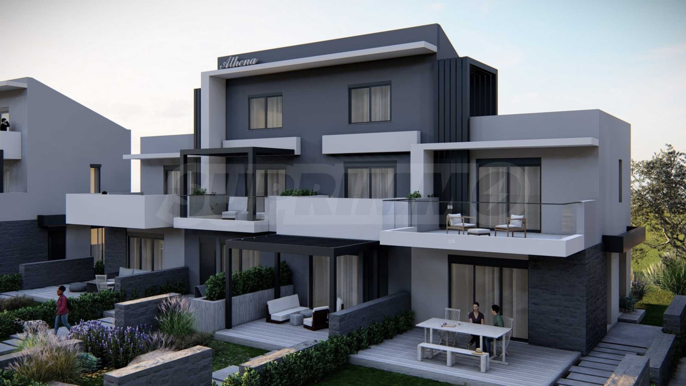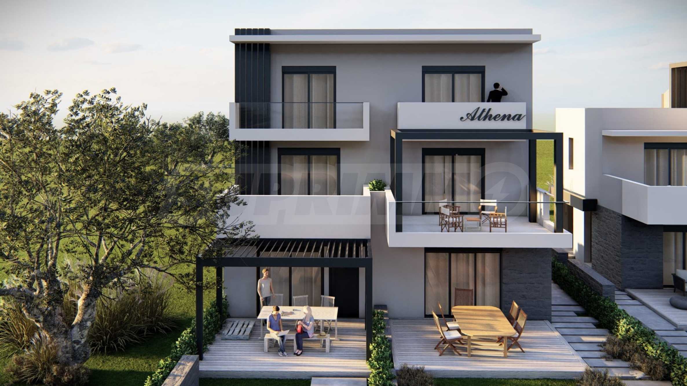 Athena includes 8 luxurious summer residences, with spacious, bright rooms and functional layouts, allowing for privacy and peaceful rest for its residents. The buildings are designed not only to look elegant from the outside, but also to provide outdoor spaces for relaxation and rest in the form of spacious balconies with pergolas and large verandas. The space around the houses is also consistent with the overall concept and is a combination of stone paths and green bushes, giving a finished appearance to the complex.