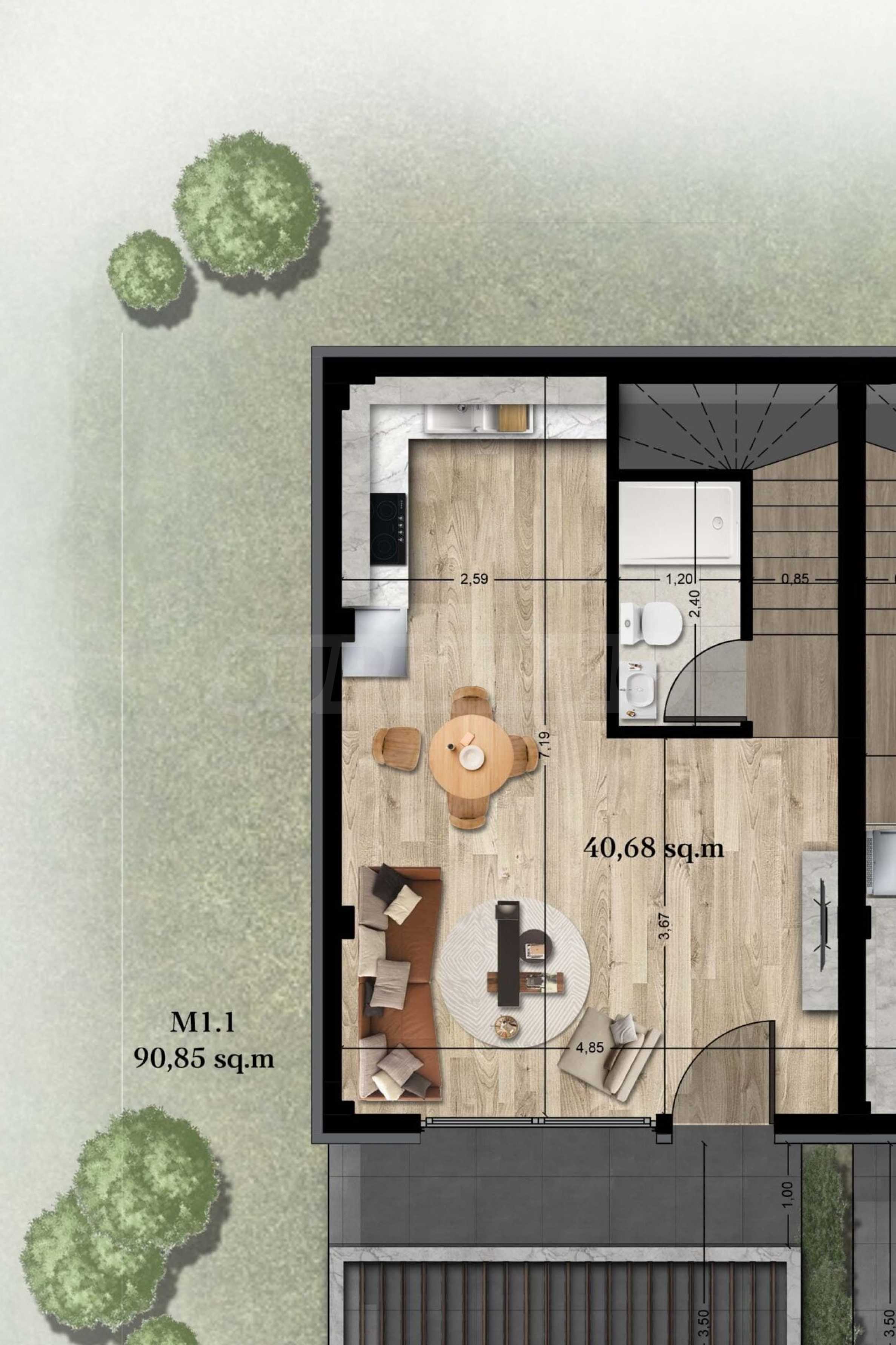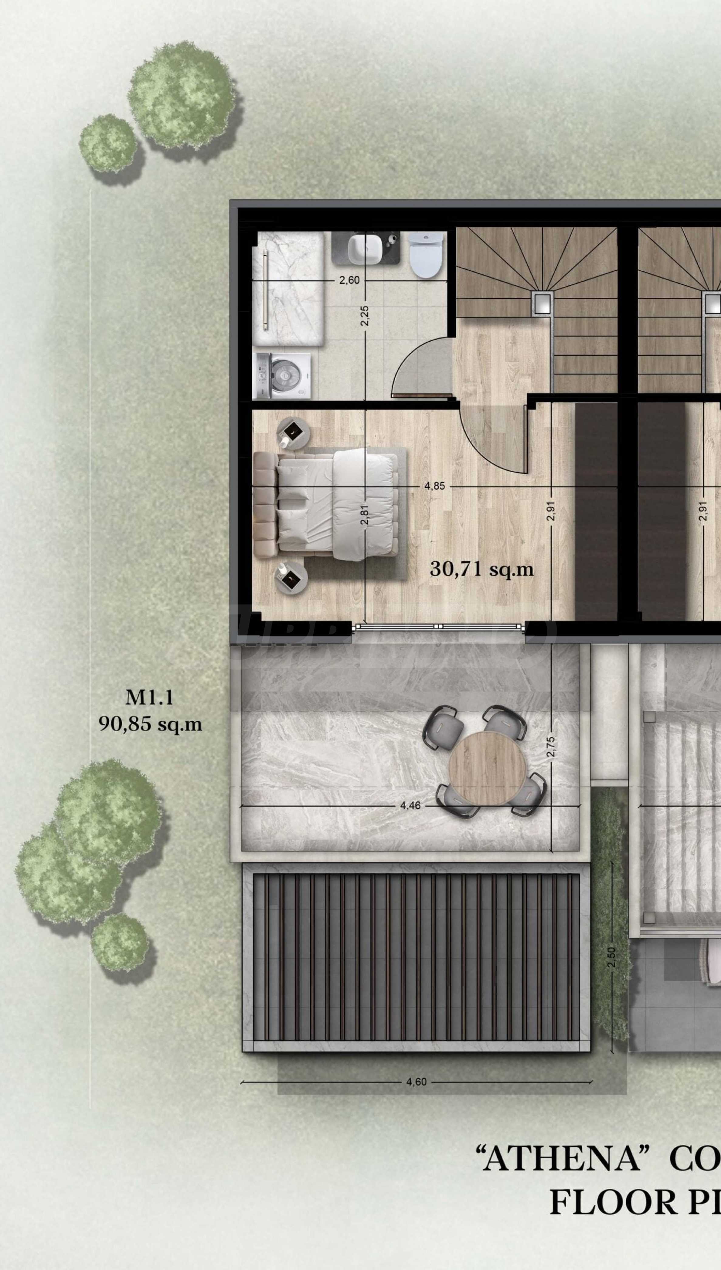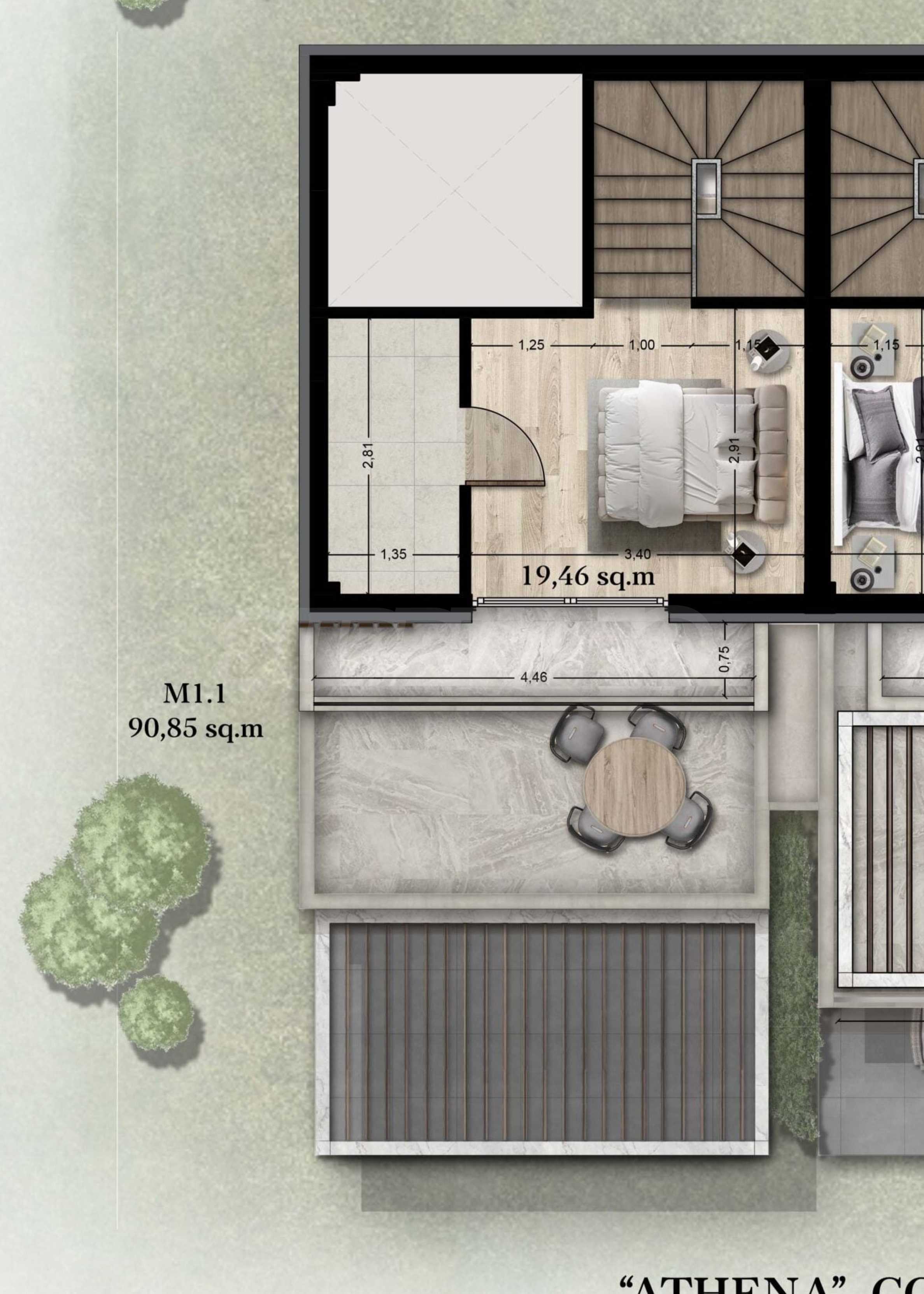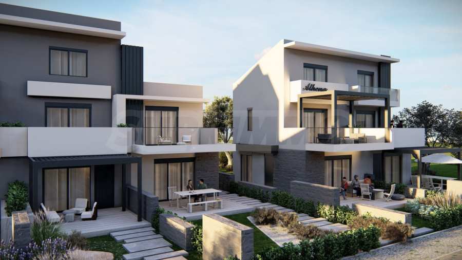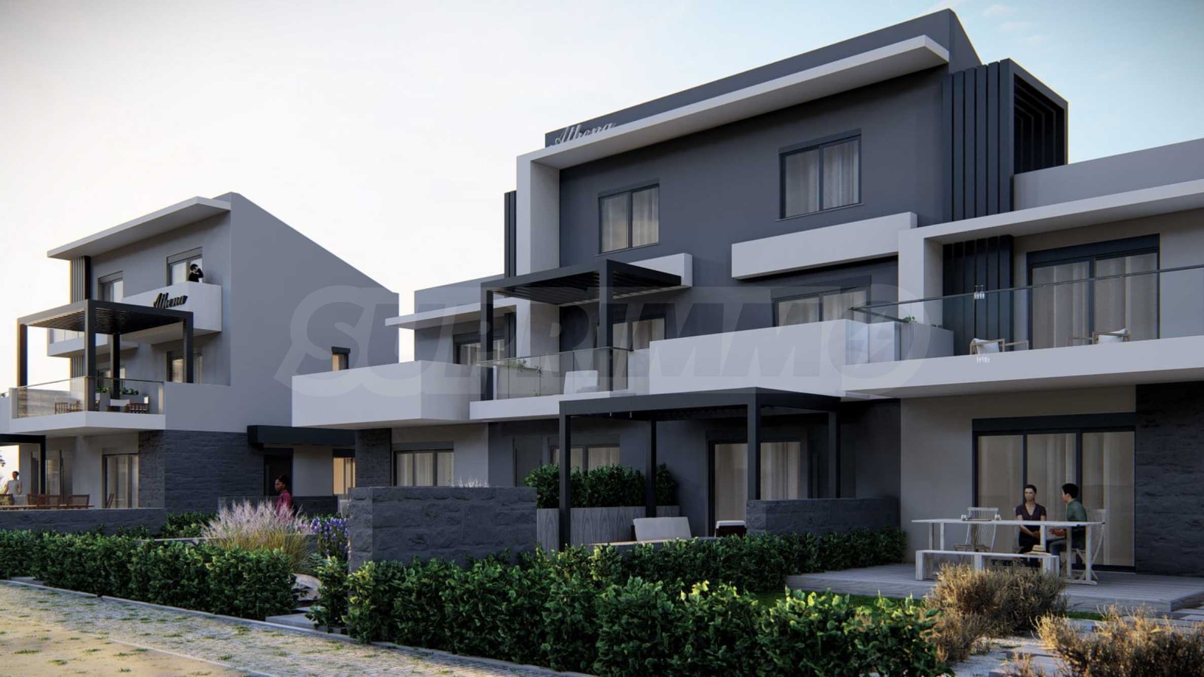 Athena includes 8 luxurious summer residences, with spacious, bright rooms and functional layouts, allowing for privacy and peaceful rest for its residents. The buildings are designed not only to look elegant from the outside, but also to provide outdoor spaces for relaxation and rest in the form of spacious balconies with pergolas and large verandas. The space around the houses is also consistent with the overall concept and is a combination of stone paths and green bushes, giving a finished appearance to the complex.