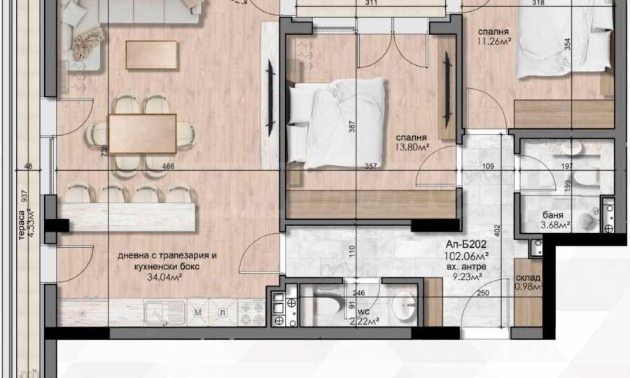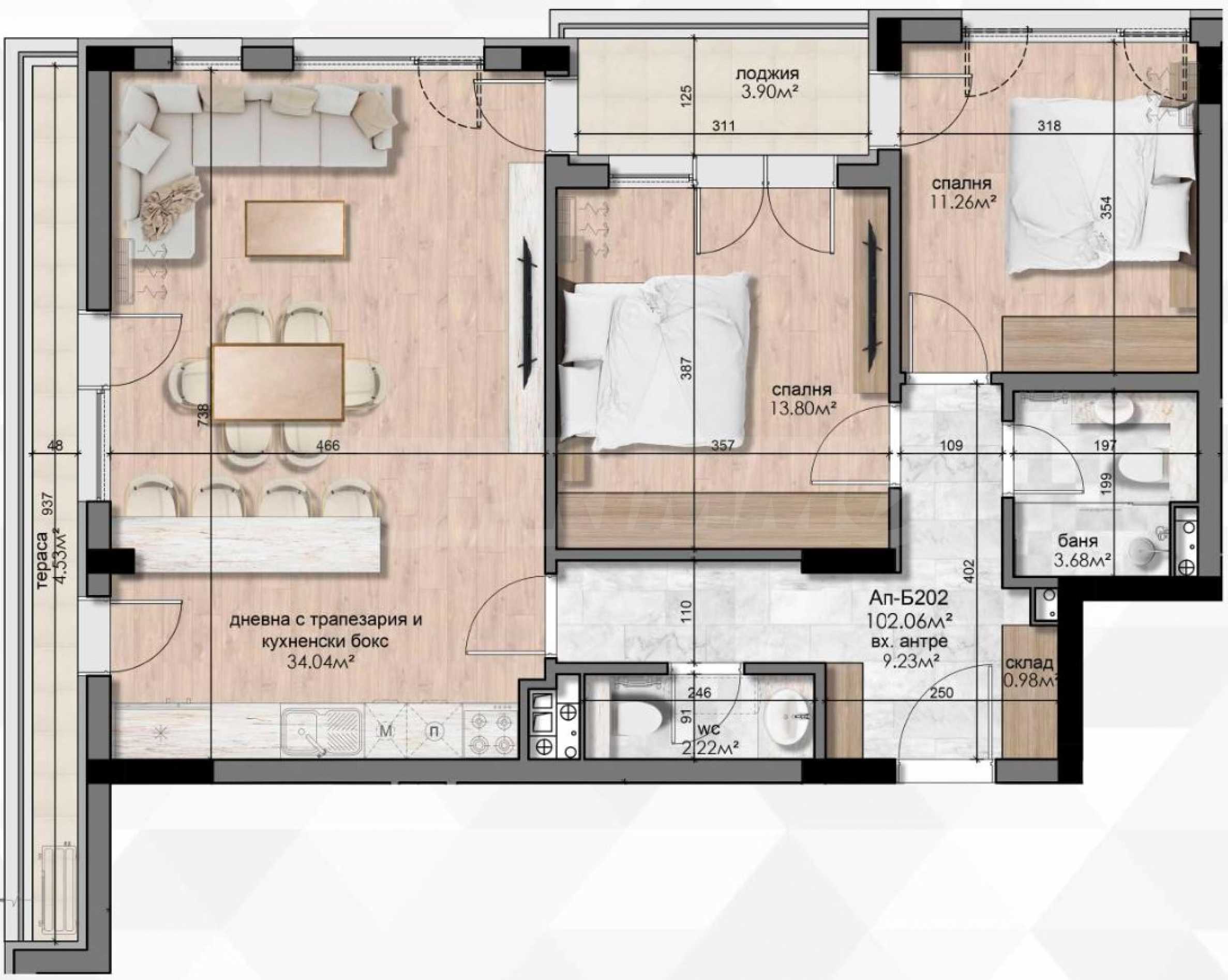 Three-bedroom apartment with a living area of 102.57 m2.