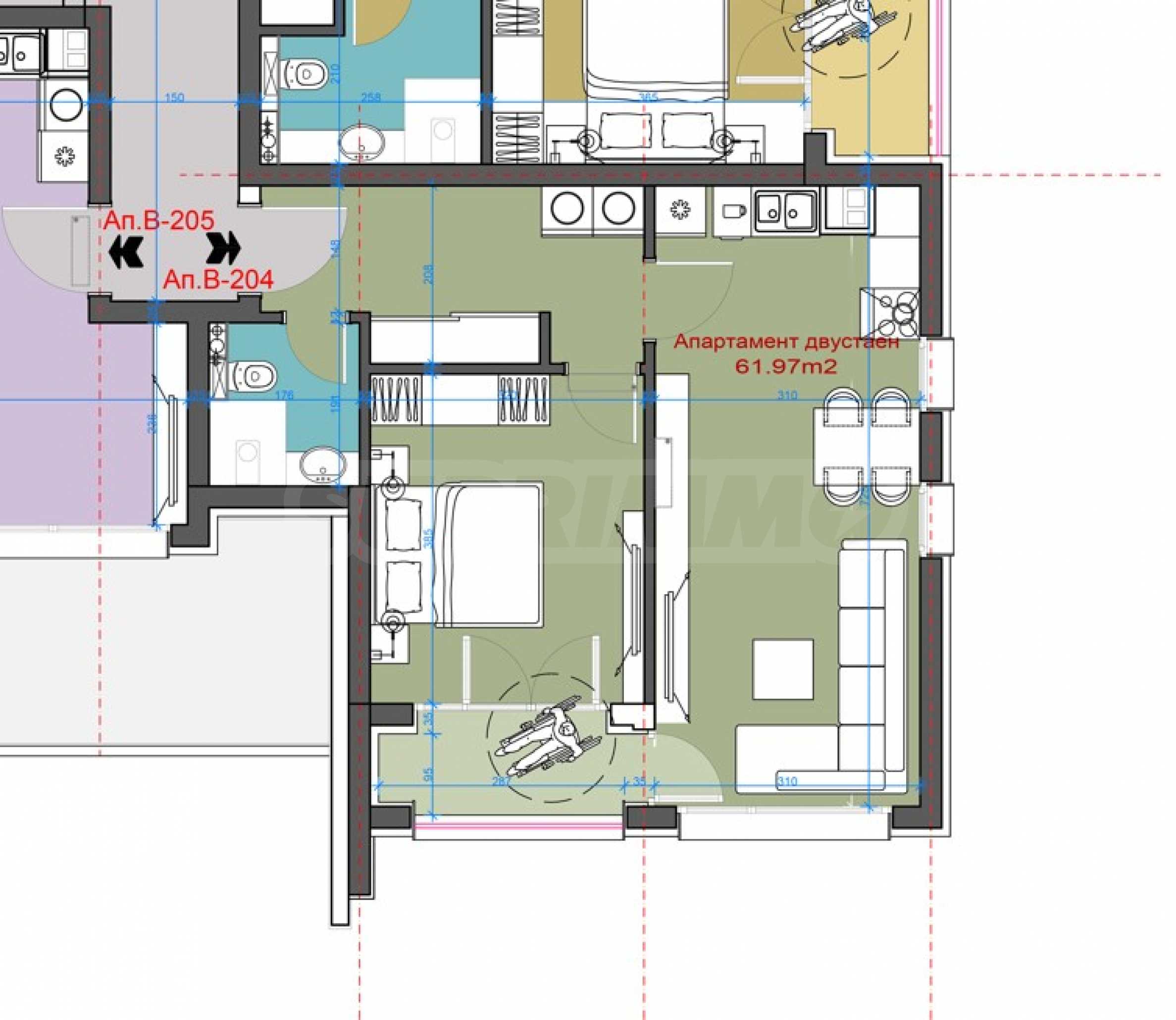 The upcoming new building offers an attractive contemporary ventilated facade with HPL, in the traditional colors of the complex, is distributed over 5 floors with two entrances - "A" and "B", with a modern elevator. It offers a choice of spacious studios, one-bedroom and two-bedroom apartments.