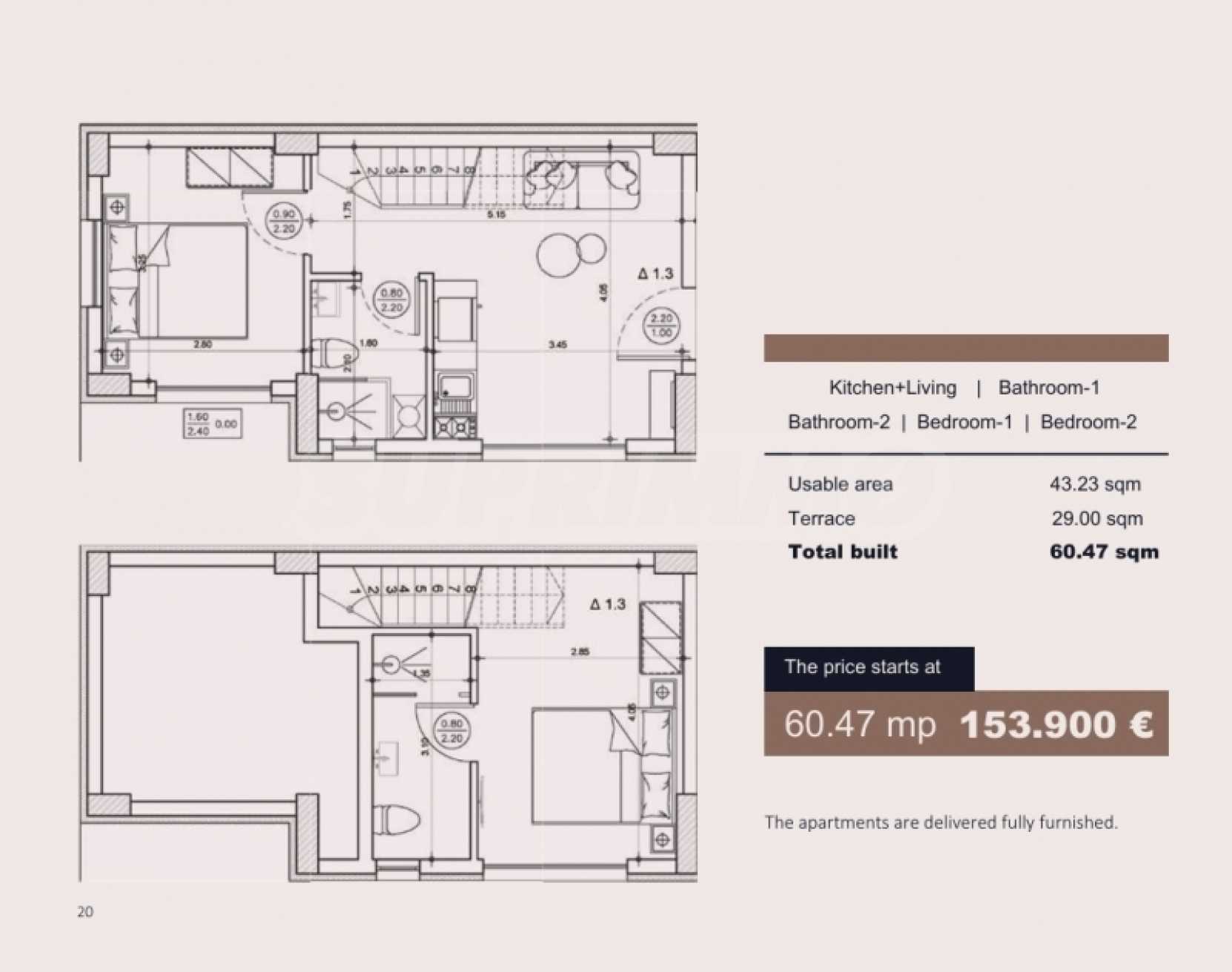 Discover the ultimate holiday or permanent residence experience in this fully equipped apartment, just 130 meters from the beautiful beach of Skala Prinos. The apartment has 60,47 sq.m. of interior space with 2 bedrooms, 2 bathrooms and a living room/kitchen and an additional 29 sqm of terrace, ideal for moments of relaxation and outdoor entertainment. The apartment will be fully equipped with furniture and electrical appliances (except bed mattress and TV).It is located in a sophisticated complex of 12 apartments, offering ideal living conditions with access to a shared swimming pool, which will offer you coolness and relaxation throughout the summer.The apartment is equipped with everything you need for comfortable and modern living, while its location within walking distance from shops, restaurants and the sea, makes it ideal for beach and tranquility lovers.The apartment will be delivered in early JUNE 2025.To show the property it is necessary to present your identity card.