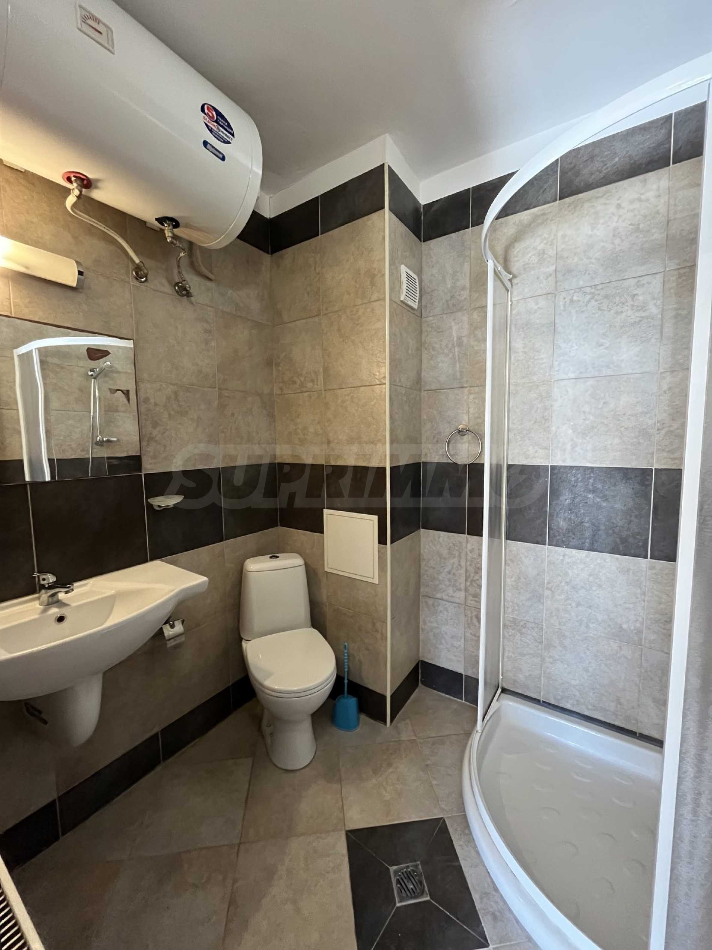 Bathroom with shower cabin and toilet;