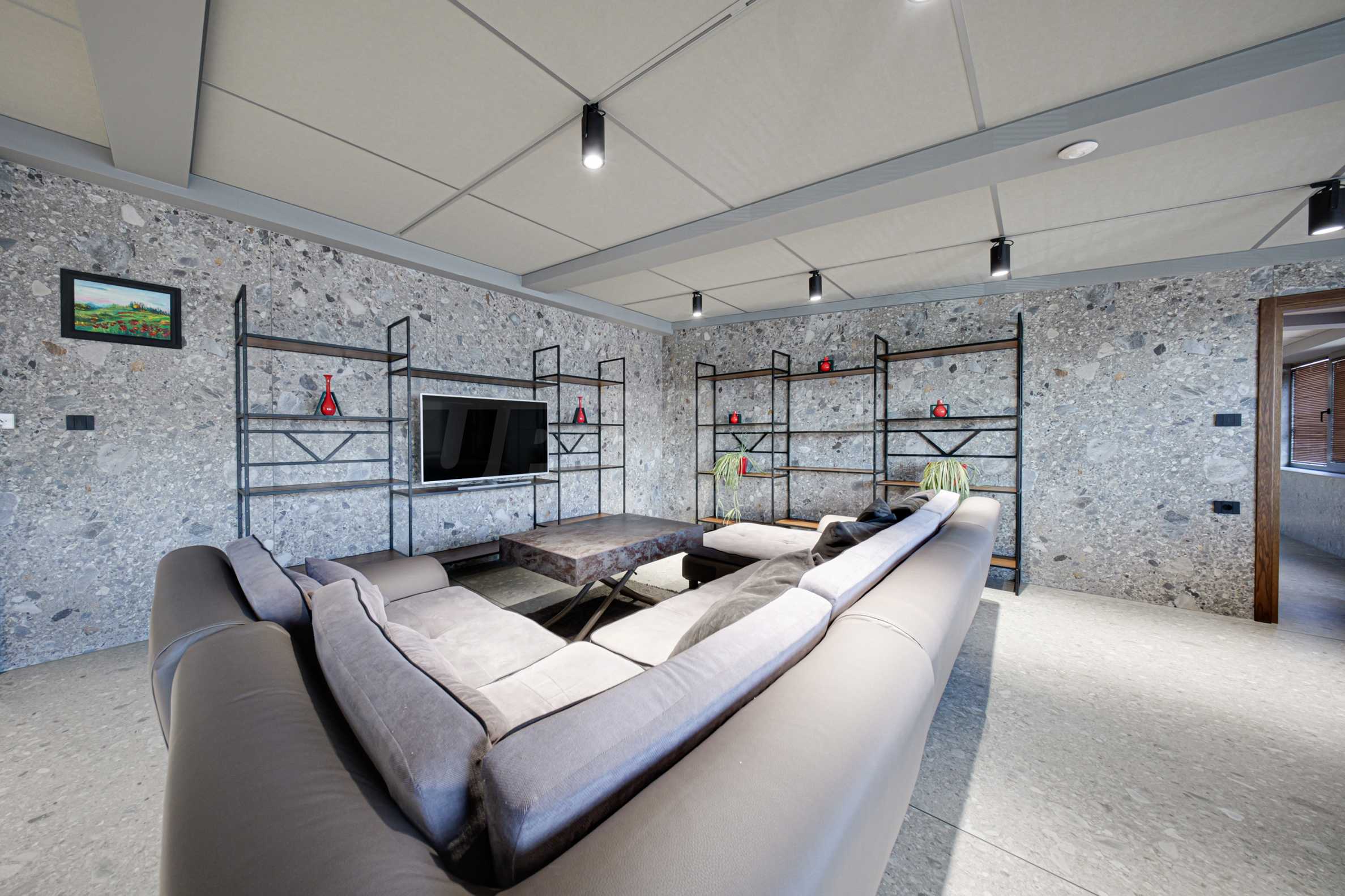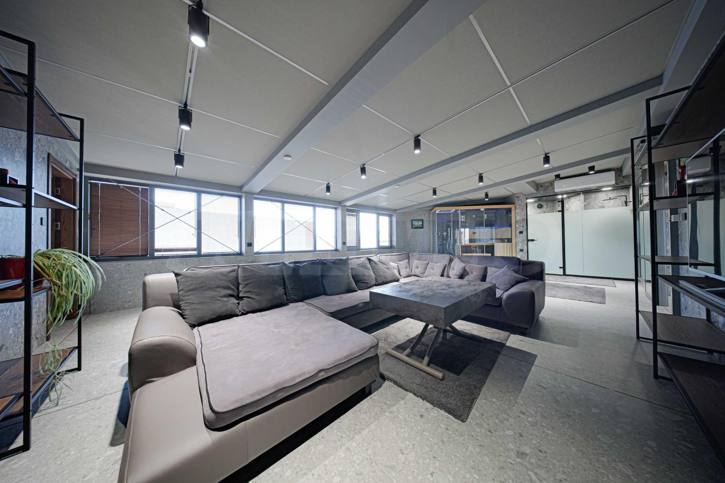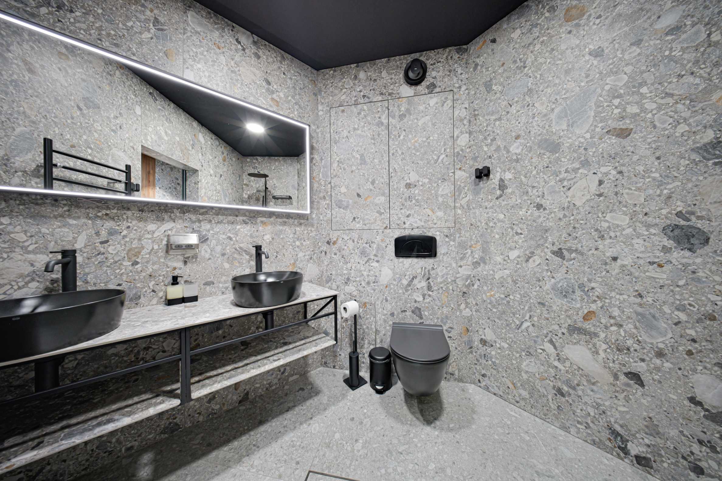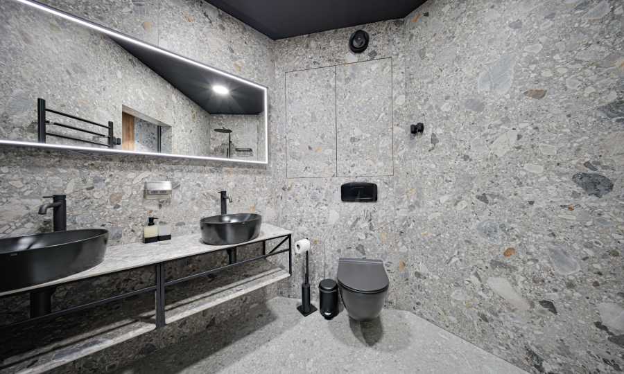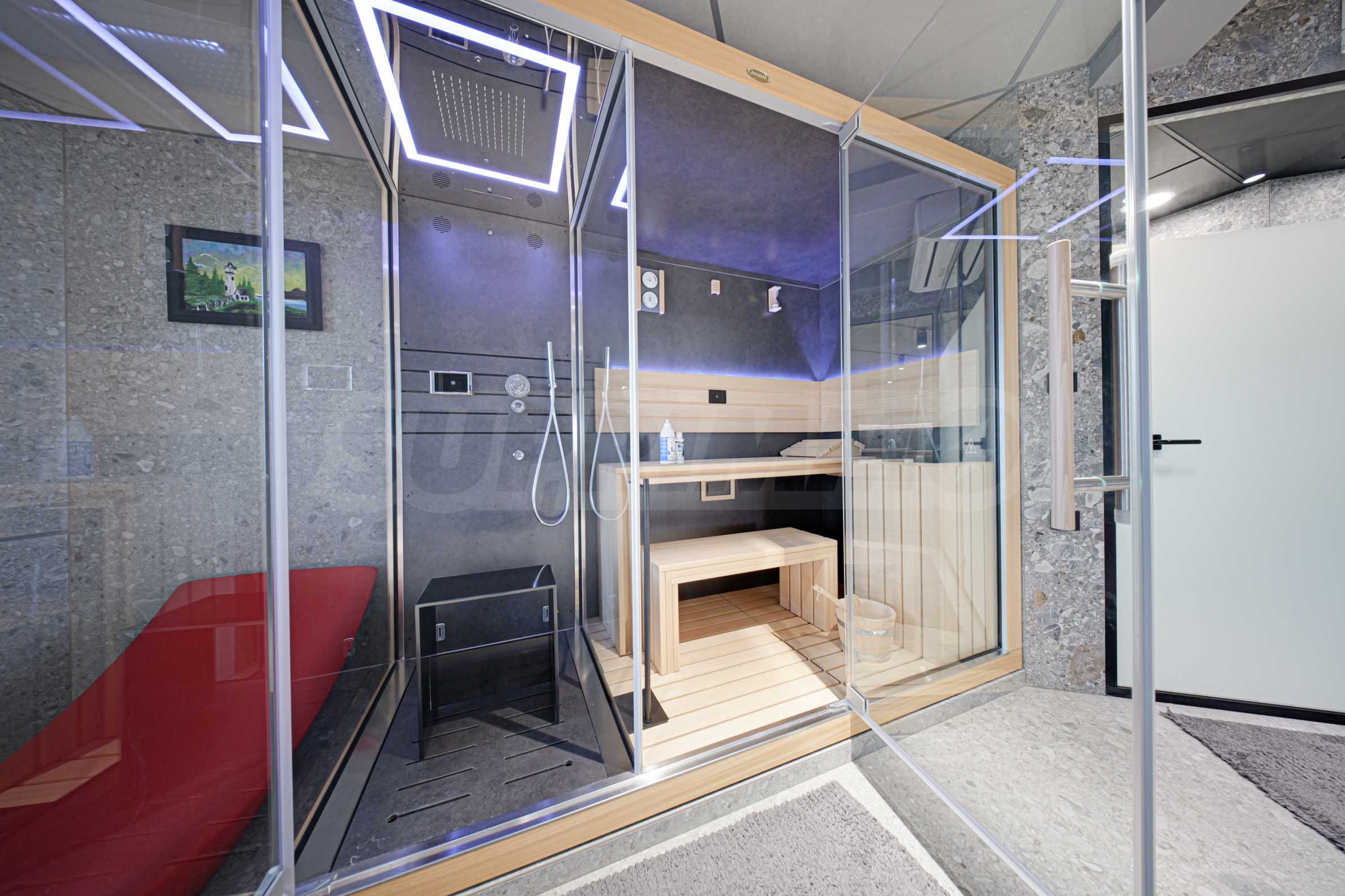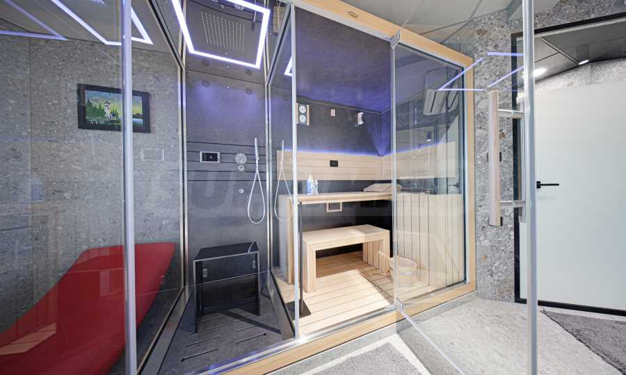 • The living room has an area of 60 sq m and is furnished with luxurious upholstered furniture, a Philips 58" smart TV, a sauna and a luxurious bathroom.