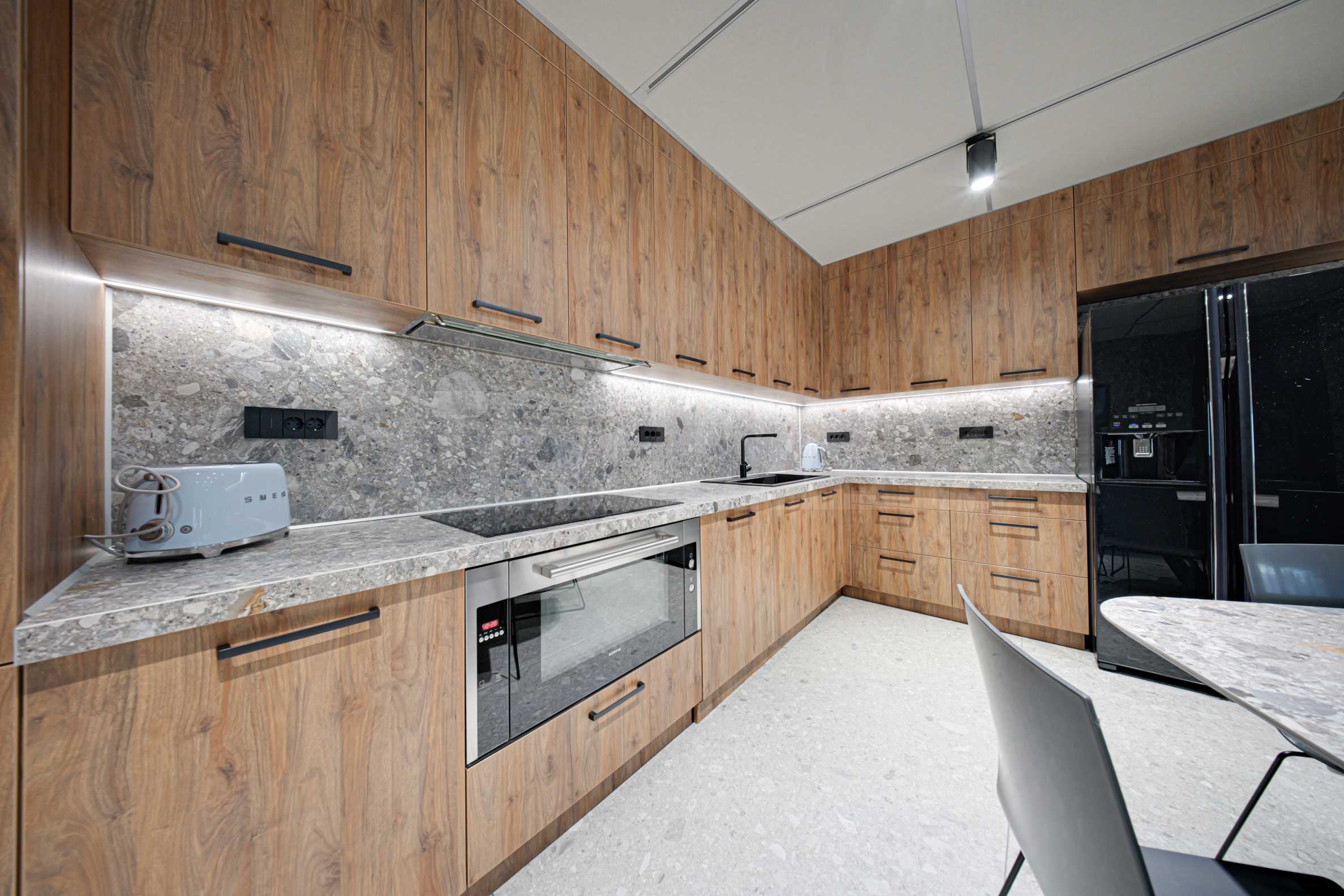 • The kitchen is fully equipped with high-end built-in electrical appliances, a Hitachi double-door refrigerator with water and ice dispenser, a Siemens built-in oven, glass-ceramic hobs, extractor hood, granite sink, Smeg dishwasher, Philips 58” smart TV.