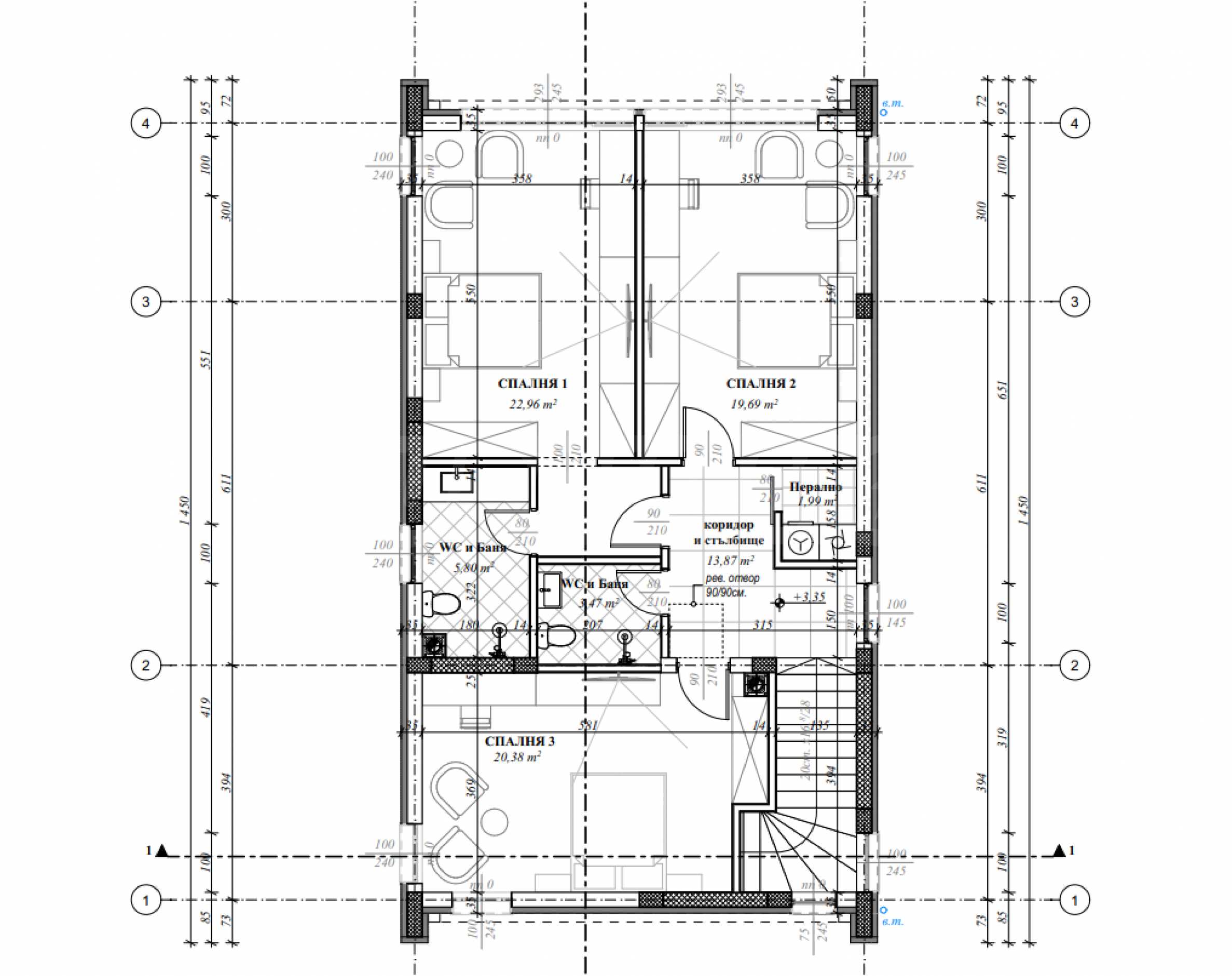 - second floor - corridor, three bedrooms, two bathrooms with toilet, laundry room.