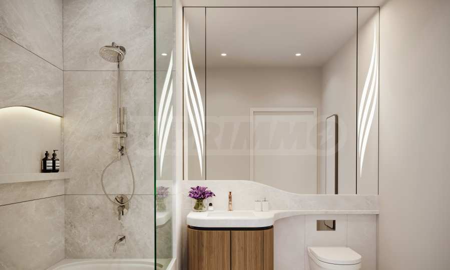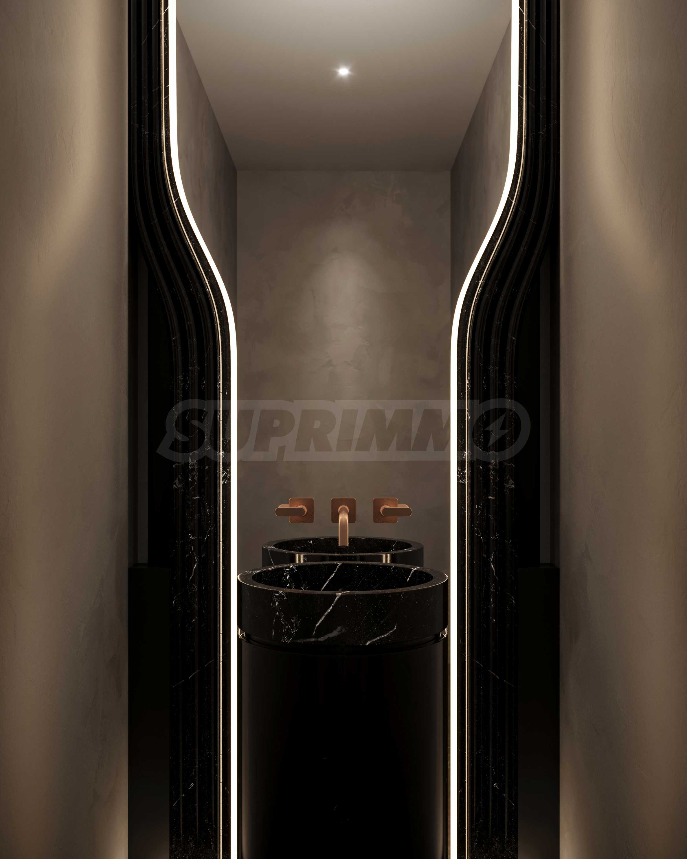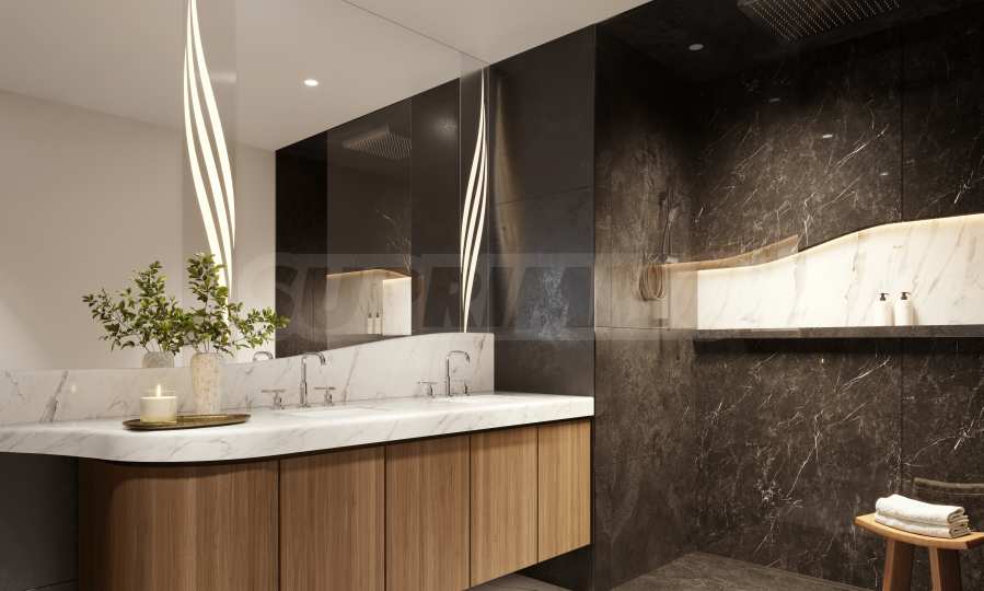 - Black or white stone shower with fully integrated rainshower system and illuminated niche;