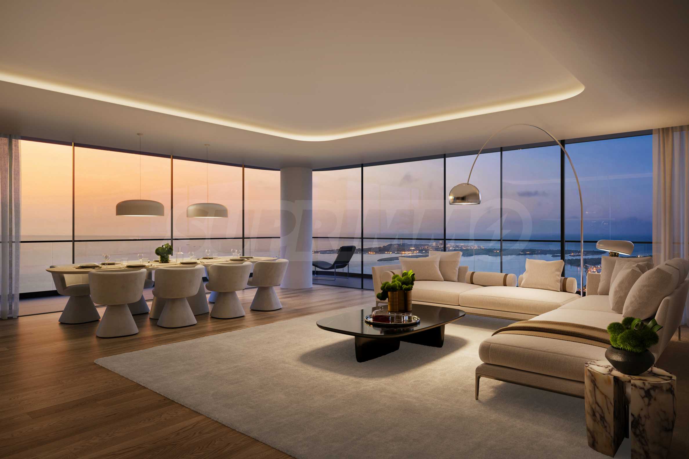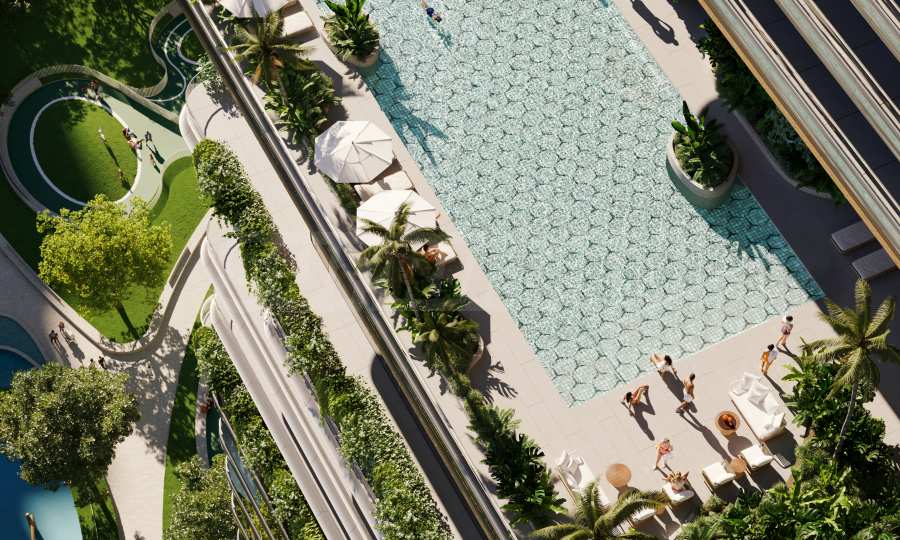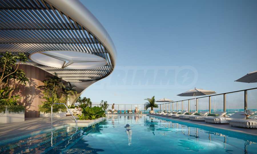 - A swimming pool on the roof of the high-rise tower, from which panoramic views of the cityscape are revealed;
