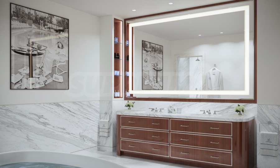 - Master bathrooms feature stand-alone tubs and showers with glass partitions, vanities with premium Italian cabinetry, imported stone countertops, and backlit mirrors;