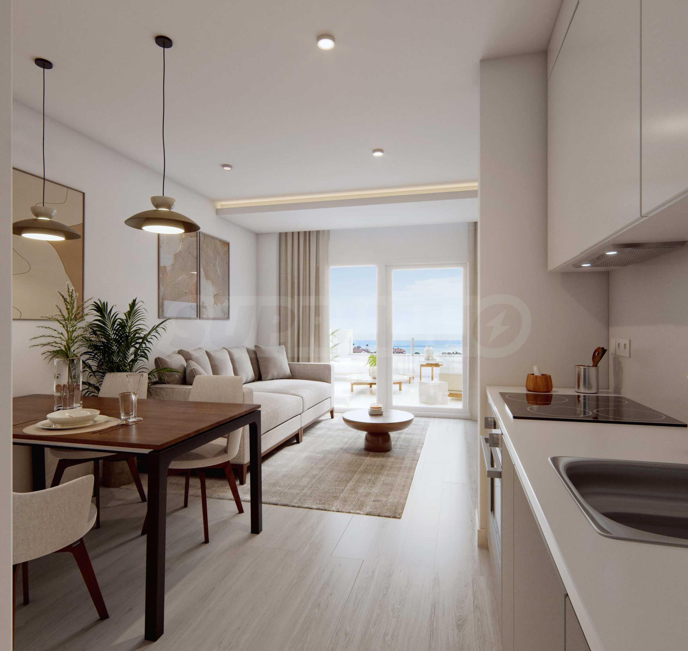 The apartments and penthouses feature a fully equipped kitchen with an open plan connecting the dining and living areas. Each property also includes a storage room and a parking space.