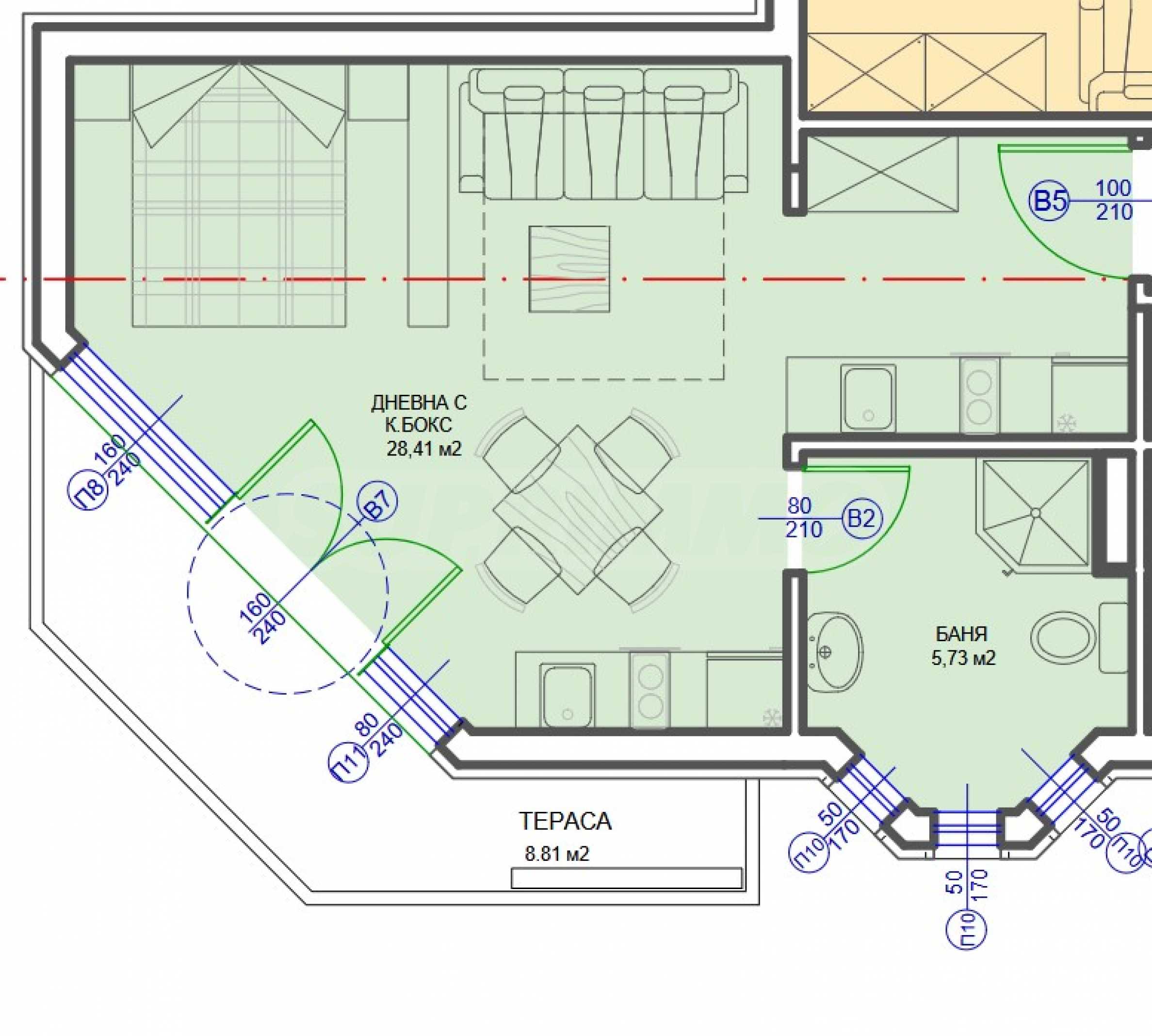 The apartment has a pleasant view of the sea. It is being let in a state of completion according to Bulgarian Construction Standards, with plaster and screed.