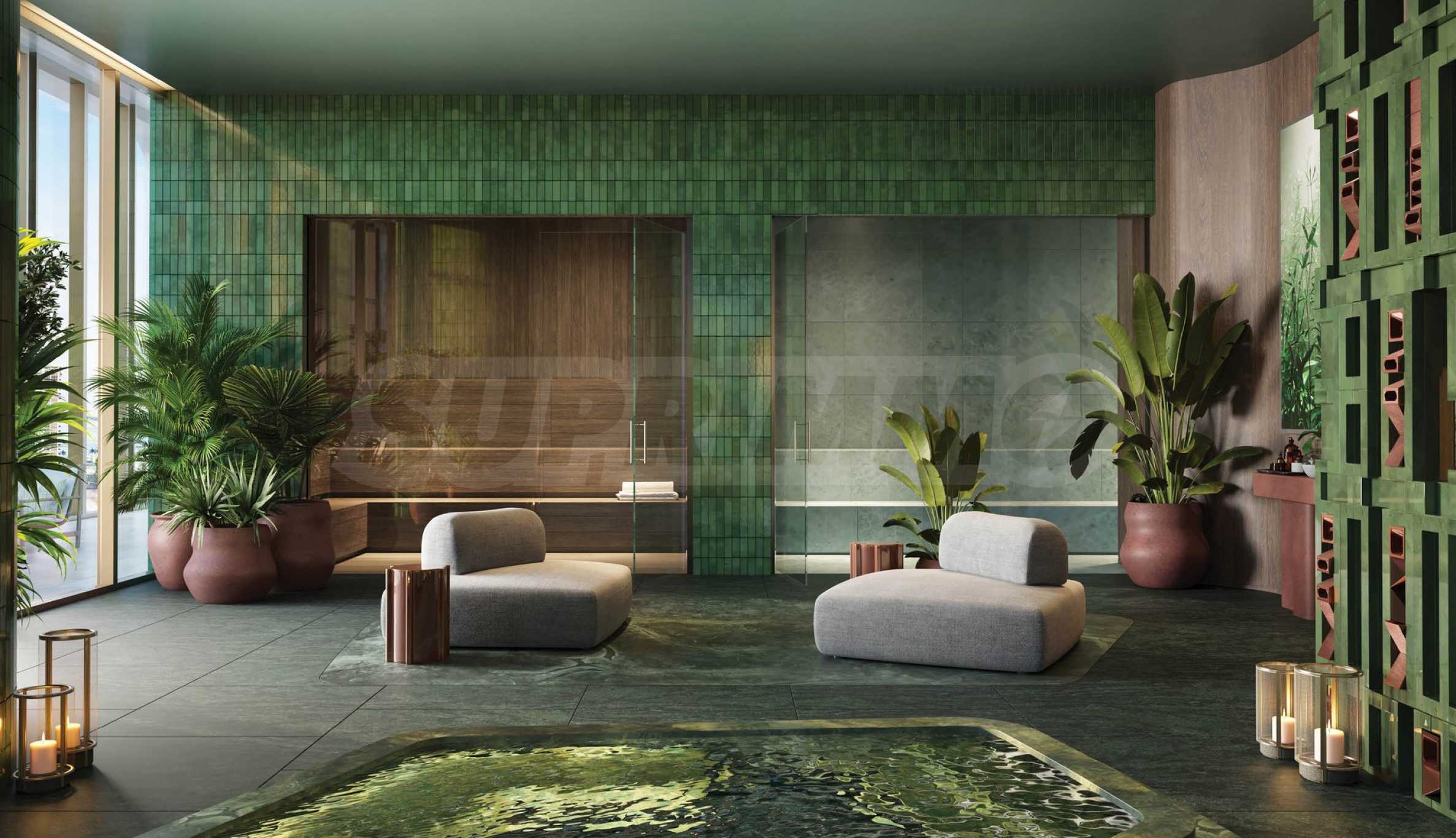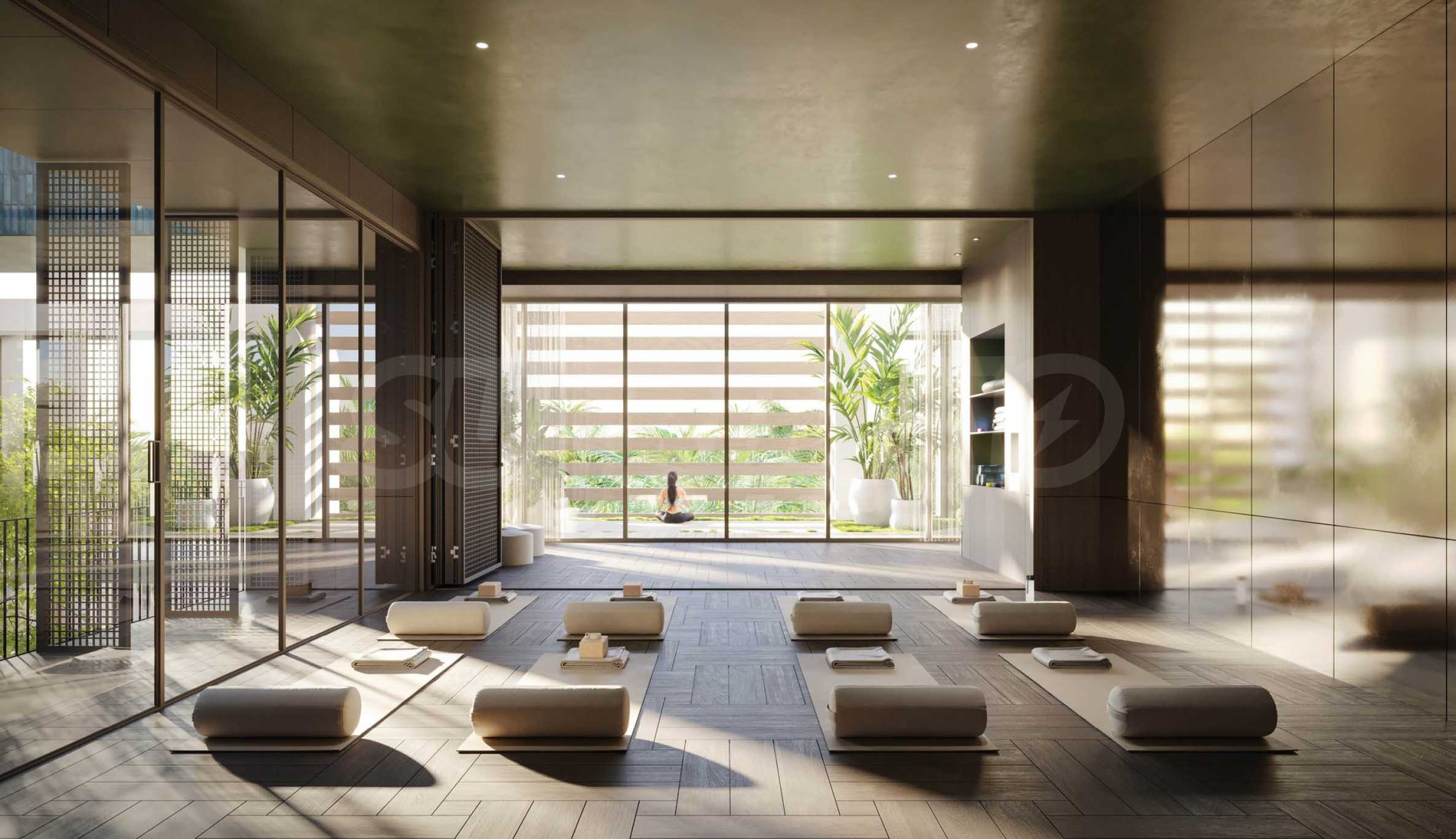 For those who prefer to work from home, the complex offers shared office spaces, a room for recording podcasts or video content, as well as a multifunctional room for various events. If you want to unwind with relaxing treatments, a fully equipped spa center is at your disposal, including semi-open rooms in the garden, suitable for massages. For sports enthusiasts, a gym, a squash court, as well as cardio and yoga rooms are provided.